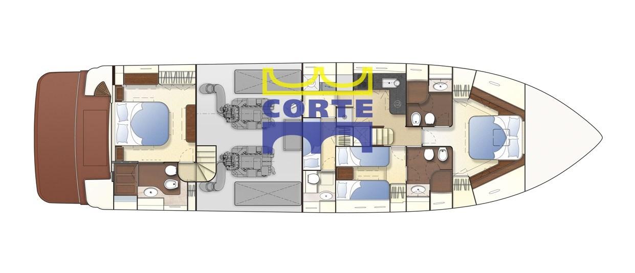 Engine Alarm, Bilge Alarm, Water pressure pump, Teak Side Decks, Special Colour, Deck Shower, Twin Steering, Directional Spotlight, Hydraulic Flaps, Fire Extinguishing System, Flaps Indicators (sul fly), Courtesy Lights (camminamenti laterali), Underwater lights (sotto la plancetta di poppa), Gangway (elettroidraulica a scomparsa), Platform (poppa in teak con tender lift), Automatic Bilge Pump, Entry door, 2 Side door, Teak Cockpit, Shorepower connector, Water harbor connector system, Electric Windlass, swimming ladder, Stabilizers (giroscopici Mitsubihi), cockpit table (con vano per 4 sedie), Horn, 2 Stern Winches, Bow Winches.