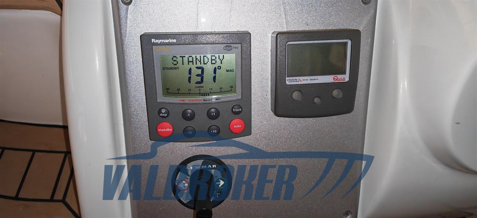 Rudder angle indicator, Electronic engine control, Chain counter (Quick), Depth Sounder (Furuno), GPS (Geonav), Autopilot (Raymarine), VHF Radio (Furuno).