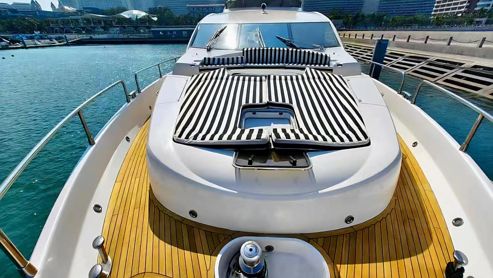 Teak foredeck, with sundeck area with large sundecks, a comfortable seat and adjustable table