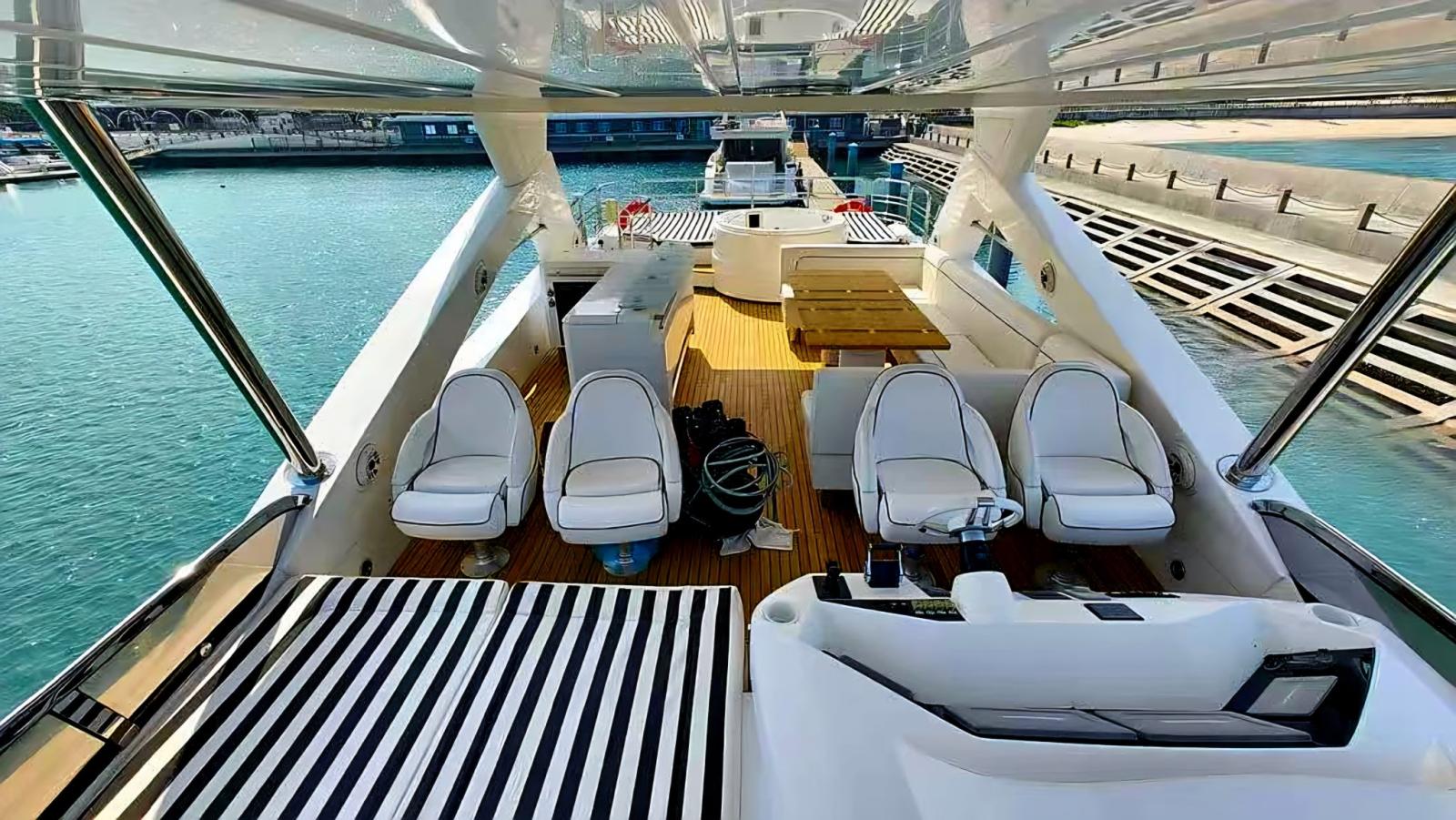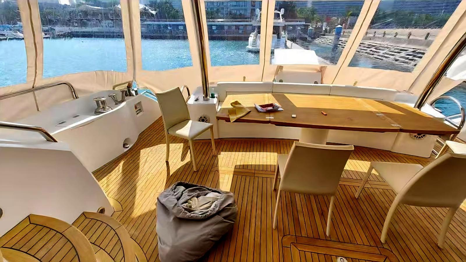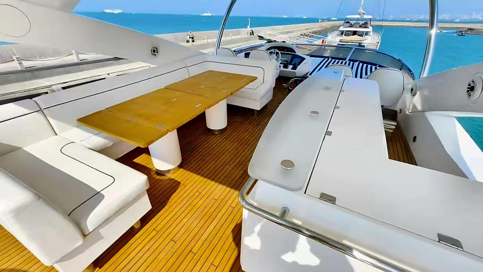 Very large teak flybridge, with helm station with 4 seats, sundeck, corner bar, dining area and a relaxation area aft with sundeck and Jacuzzi