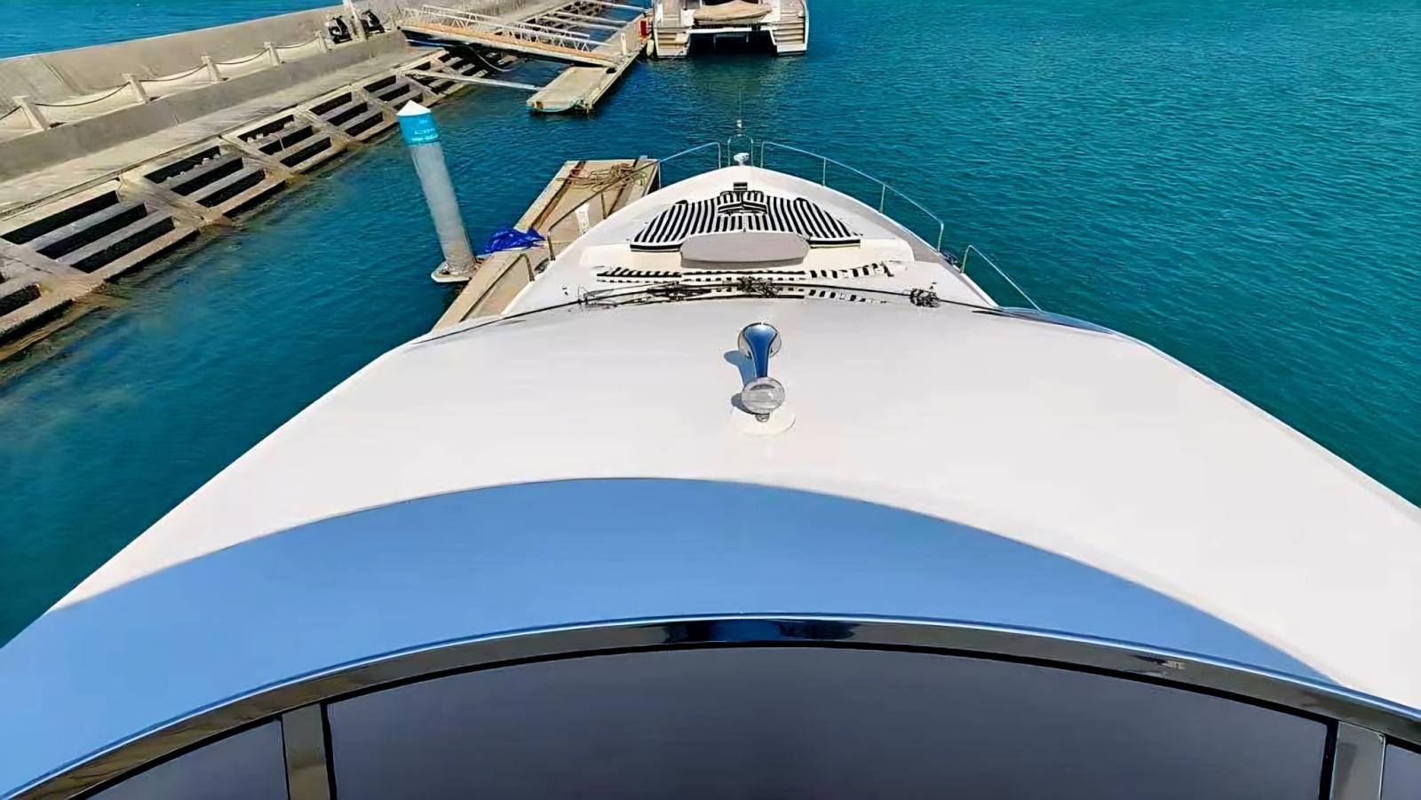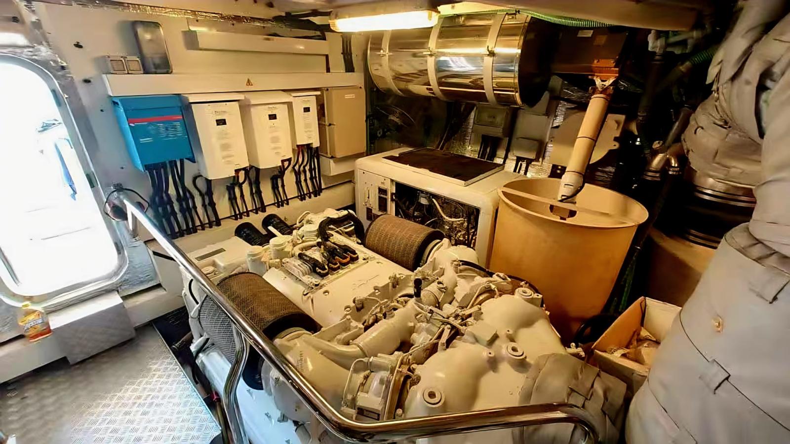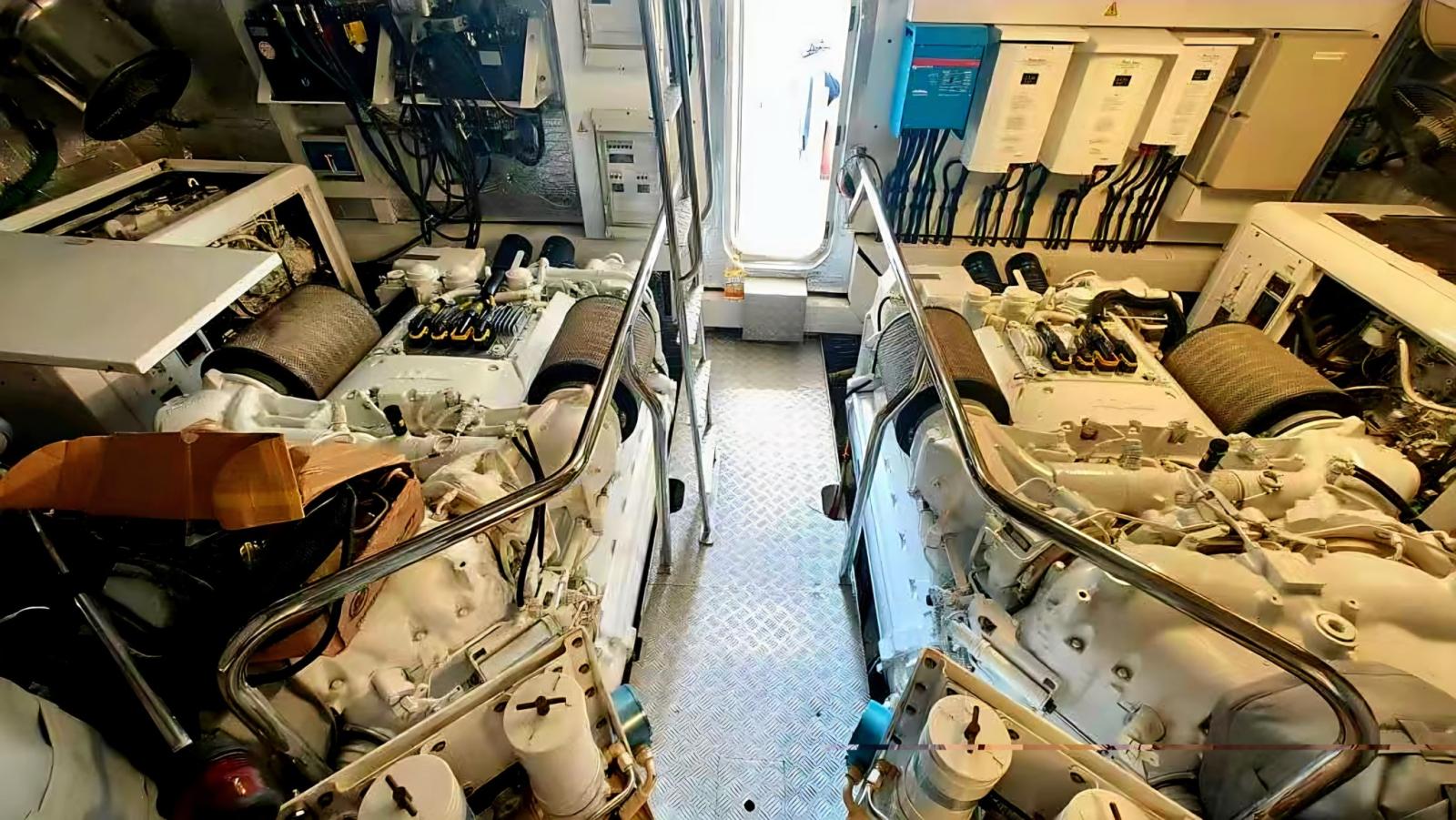 Fume/Gas Detector, Engine Alarm, Bilge Alarm, Alternator, Water pressure pump, Teak Side Decks, Deck Shower, Twin Steering, Hard top, Courtesy Lights, Battery Monitor, Gangway (IDRAULICA A SCOMPARSA), Platform (AFFONDANTE IDRAULICA), Automatic Bilge Pump, Teak deck, Entry door, Teak Cockpit, Shorepower connector, Water harbor connector system, Electric Windlass, swimming ladder, Saddles for tender, Stabilizers (PINNE), cockpit table, Horn, Stern Winches, Bow Winches.