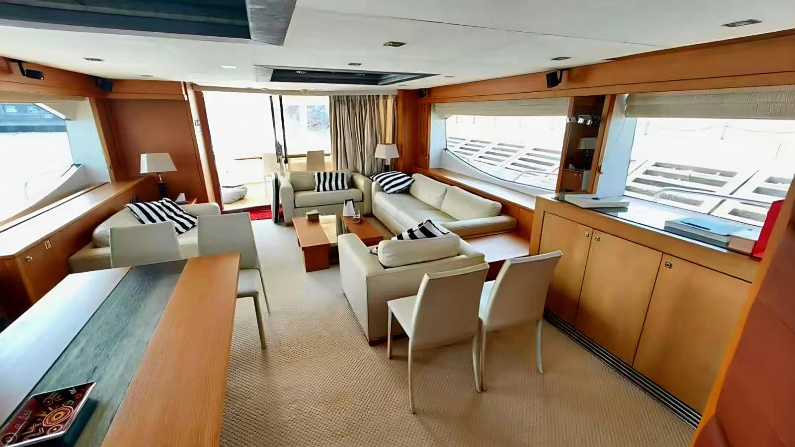 Large and bright lounge with 3 light leather sofas, coffee table, opposite sofa, a separate dining area and well equipped kitchen positioned near the wheelhouse
