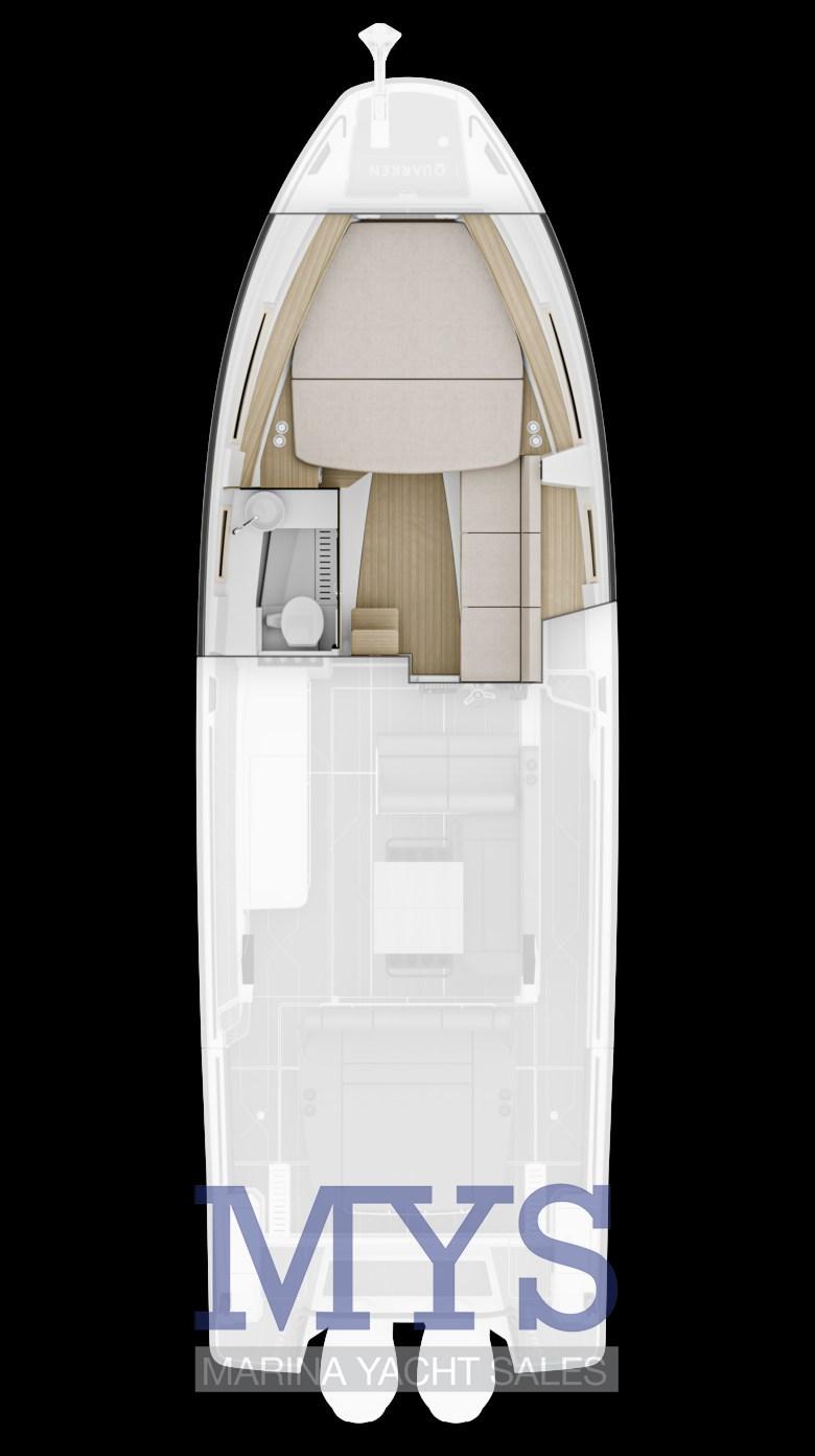 Open plan cabin in the bow with double bed