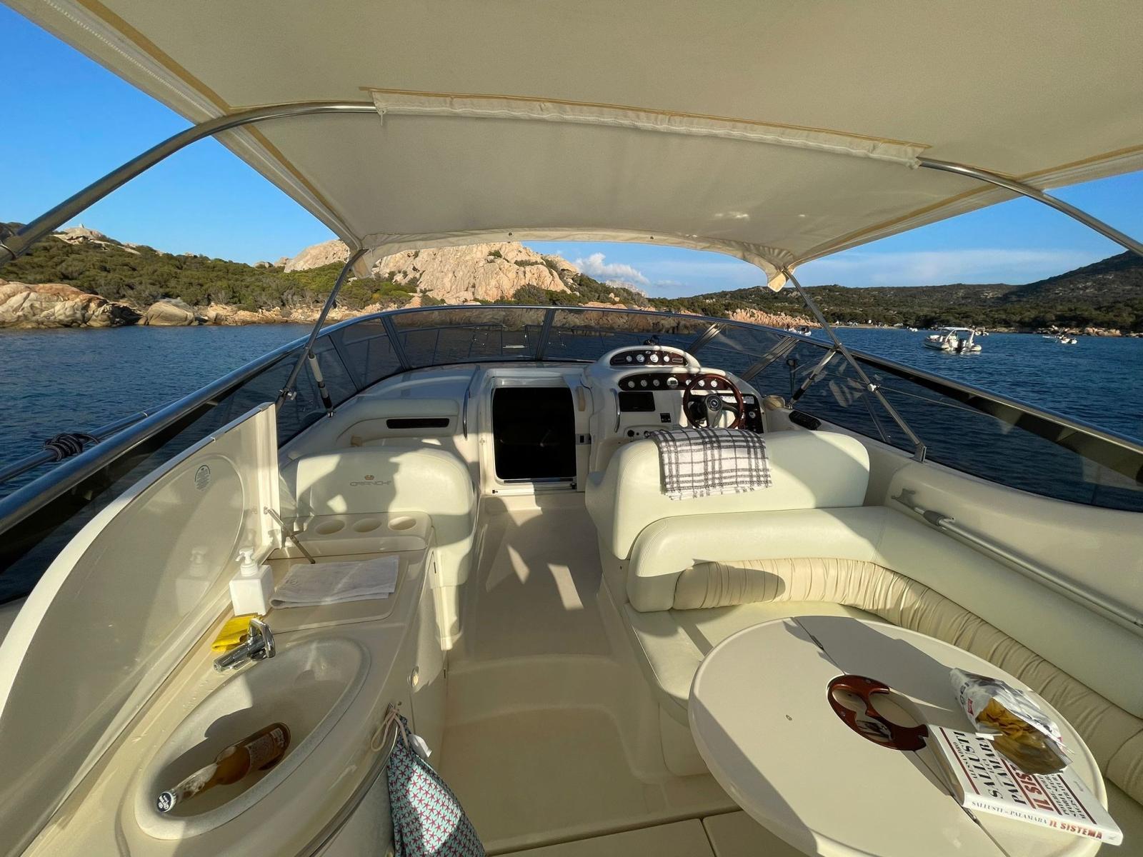 Fume/Gas Detector, 2 Engine Alarm, Bilge Alarm, Electric Engine Compartment Opening, Water pressure pump, Shore power cable, Special Colour (blu navy), Guard rail, Deck Shower, Electric Flaps, Tender Garage (Elettroidraulico), Fire Extinguishing System, 2 Flaps Indicators, Washbasin in the cockpit, Courtesy Lights, Fenders, Platform, Automatic Bilge Pump, Entry door, Shorepower connector, Voltage Rectifier, Rollbar, Electric Windlass, swimming ladder, Saddles for tender, cockpit table, Living Room Foldable Table, Tender (Eurovinil 2M + fb Honda 2.5hp), Horn, Bow Winches.