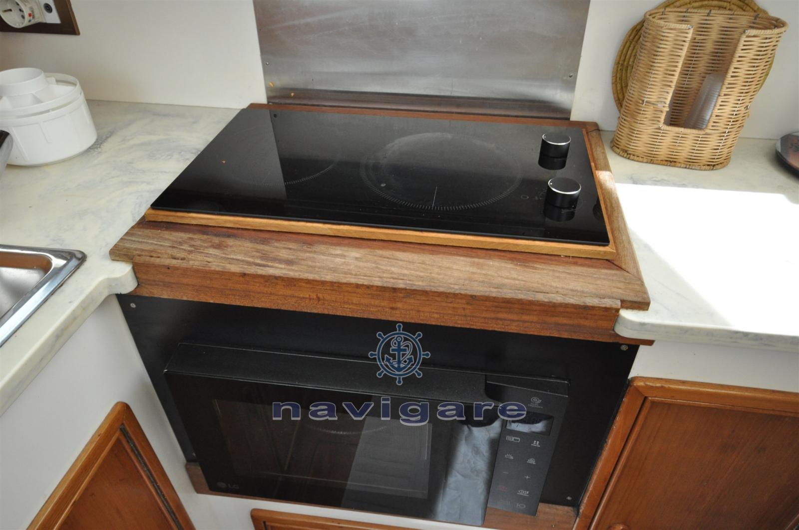 Cabin with forward V-bed, Separate guest cabin, Separate bathroom. Kitchen worktop (new 2023 induction burners) furnished in a U-shape with sink and oven, Large living room with double sofa. Large cockpit with tuna-door for exit to the stern platform