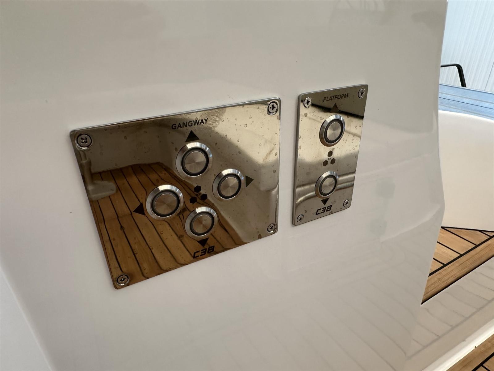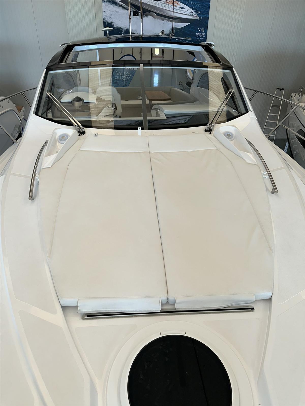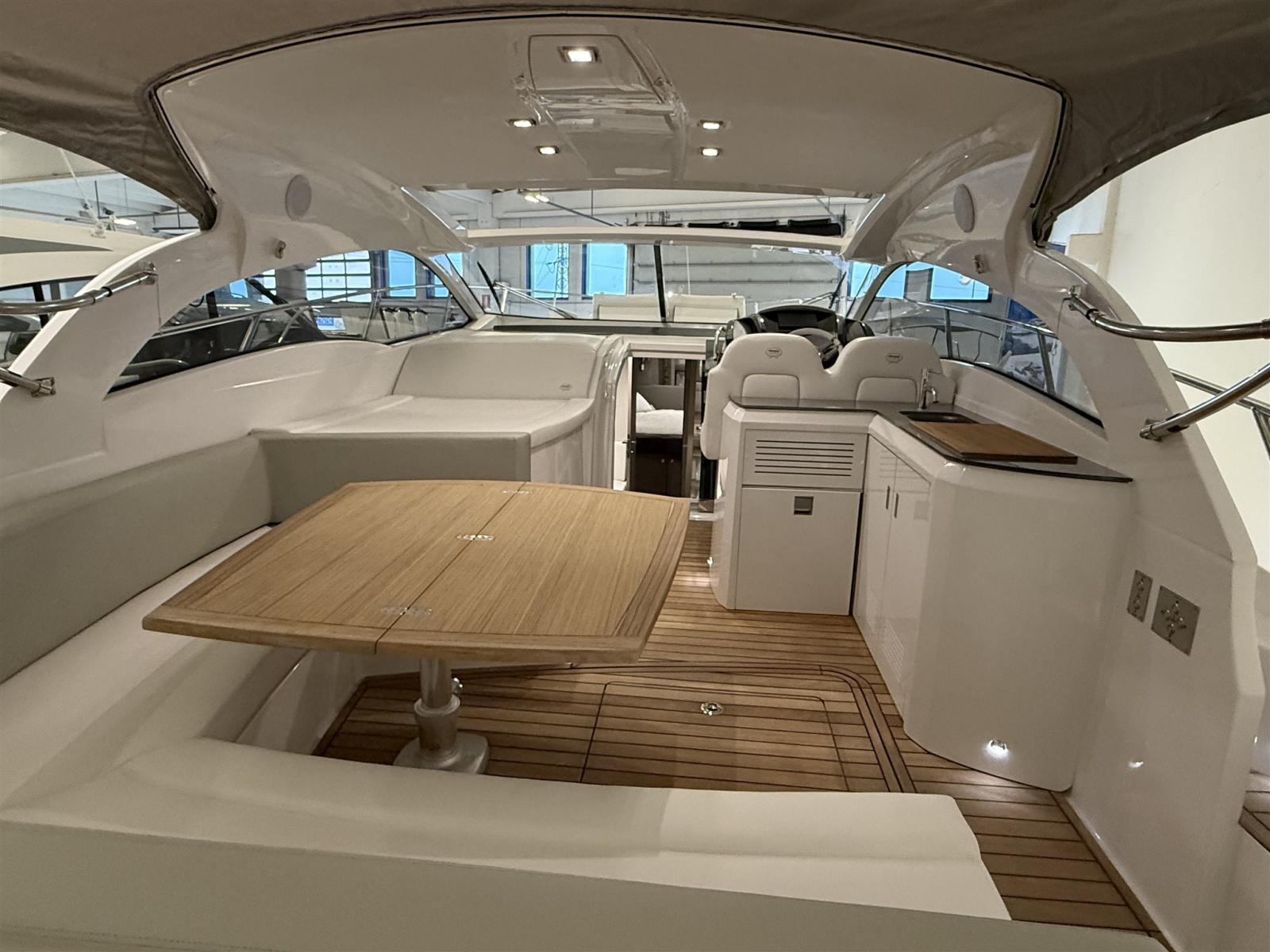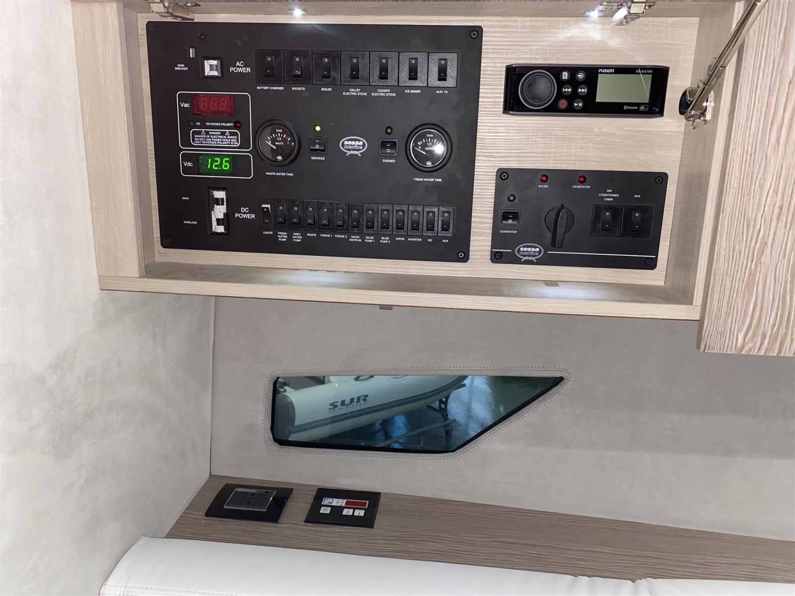 Engine Alarm, Bilge Alarm, Electric Engine Compartment Opening, Water pressure pump, Deck Shower, Electric Flaps (Zipwake), Hard top, Fire Extinguishing System, Flaps Indicators, Washbasin in the cockpit, Courtesy Lights, Gangway (idraulica a scomparsa), Platform (affondabile idraulica), Automatic Bilge Pump, Teak Cockpit, Shorepower connector, Electric Windlass, swimming ladder, cockpit table, Living Room Foldable Table, Horn.