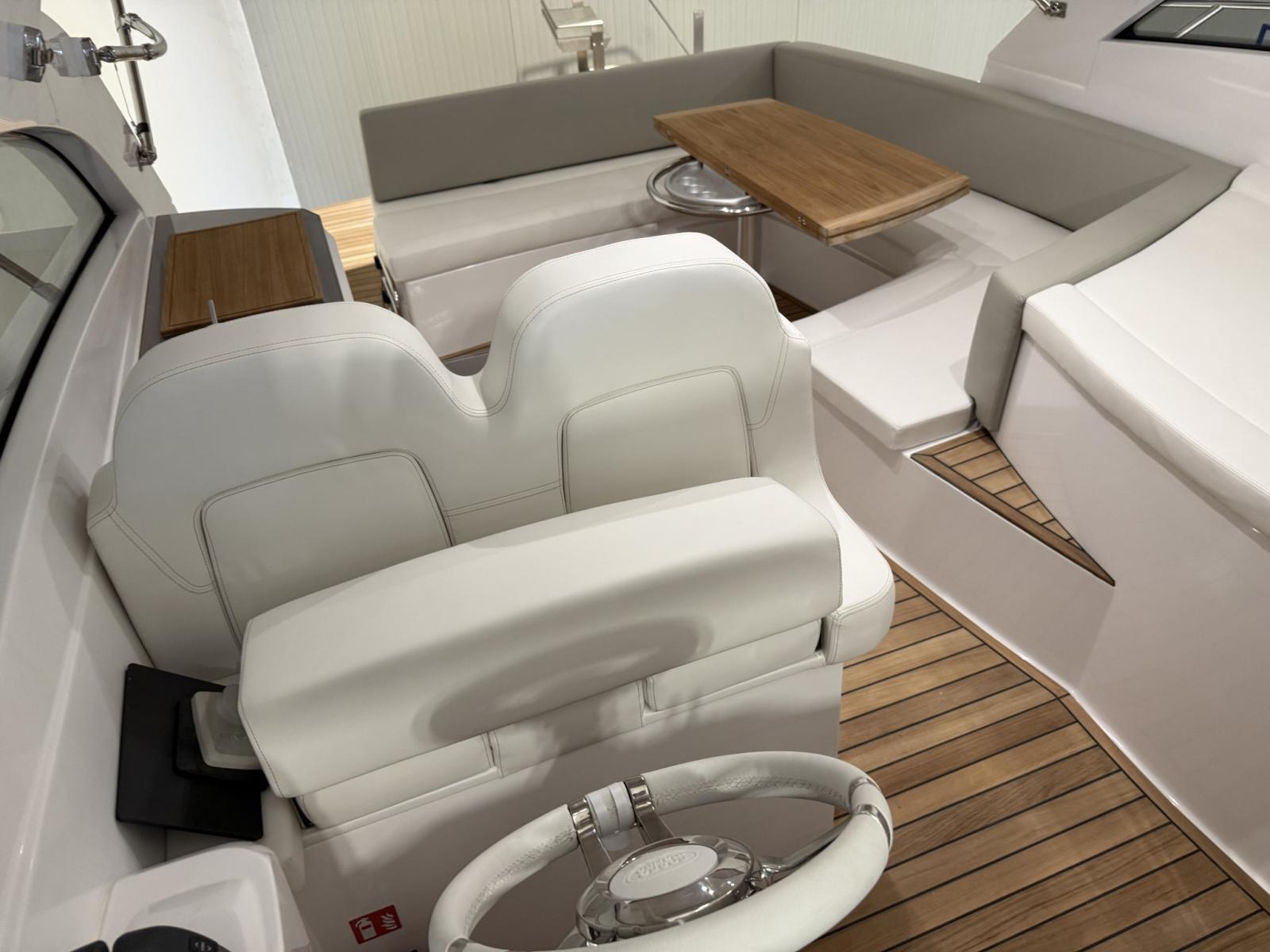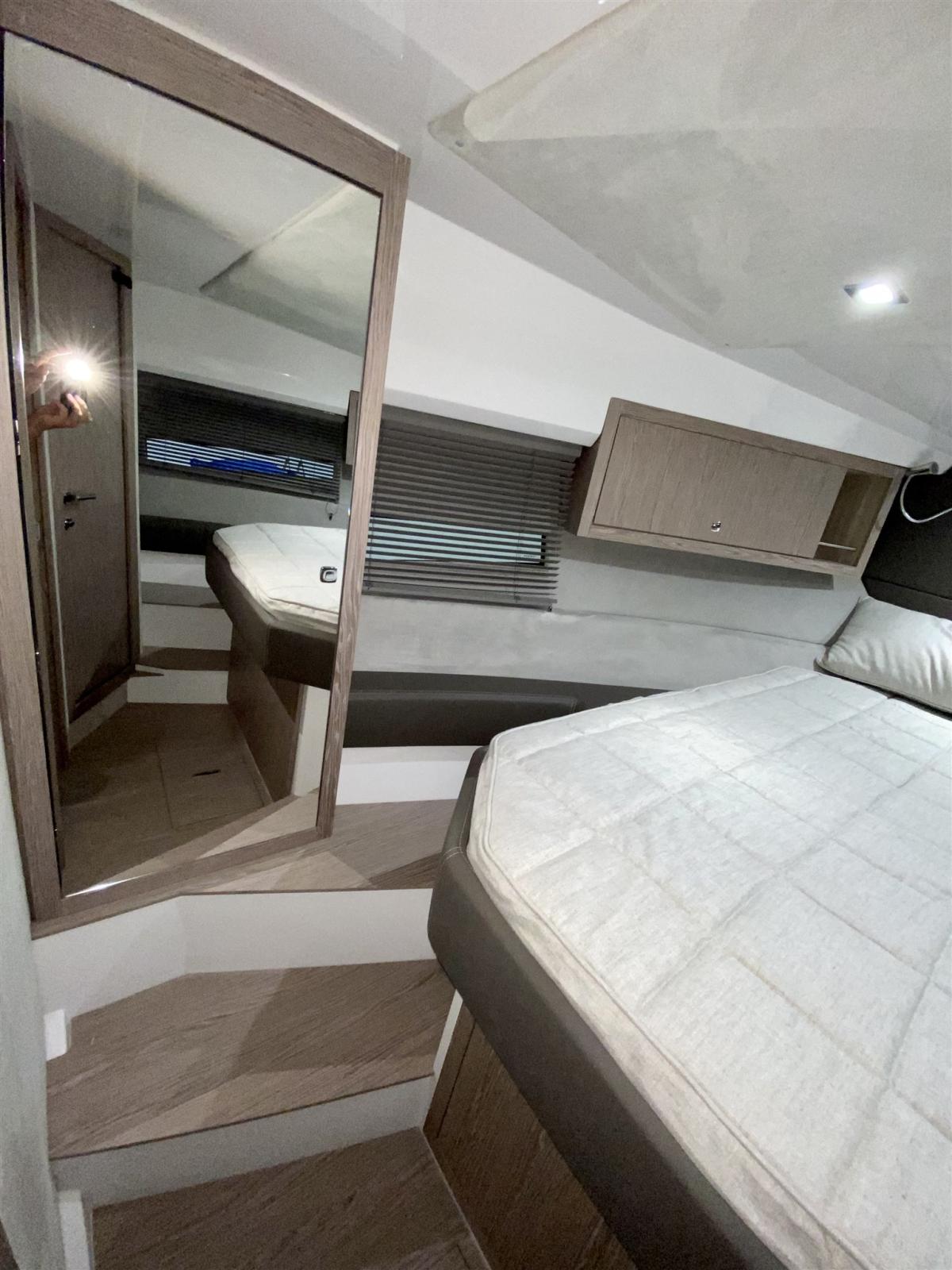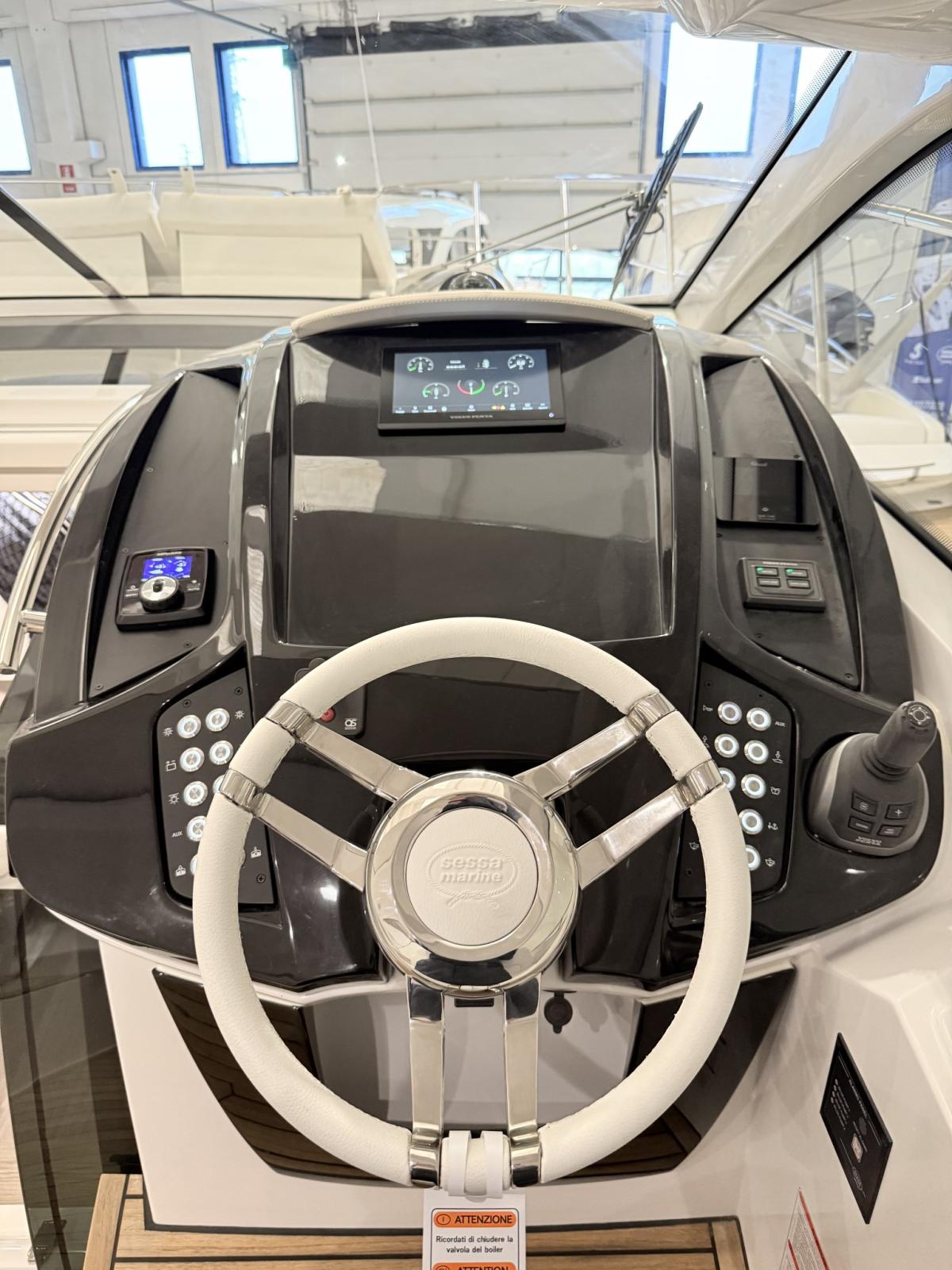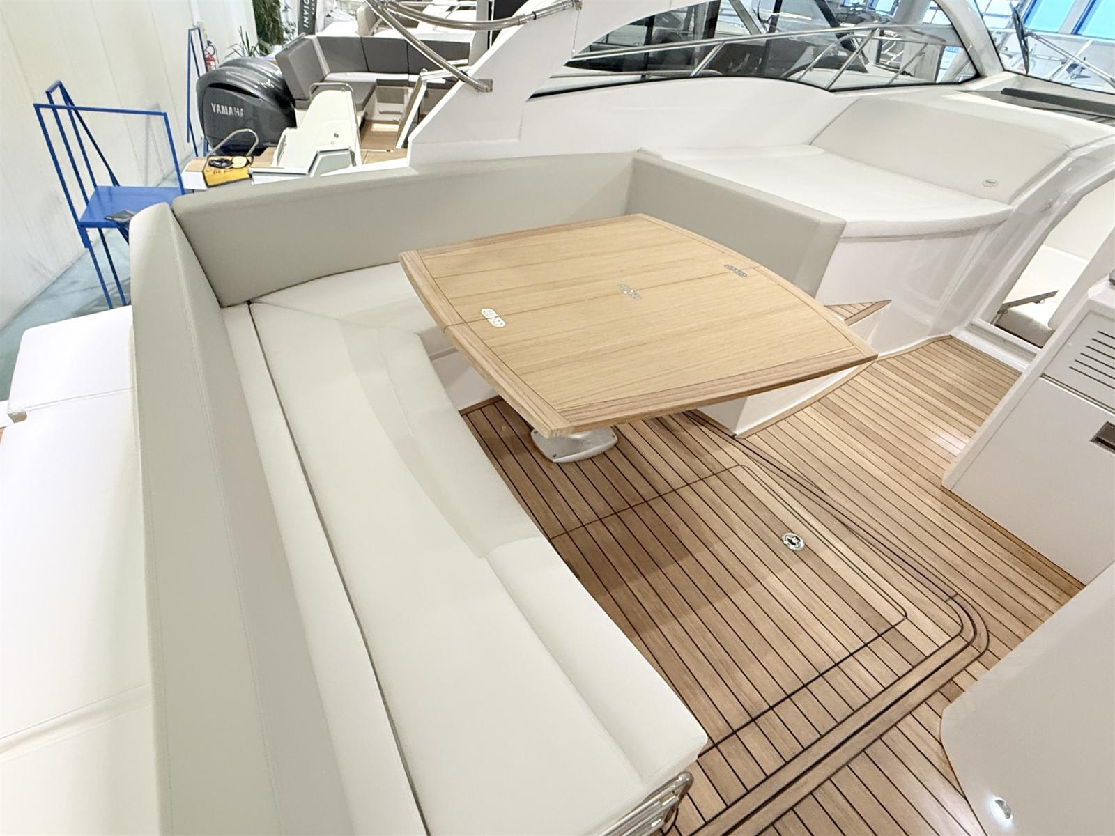 Engine Alarm, Bilge Alarm, Electric Engine Compartment Opening, Water pressure pump, Deck Shower, Electric Flaps (Zipwake), Hard top, Fire Extinguishing System, Flaps Indicators, Washbasin in the cockpit, Courtesy Lights, Gangway (idraulica a scomparsa), Platform (affondabile idraulica), Automatic Bilge Pump, Teak Cockpit, Shorepower connector, Electric Windlass, swimming ladder, cockpit table, Living Room Foldable Table, Horn.
