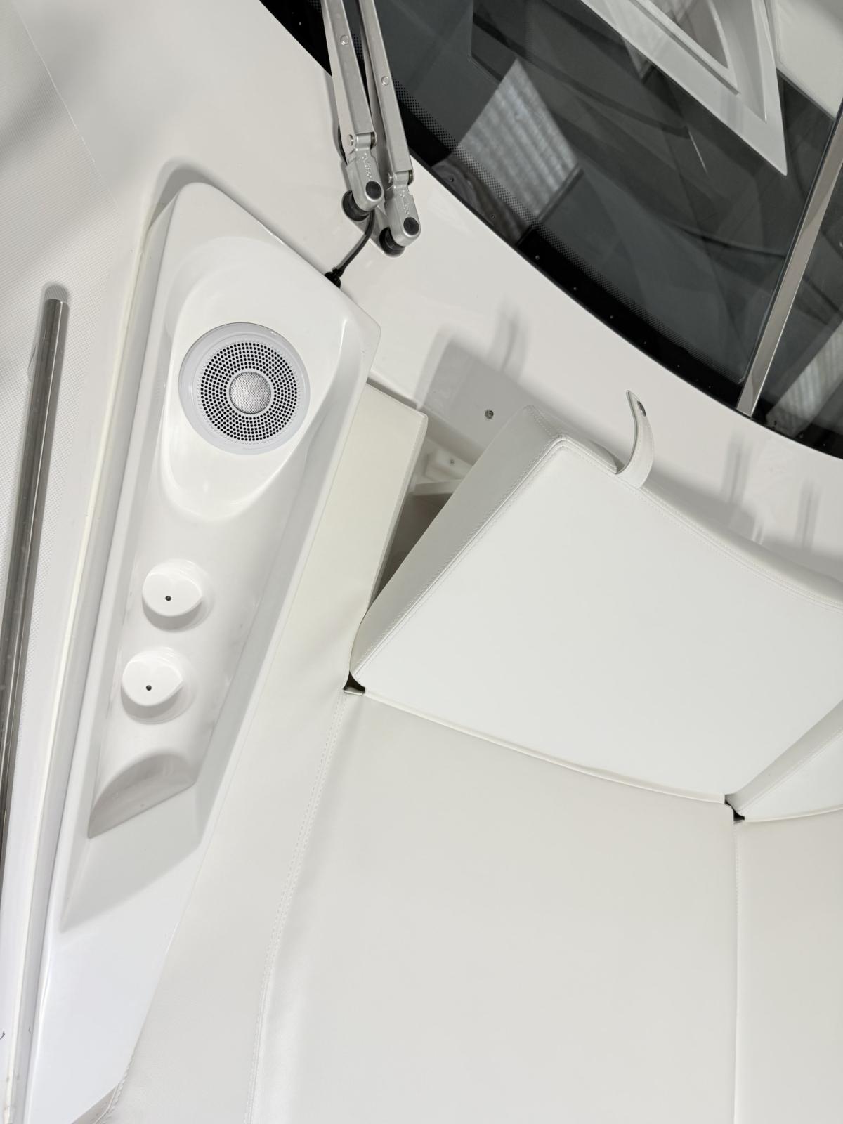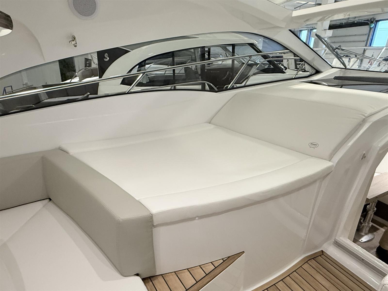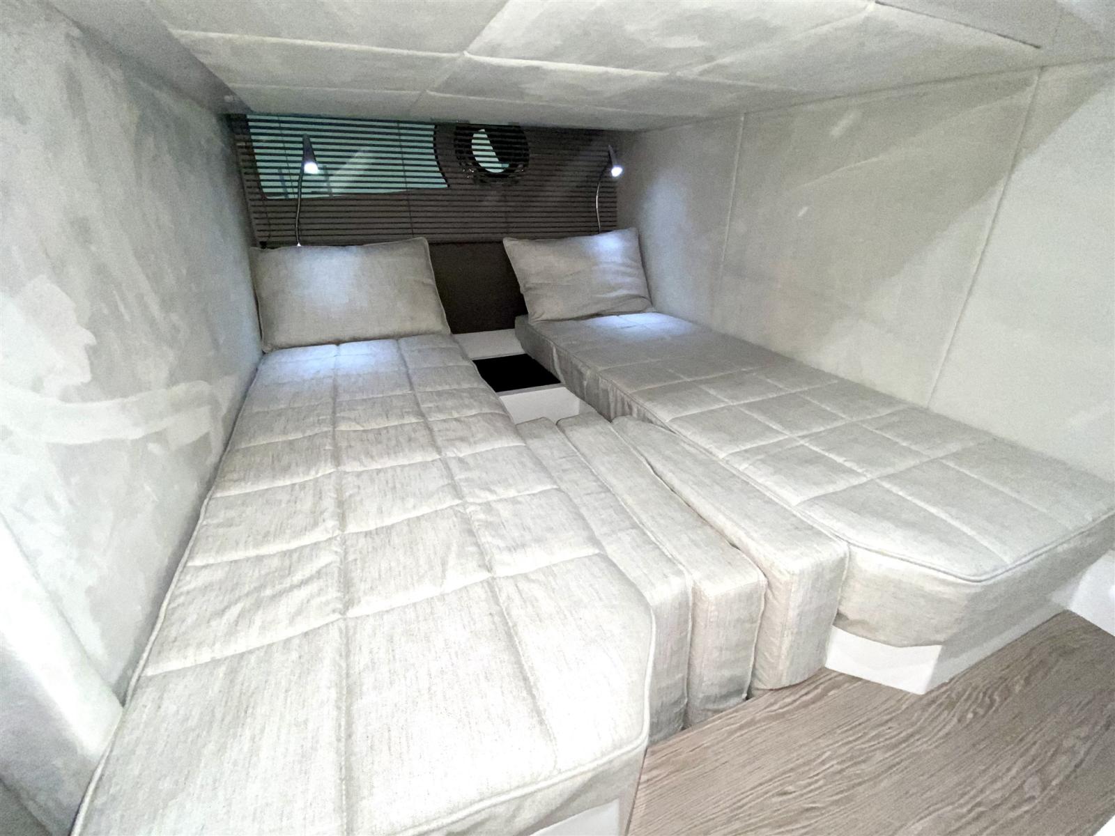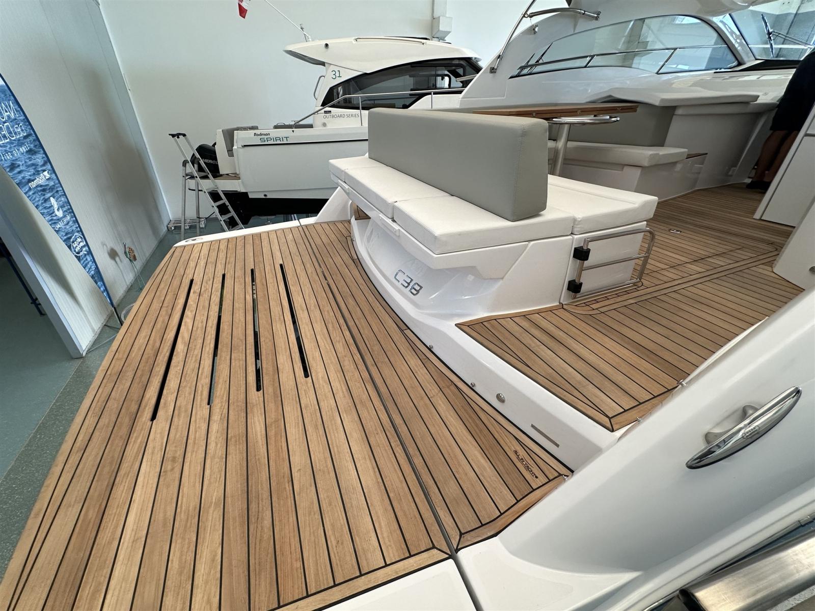 Engine Alarm, Bilge Alarm, Electric Engine Compartment Opening, Water pressure pump, Deck Shower, Electric Flaps (Zipwake), Hard top, Fire Extinguishing System, Flaps Indicators, Washbasin in the cockpit, Courtesy Lights, Gangway (idraulica a scomparsa), Platform (affondabile idraulica), Automatic Bilge Pump, Teak Cockpit, Shorepower connector, Electric Windlass, swimming ladder, cockpit table, Living Room Foldable Table, Horn.