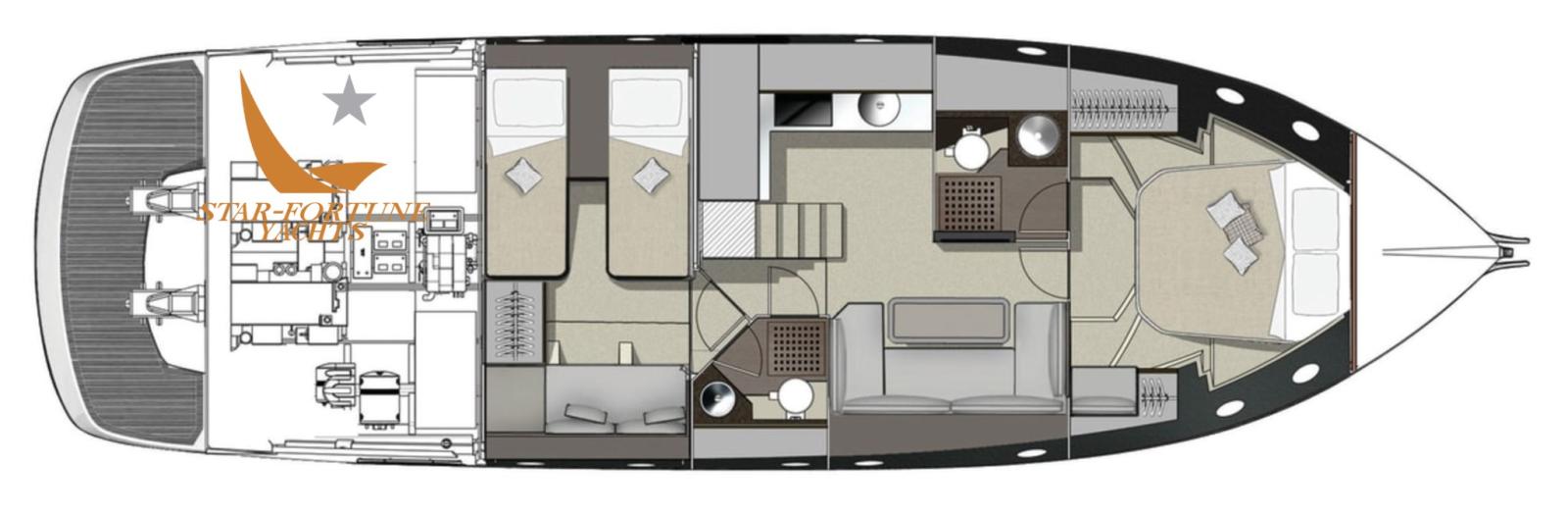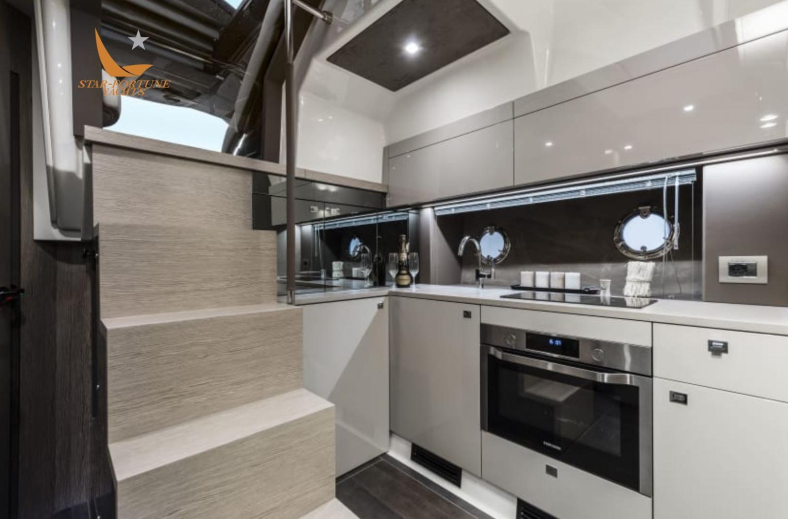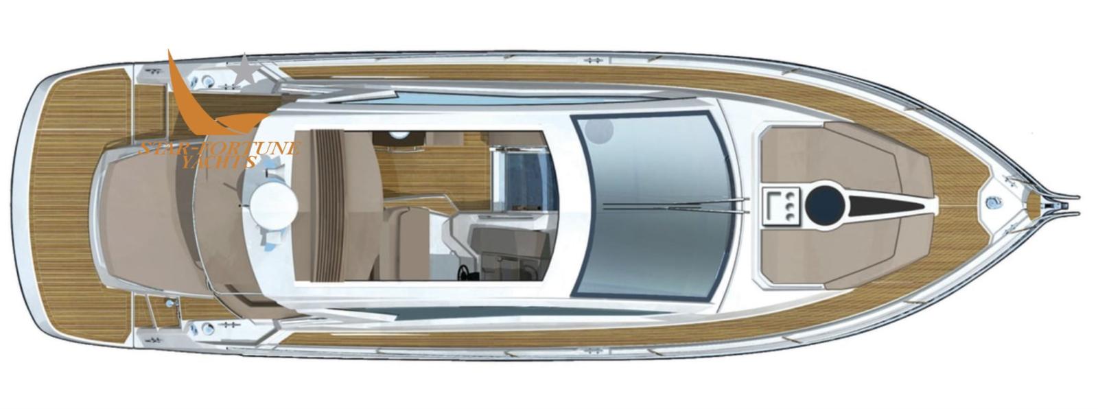 Engine Alarm, Bilge Alarm, Water pressure pump, Teak Side Decks, Deck Shower, Hard top, Flaps Indicators, Gangway (idraulica), Platform (idraulica), Automatic Bilge Pump, Manual Bilge Pump, Teak Cockpit, Shorepower connector, Electric Windlass, swimming ladder, cockpit table, Tender.