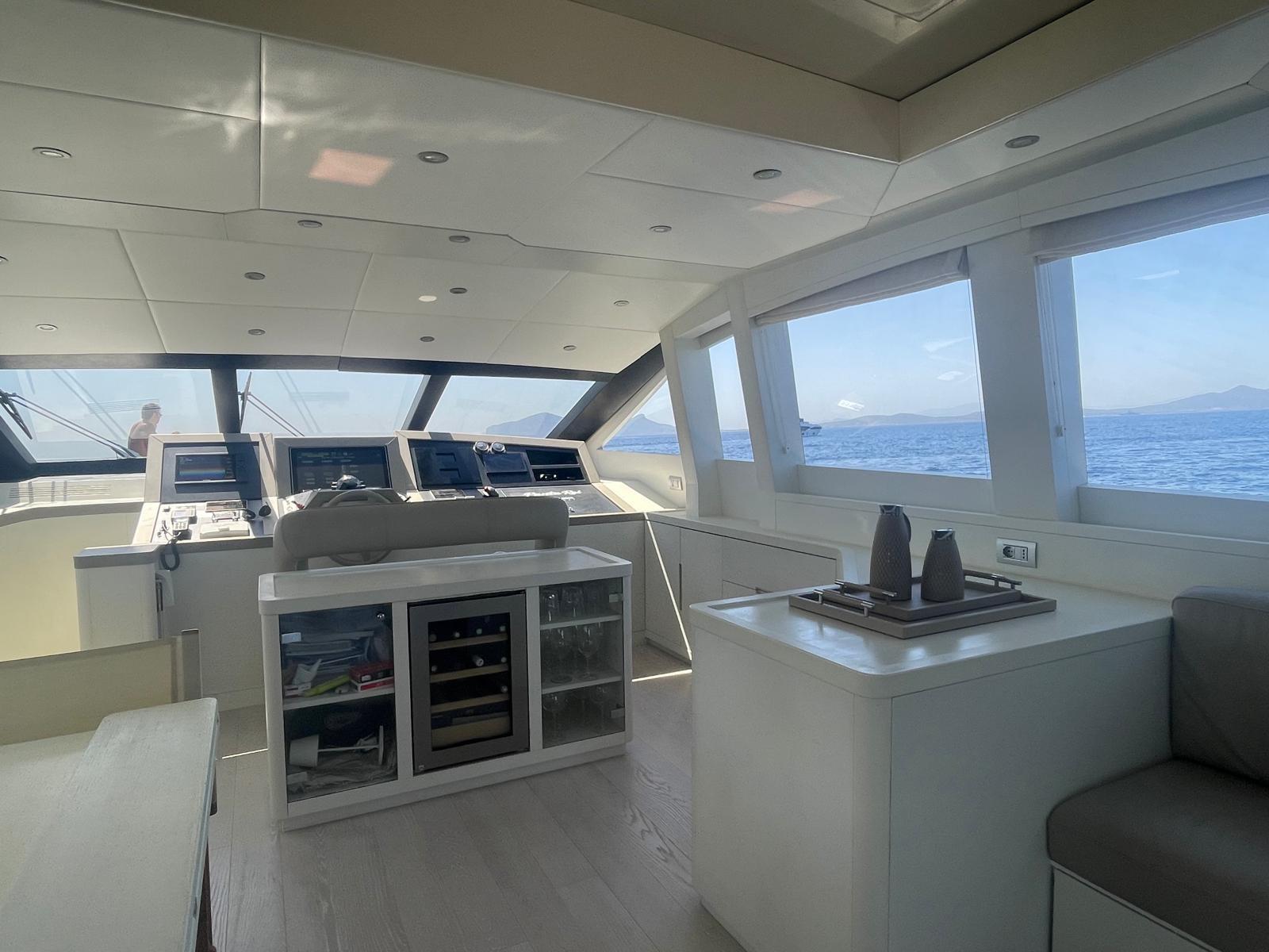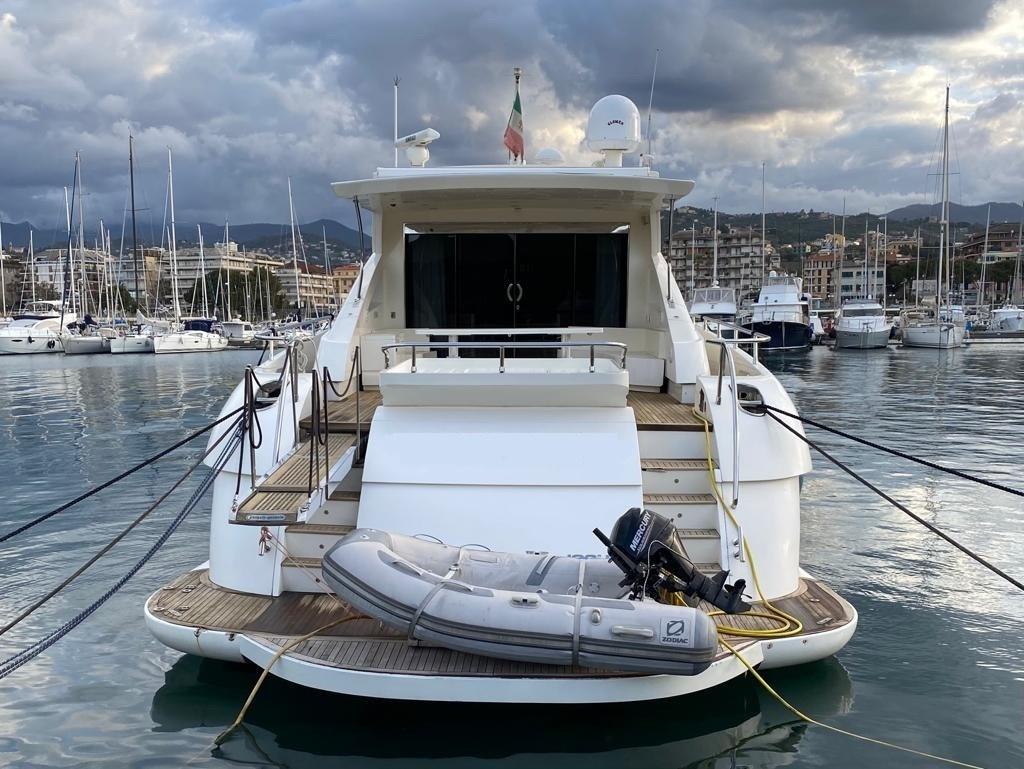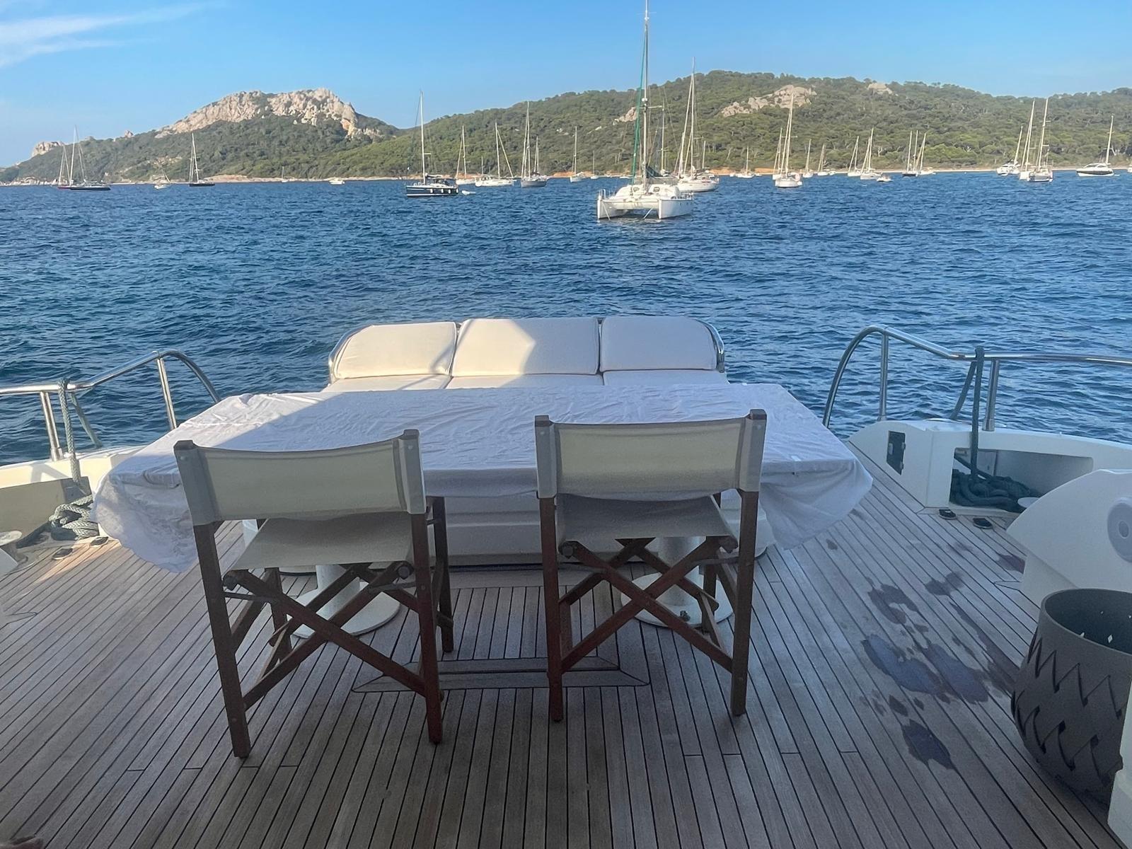 Engine Alarm, Bilge Alarm, Water pressure pump, Teak Side Decks, Deck Shower, Directional Spotlight, Hydraulic Flaps, Tender Garage, Hard top, Fire Extinguishing System, Flaps Indicators, Anchor Chain Washdown, Courtesy Lights, Underwater lights, Gangway, Platform, Automatic Bilge Pump, Manual Bilge Pump, Entry door, Side door, Teak Cockpit, Shorepower connector, Water harbor connector system, Rollbar, Electric Windlass, swimming ladder, cockpit table, guard rails with gates, Horn, 2 Stern Winches.