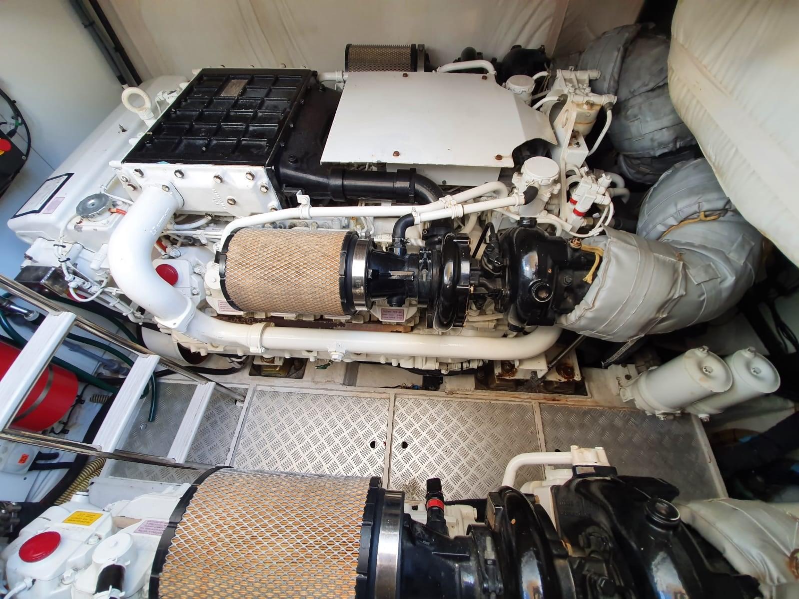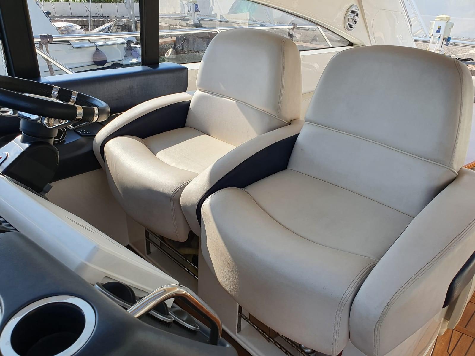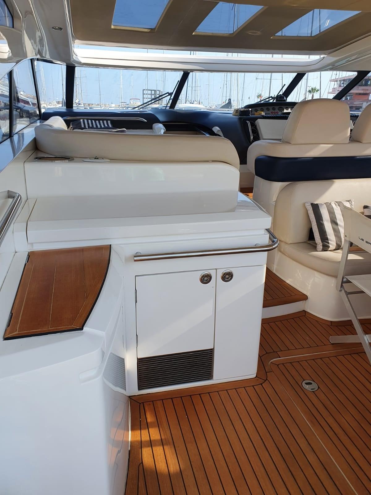 Engine Alarm, Bilge Alarm, Alternator, Water pressure pump, Shore power cable, Special Colour (SCAFO BLU), Guard rail, Directional Spotlight, Hydraulic Flaps, Tender Garage, Hard top, Fire Extinguishing System, Flaps Indicators, Washbasin in the cockpit, Courtesy Lights (LED), Gangway, Platform, Automatic Bilge Pump, Manual Bilge Pump, Teak deck, Teak Cockpit, Shorepower connector, Electric Windlass, swimming ladder, cockpit table, Horn.