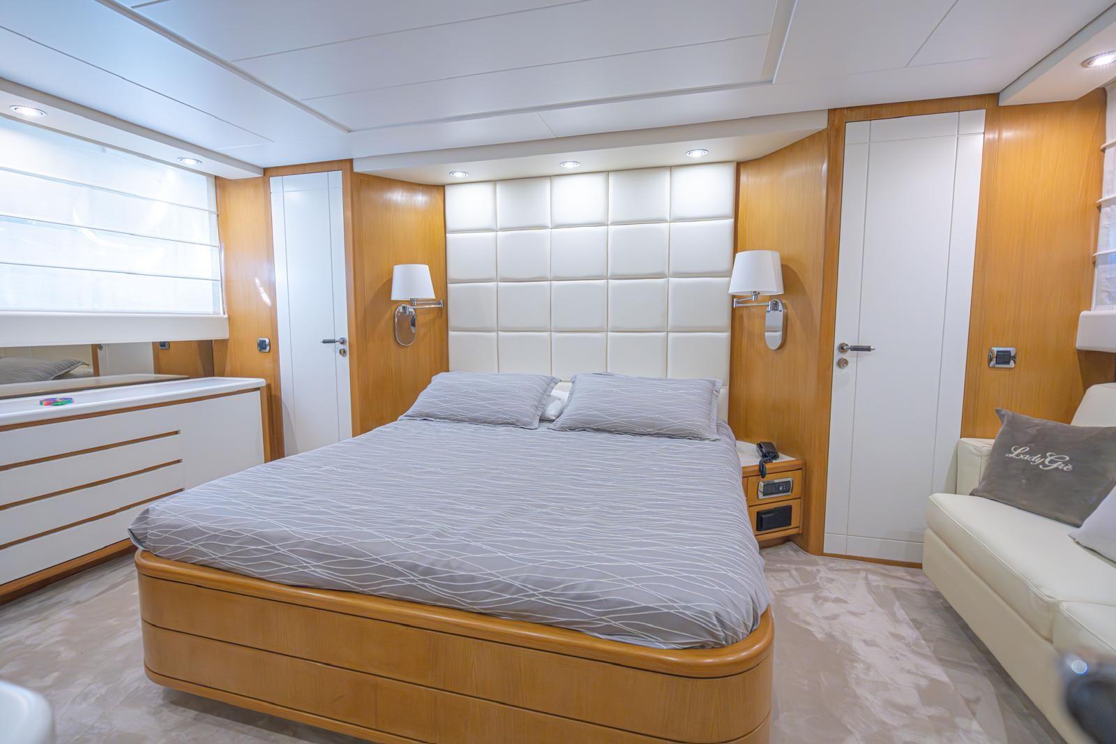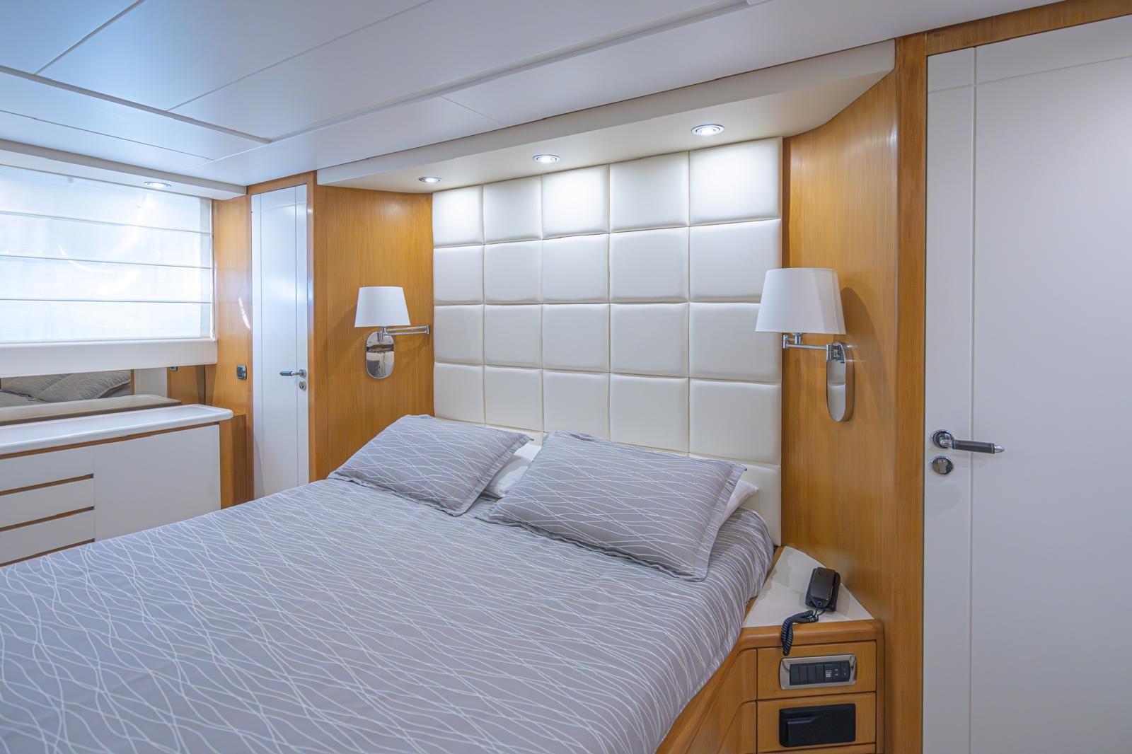 Fume/Gas Detector, Engine Alarm, Bilge Alarm, Water pressure pump, Teak Side Decks, Deck Shower, Twin Steering, Hydraulic Flaps, Crane, Fire Extinguishing System, Flaps Indicators, Anchor Chain Washdown, Courtesy Lights, Gangway, Platform, Automatic Bilge Pump, Manual Bilge Pump, Entry door, Side door, Teak Cockpit, Shorepower connector, Voltage Rectifier, Electronic instrumentation repeater, Rollbar, Electric Windlass, swimming ladder, cockpit table, guard rails with gates, Horn, Stern Winches, Bow Winches.