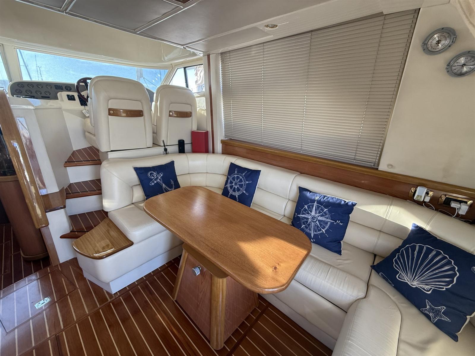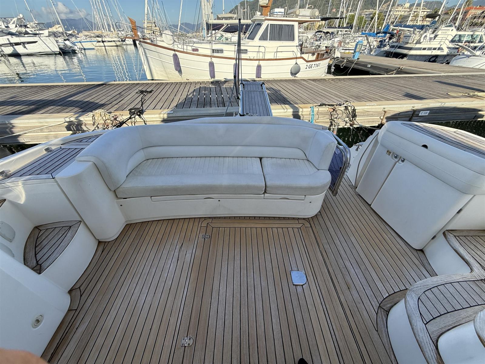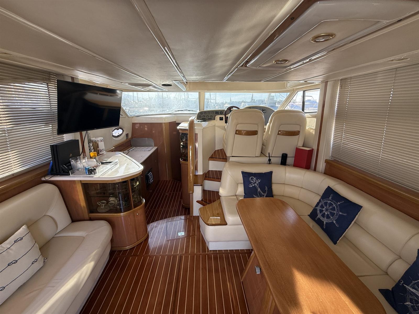 Engine Alarm, Bilge Alarm, Alternator, Water pressure pump, Shore power cable, Guard rail, Deck Shower, Twin Steering, Directional Spotlight, Electric Flaps, Fire Extinguishing System, Flaps Indicators, Washbasin in the cockpit, Courtesy Lights, Underwater lights, Fenders, Gangway, Platform, Automatic Bilge Pump, Manual Bilge Pump, Entry door, Teak Cockpit, Shorepower connector, Electronic instrumentation repeater, Rollbar, Electric Windlass, swimming ladder, cockpit table, guard rails with gates, Horn.