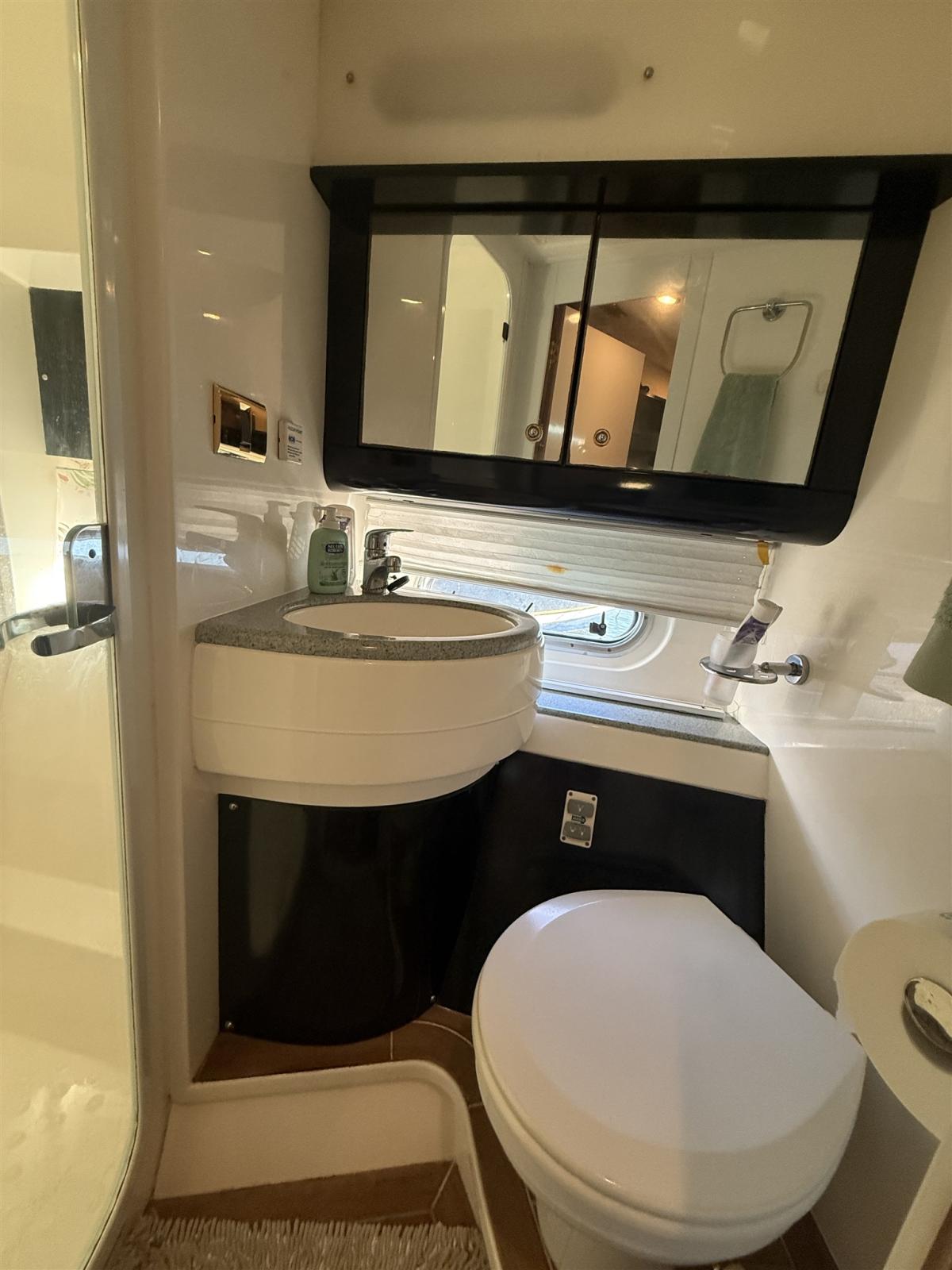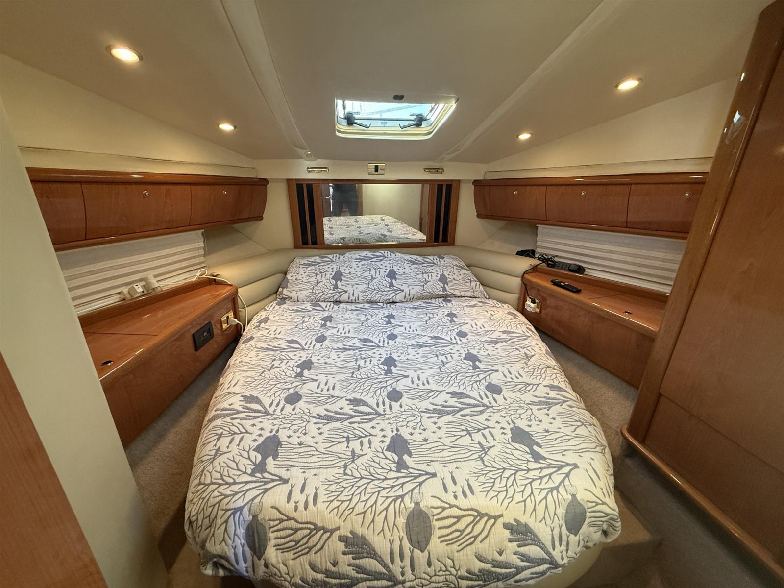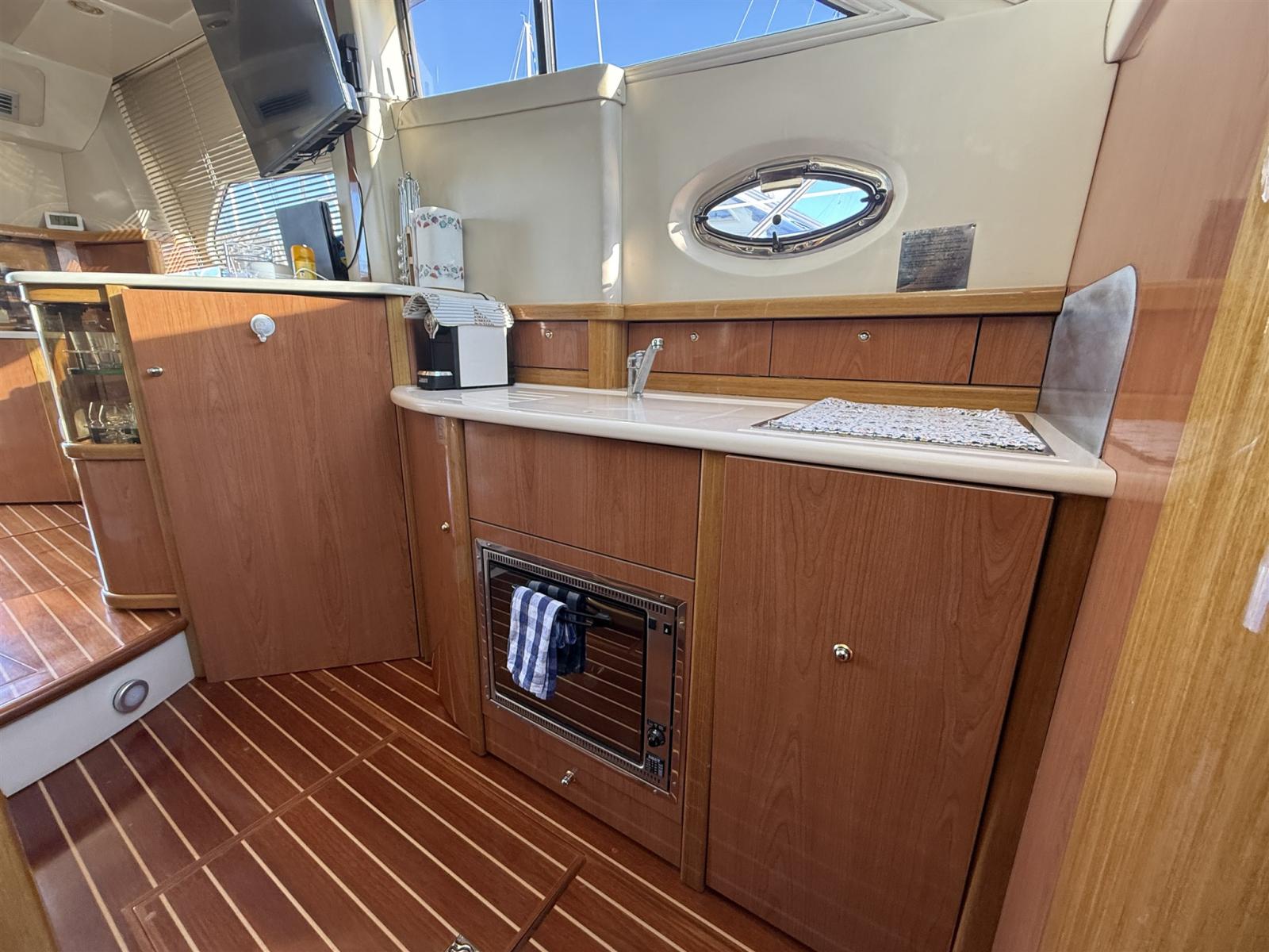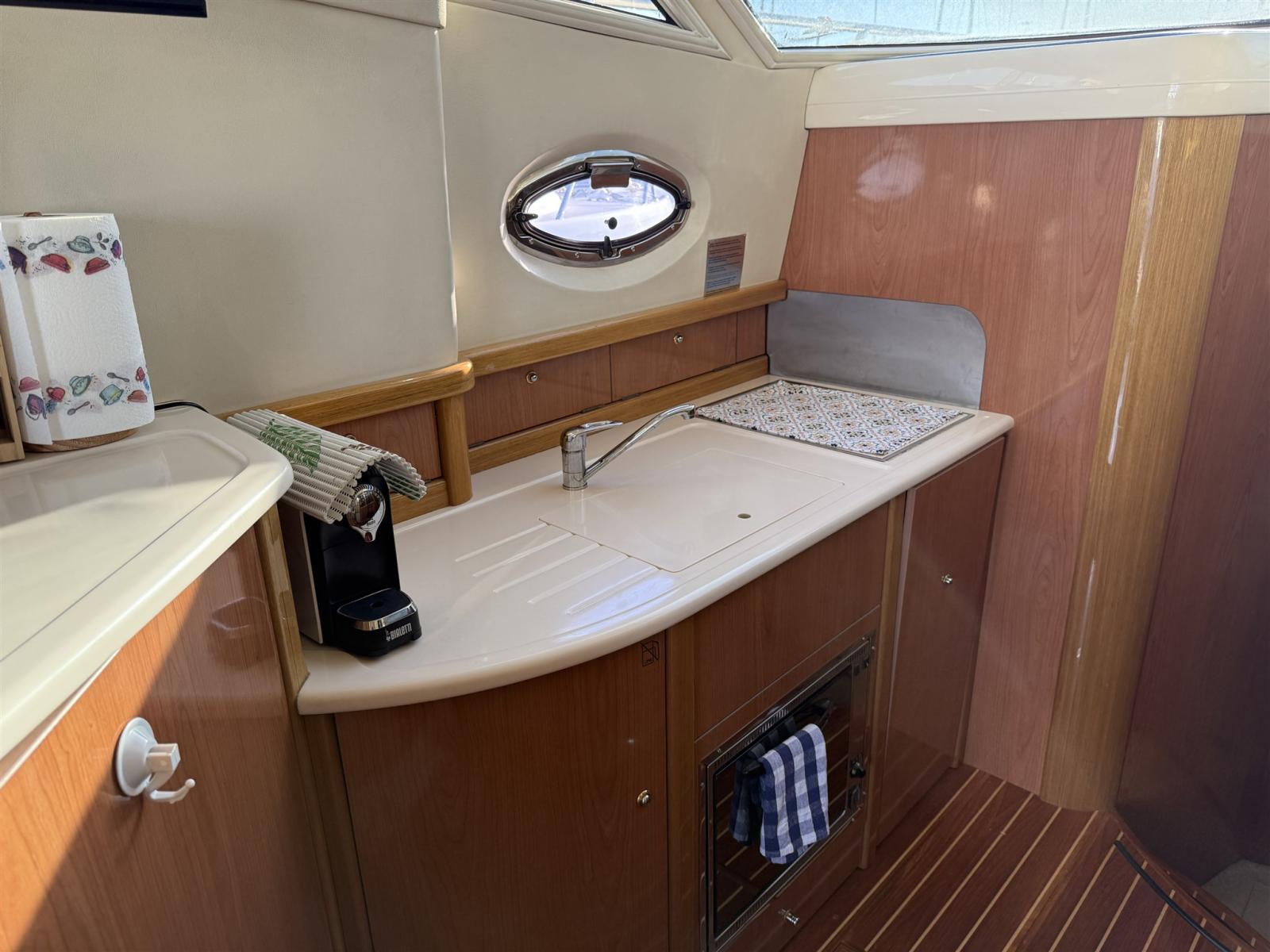 Engine Alarm, Bilge Alarm, Alternator, Water pressure pump, Shore power cable, Guard rail, Deck Shower, Twin Steering, Directional Spotlight, Electric Flaps, Fire Extinguishing System, Flaps Indicators, Washbasin in the cockpit, Courtesy Lights, Underwater lights, Fenders, Gangway, Platform, Automatic Bilge Pump, Manual Bilge Pump, Entry door, Teak Cockpit, Shorepower connector, Electronic instrumentation repeater, Rollbar, Electric Windlass, swimming ladder, cockpit table, guard rails with gates, Horn.
