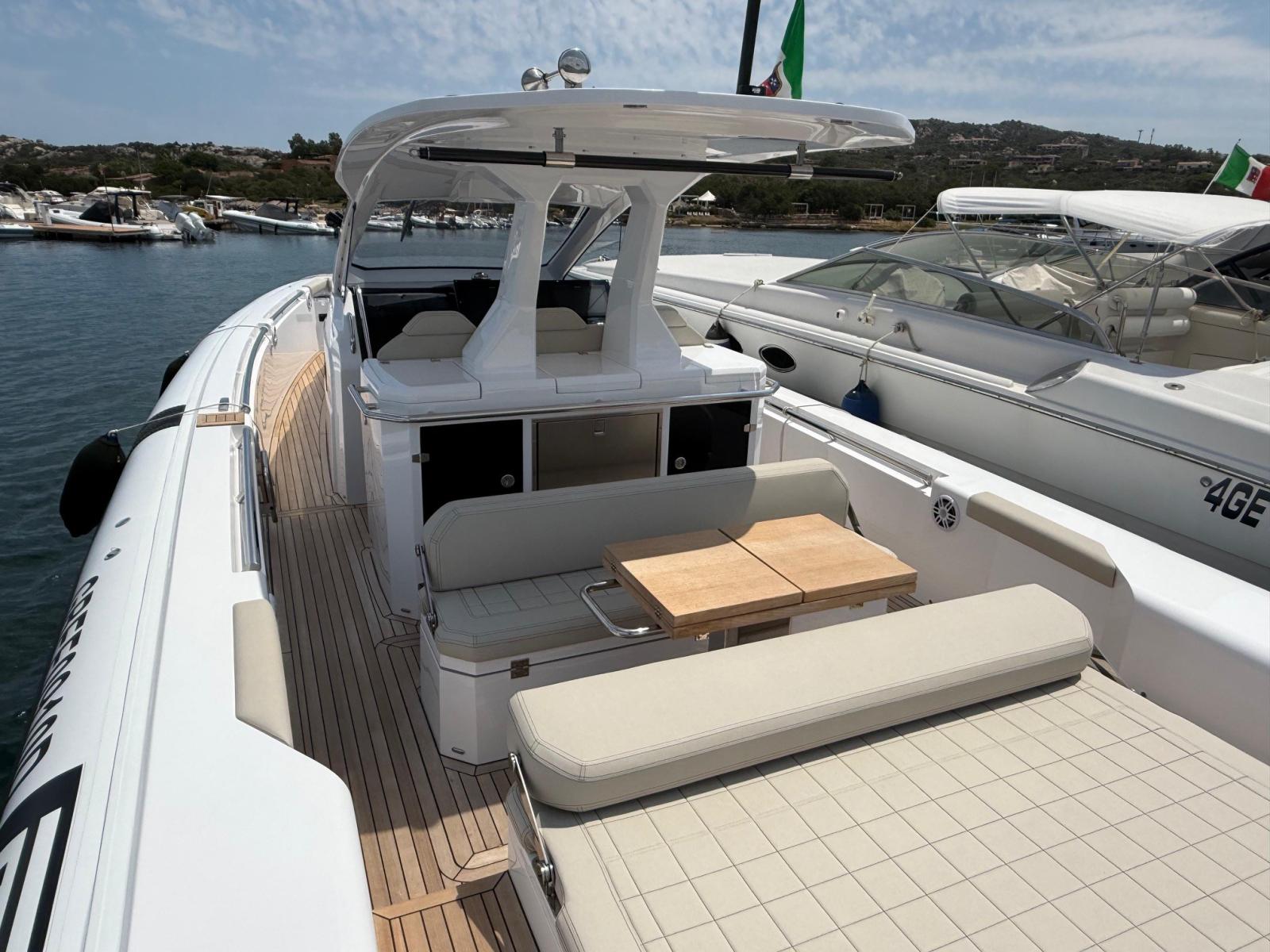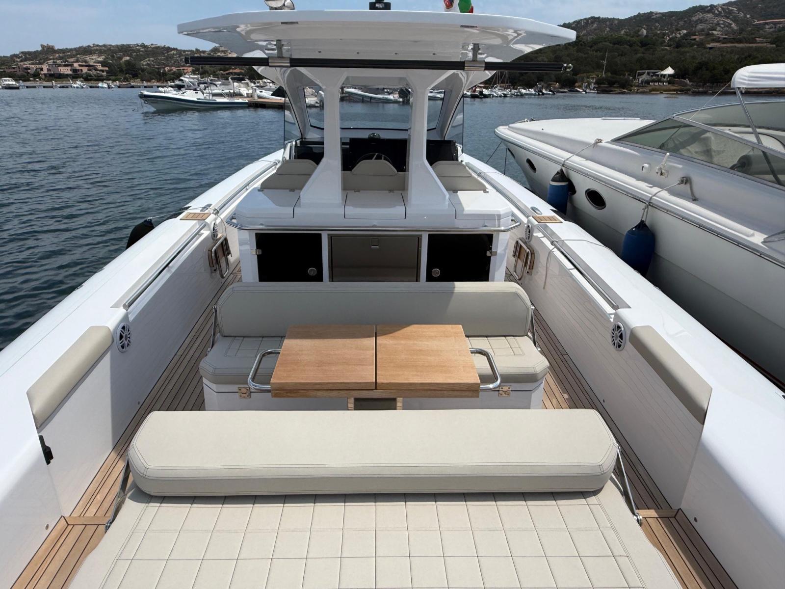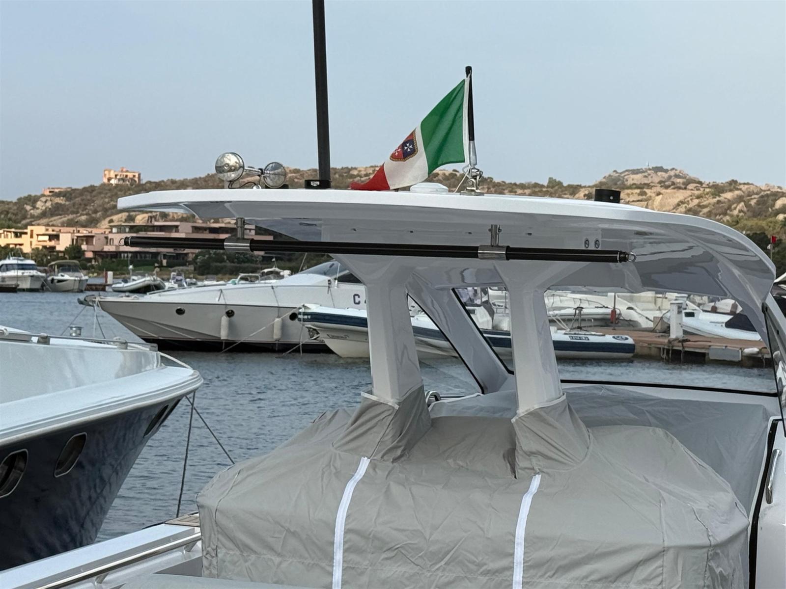 Engine Alarm, Bilge Alarm, Alternator, Anchor (e catena in inox), Water pressure pump, Folding cleats, Teak Side Decks, Shore power cable, Deck Shower, Washbasin in the cockpit, Courtesy Lights, Underwater lights, Platform, Automatic Bilge Pump, Manual Bilge Pump, Teak deck, Teak Cockpit, Shorepower connector, Electric Windlass, swimming ladder (+ seconda scaletta aggiuntiva), cockpit table, Horn, T-Top (con prolunga in carbonio).