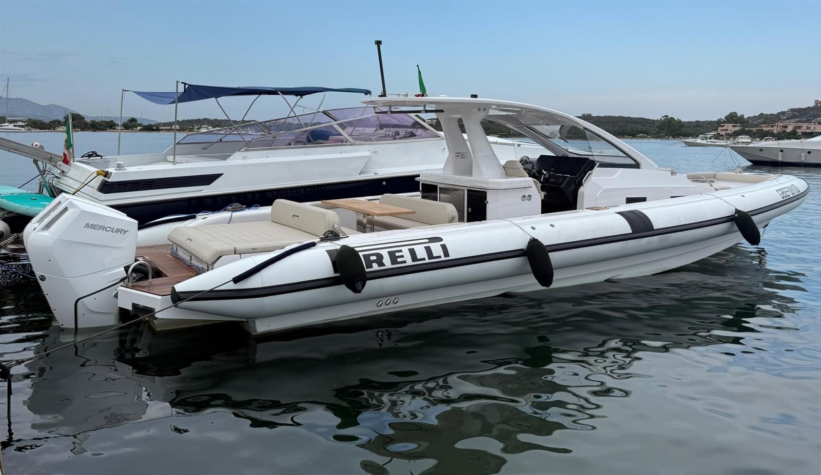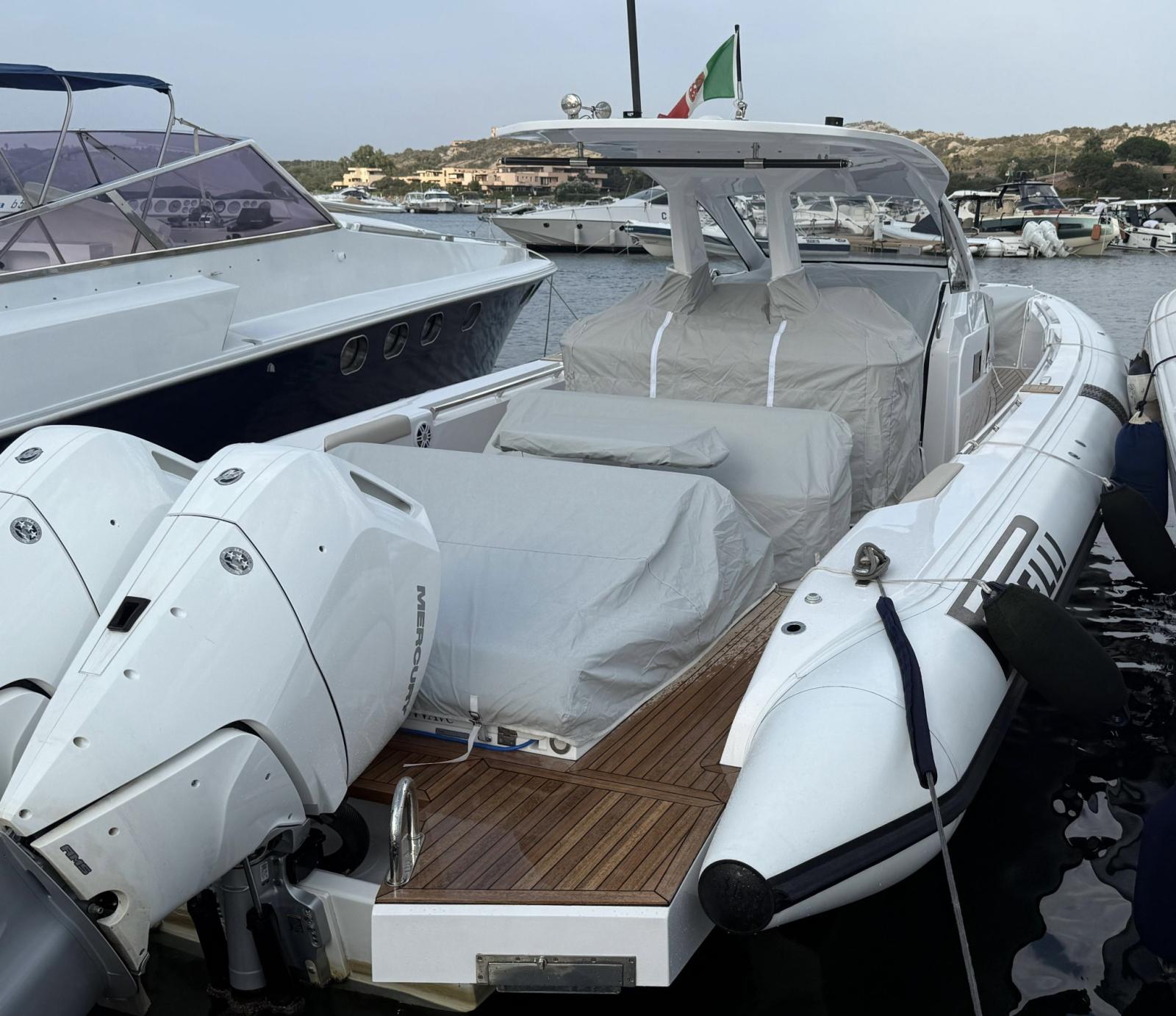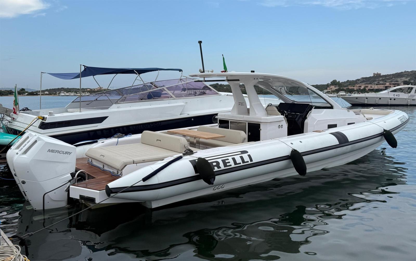 Engine Alarm, Bilge Alarm, Alternator, Anchor (e catena in inox), Water pressure pump, Folding cleats, Teak Side Decks, Shore power cable, Deck Shower, Washbasin in the cockpit, Courtesy Lights, Underwater lights, Platform, Automatic Bilge Pump, Manual Bilge Pump, Teak deck, Teak Cockpit, Shorepower connector, Electric Windlass, swimming ladder (+ seconda scaletta aggiuntiva), cockpit table, Horn, T-Top (con prolunga in carbonio).