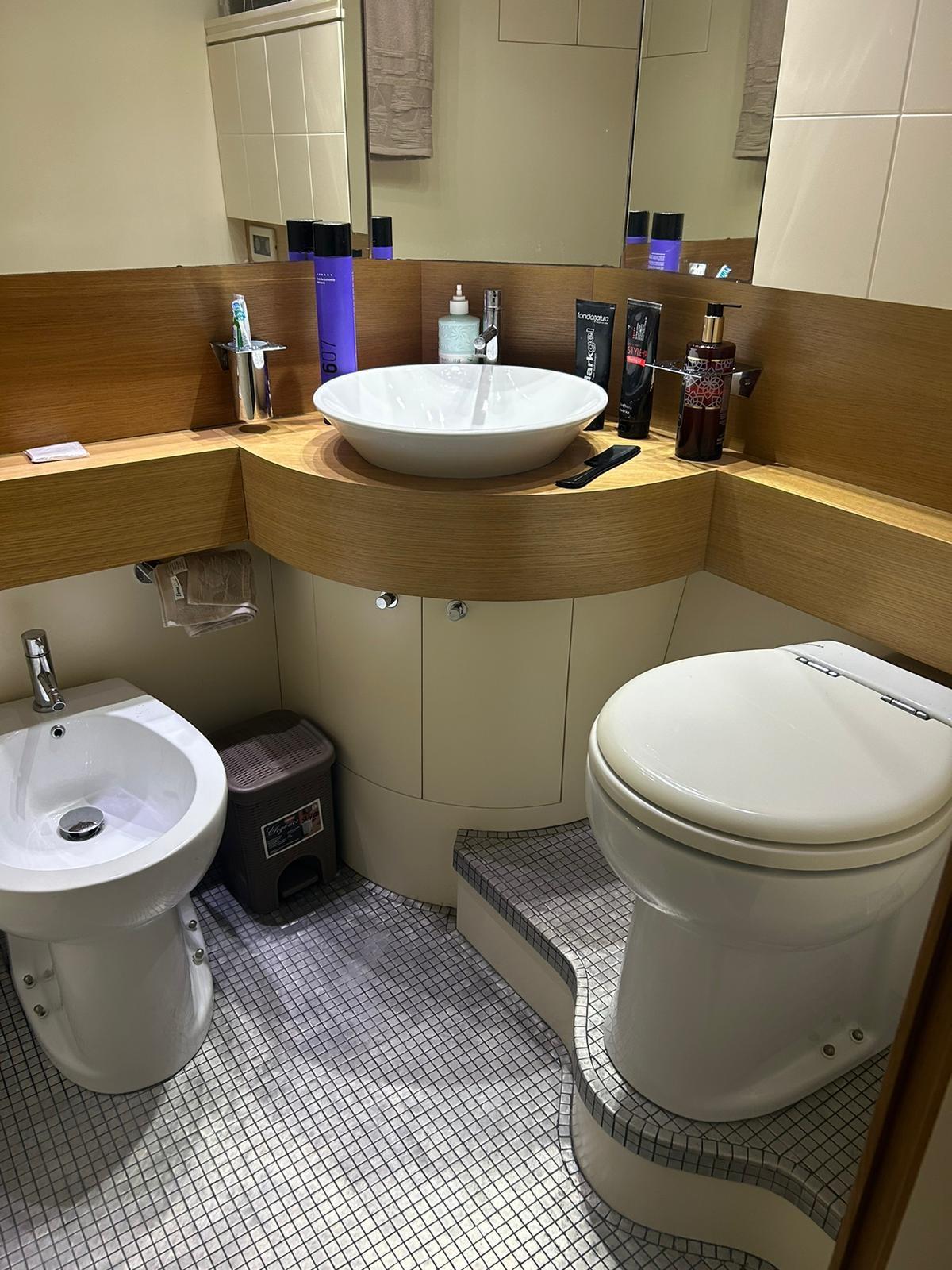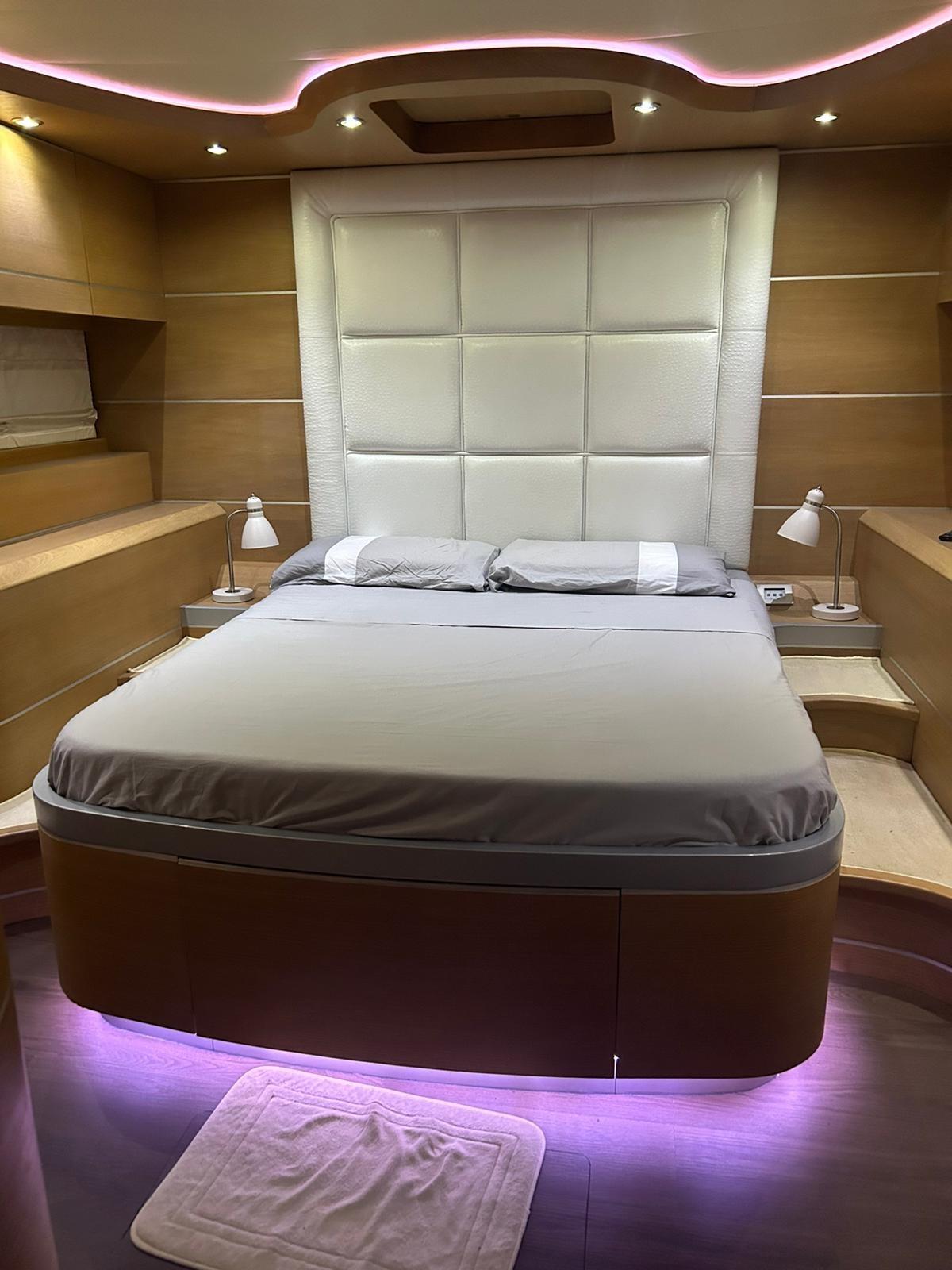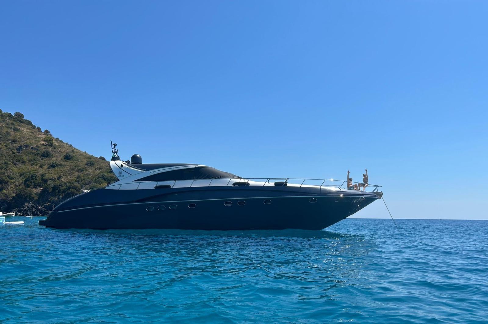Engine Alarm, Water pressure pump, Special Colour (Grigio scuro), Deck Shower, Directional Spotlight, Hydraulic Flaps, Tender Garage, Crane, Hard top, Flaps Indicators, Washbasin in the cockpit, Courtesy Lights, Gangway, Platform, Manual Bilge Pump, Entry door, Teak Cockpit, Shorepower connector, Voltage Rectifier, Rollbar, Electric Windlass, swimming ladder, cockpit table, Horn, Bow Winches.