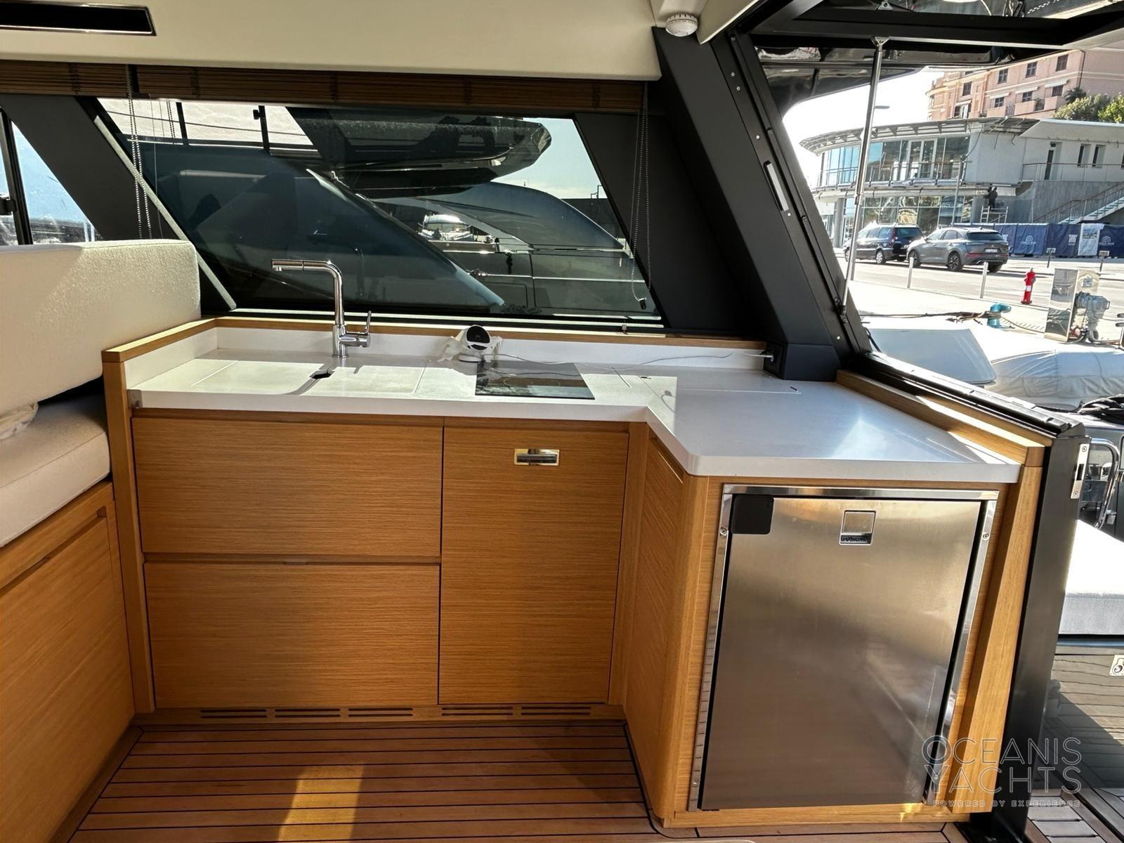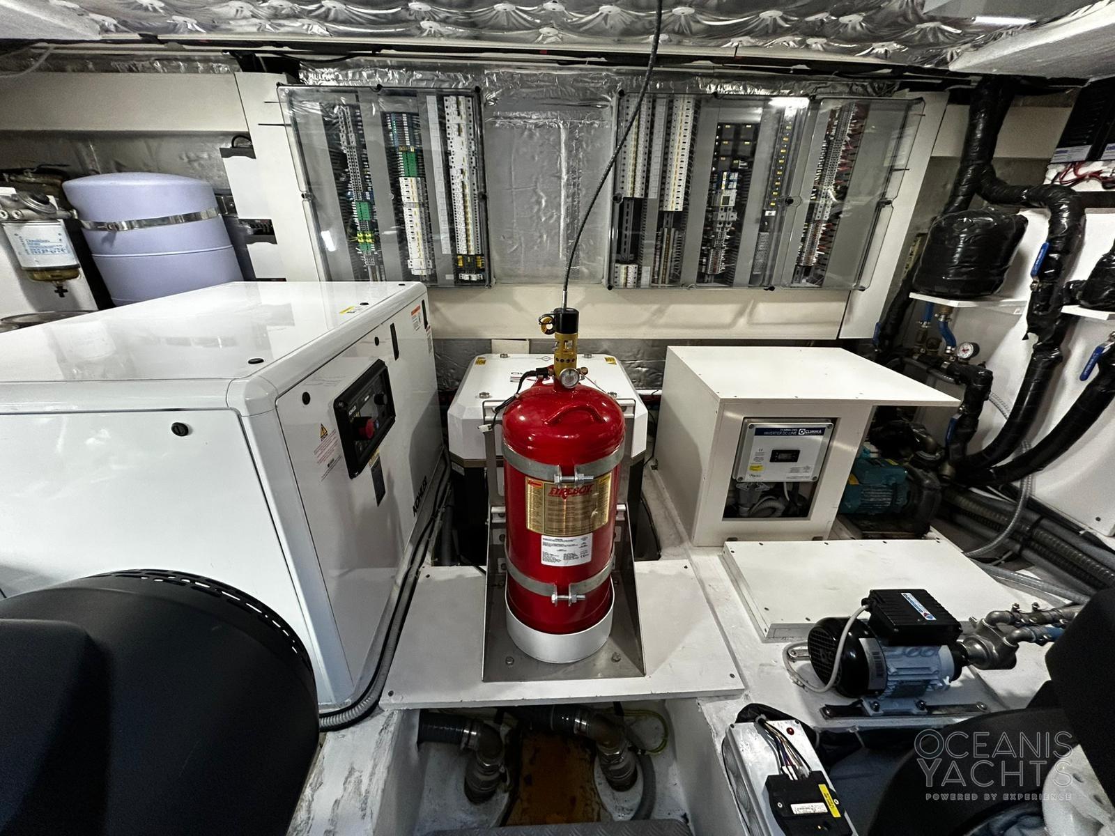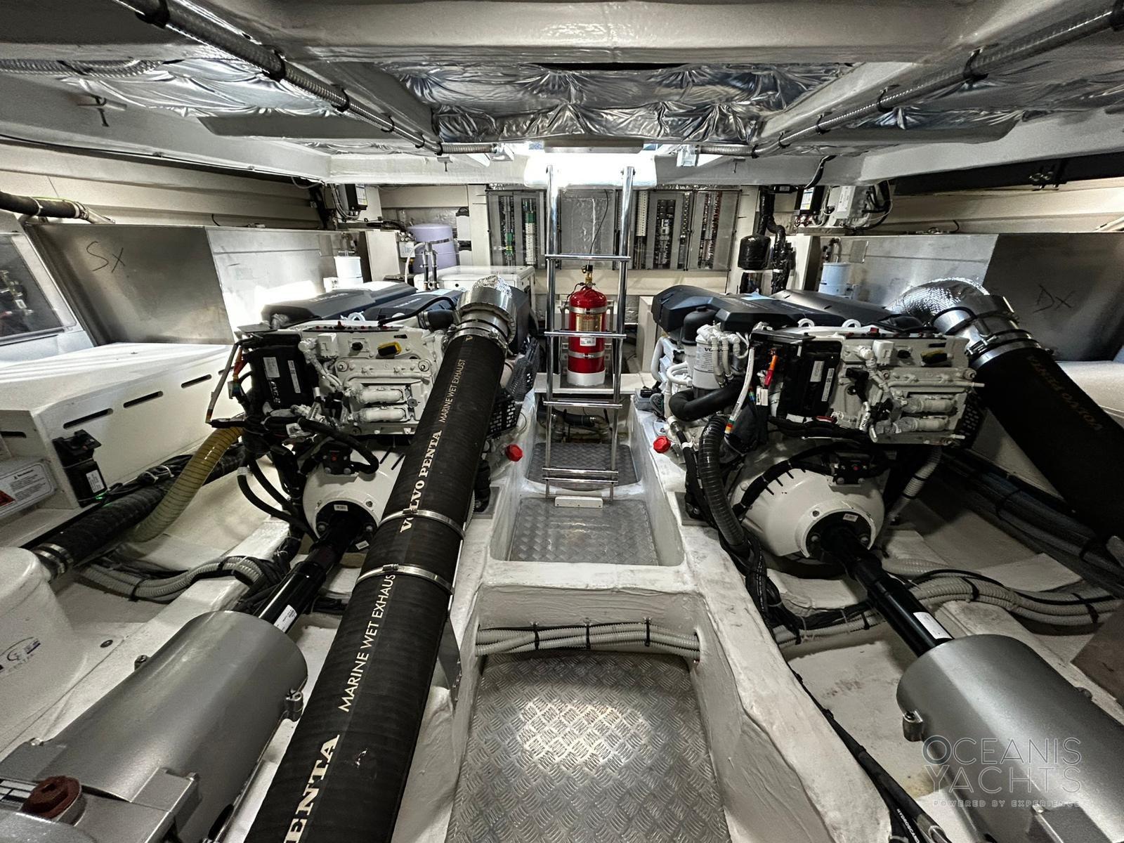 Fume/Gas Detector, Engine Alarm, Bilge Alarm, Alternator, Auto Dynamic Trim Interceptor, Water pressure pump, Shore power cable, Deck Shower, Electric Flaps, Hard top, Courtesy Lights, 8 Fenders, Gangway (idraulica a scomparsa), Platform (idraulica affondabile), Automatic Bilge Pump, Manual Bilge Pump, Teak deck, Entry door, Teak Cockpit, Shorepower connector, Electric Windlass, swimming ladder, Stabilizers (giroscopico), cockpit table (elettrio), Horn.