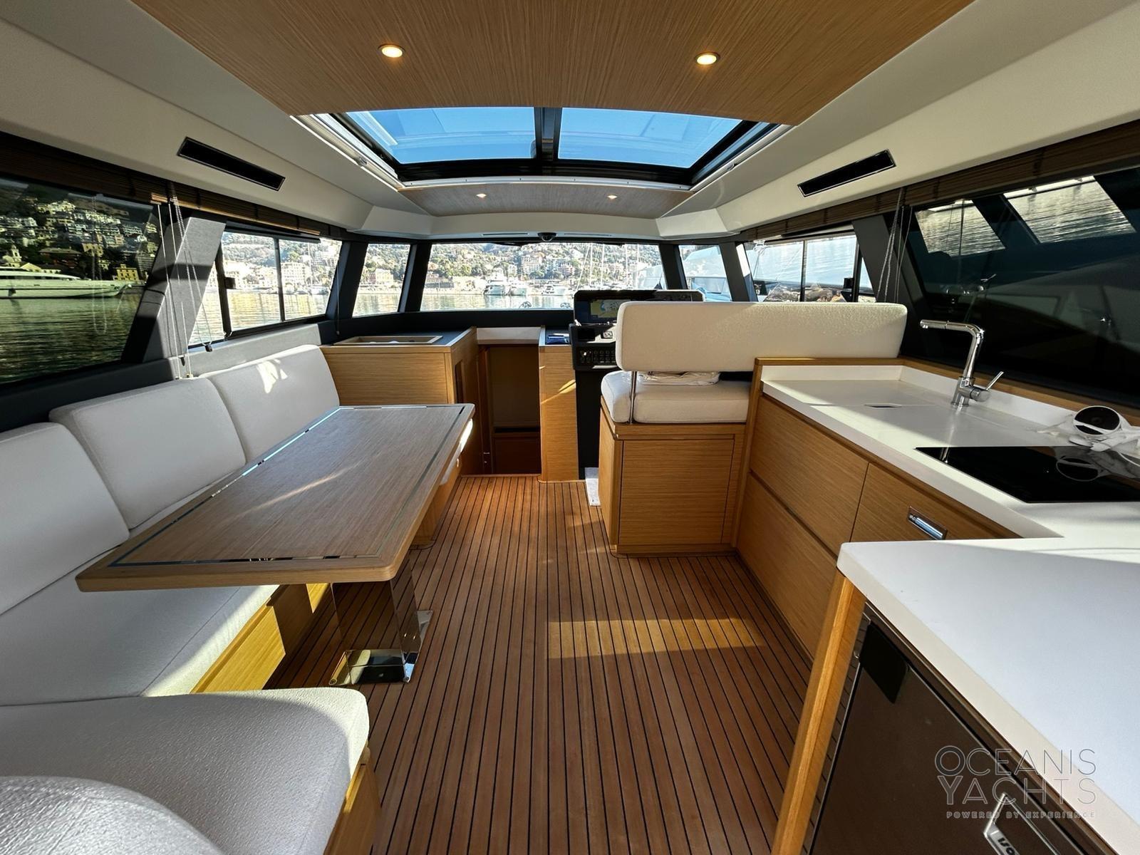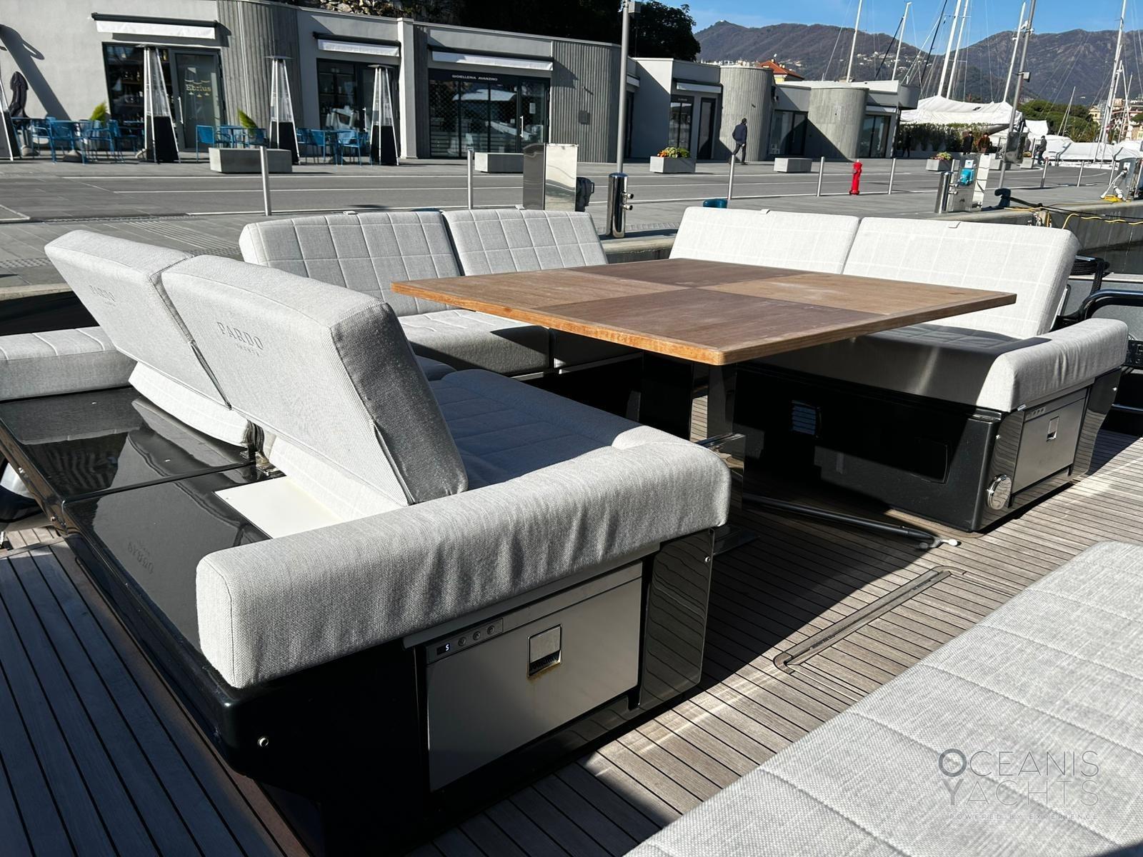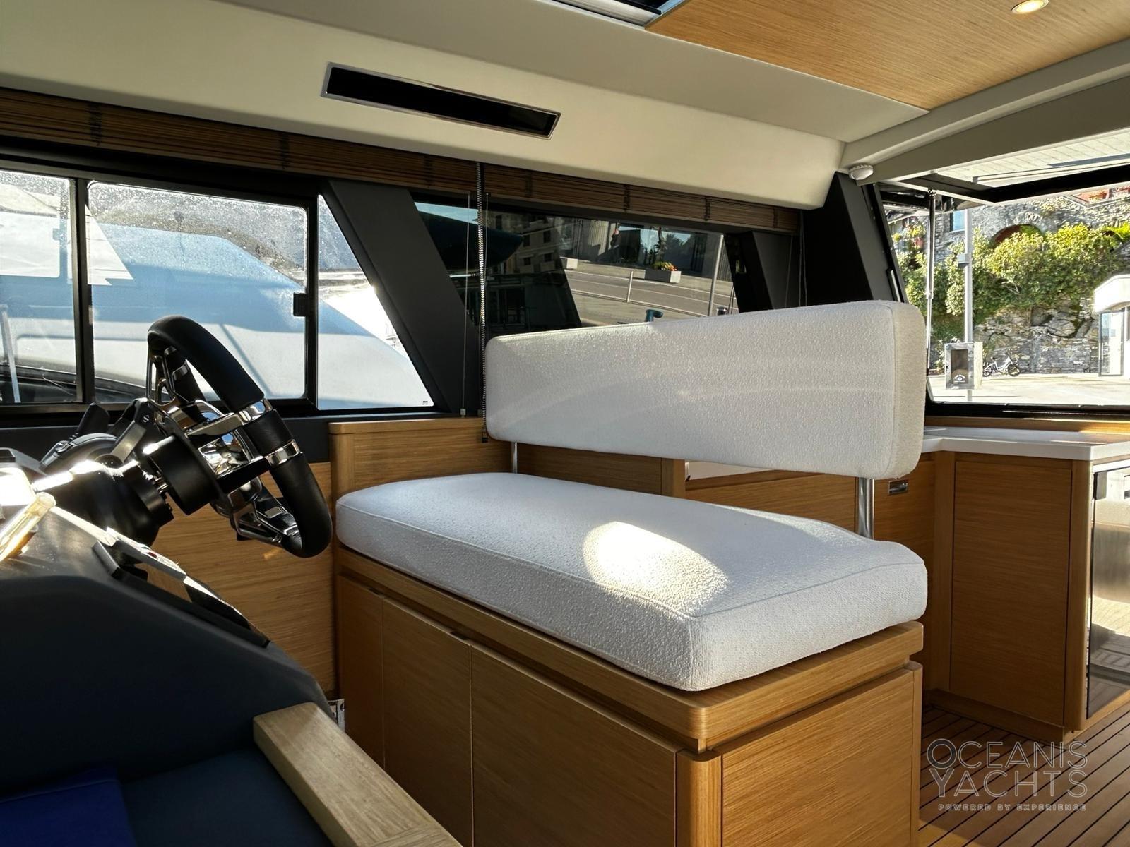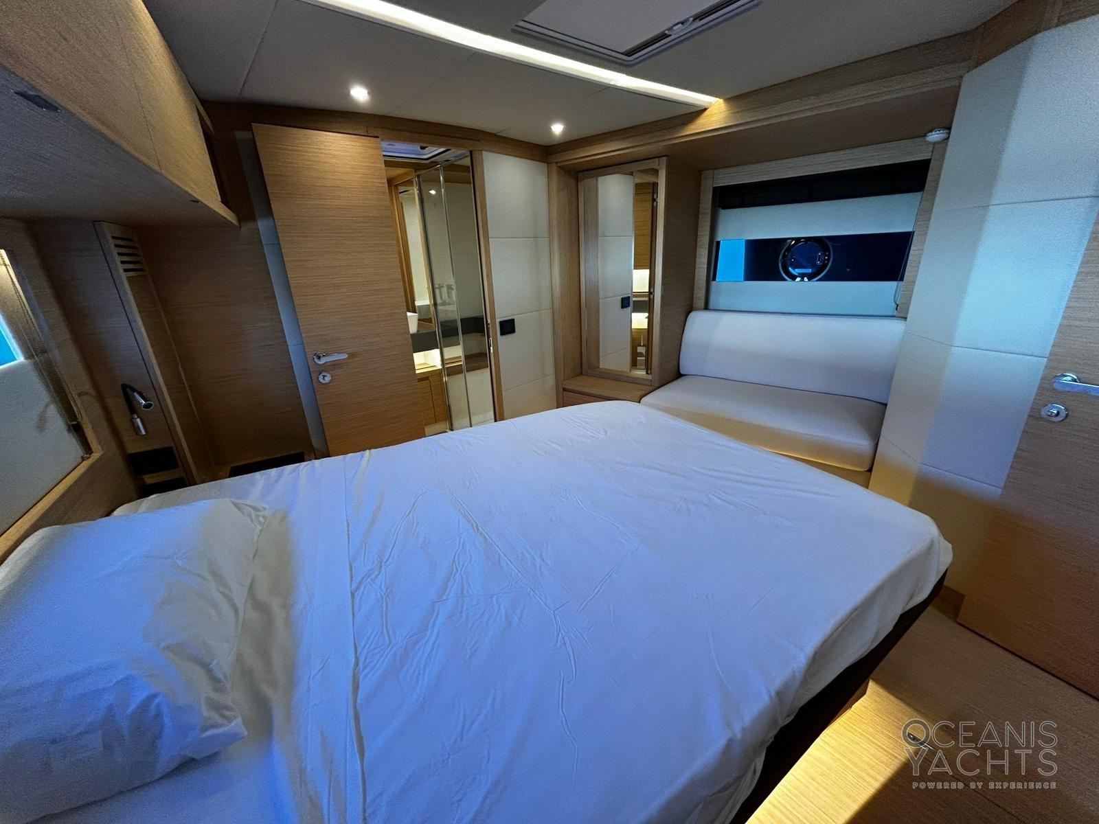 Fume/Gas Detector, Engine Alarm, Bilge Alarm, Alternator, Auto Dynamic Trim Interceptor, Water pressure pump, Shore power cable, Deck Shower, Electric Flaps, Hard top, Courtesy Lights, 8 Fenders, Gangway (idraulica a scomparsa), Platform (idraulica affondabile), Automatic Bilge Pump, Manual Bilge Pump, Teak deck, Entry door, Teak Cockpit, Shorepower connector, Electric Windlass, swimming ladder, Stabilizers (giroscopico), cockpit table (elettrio), Horn.