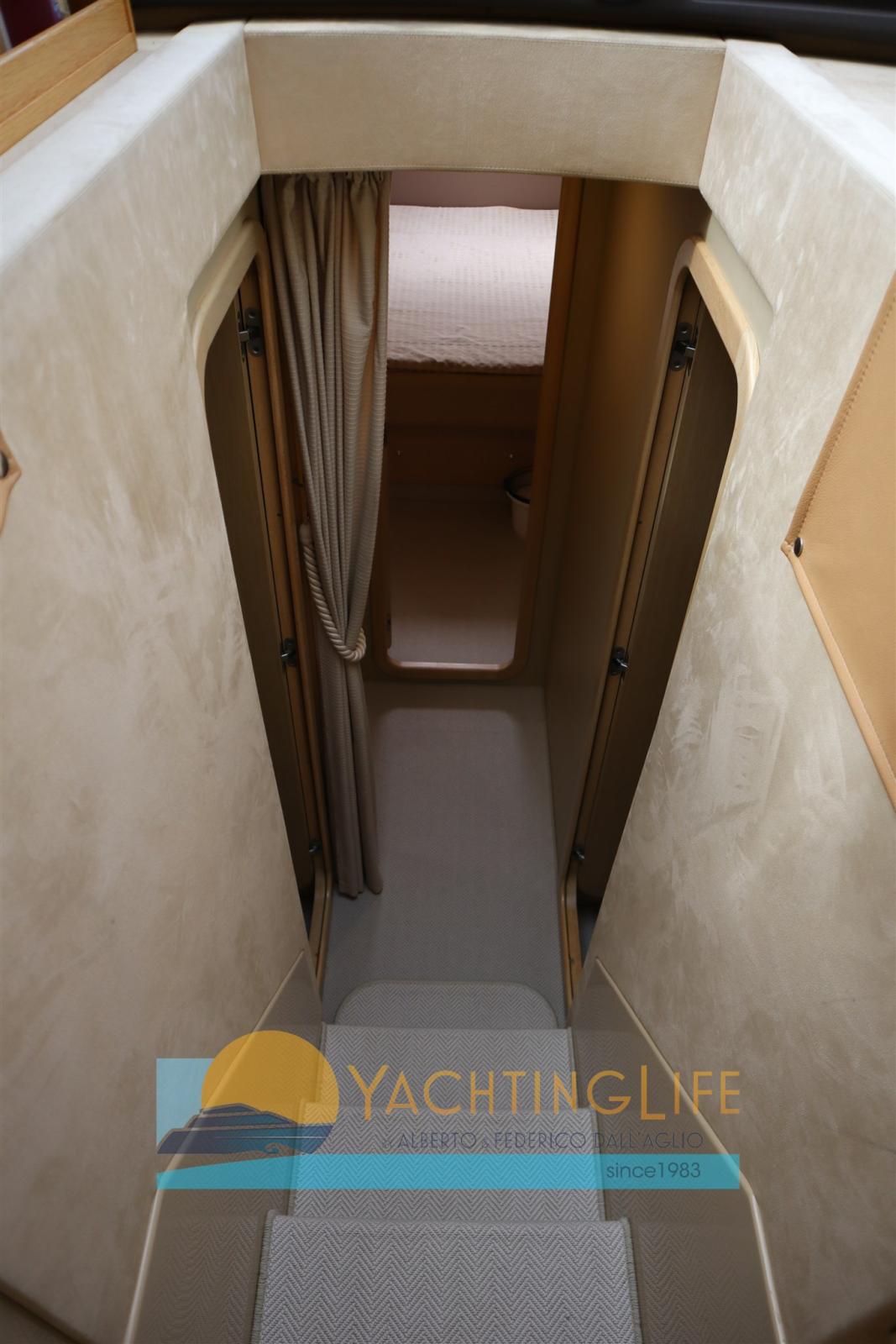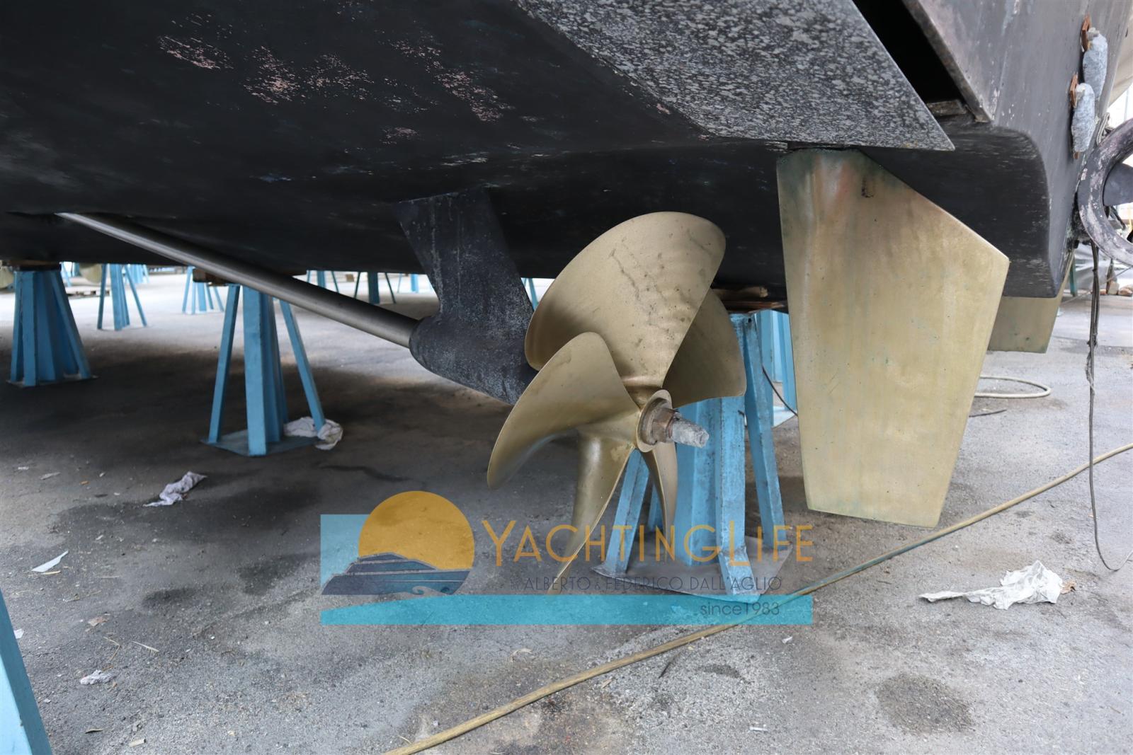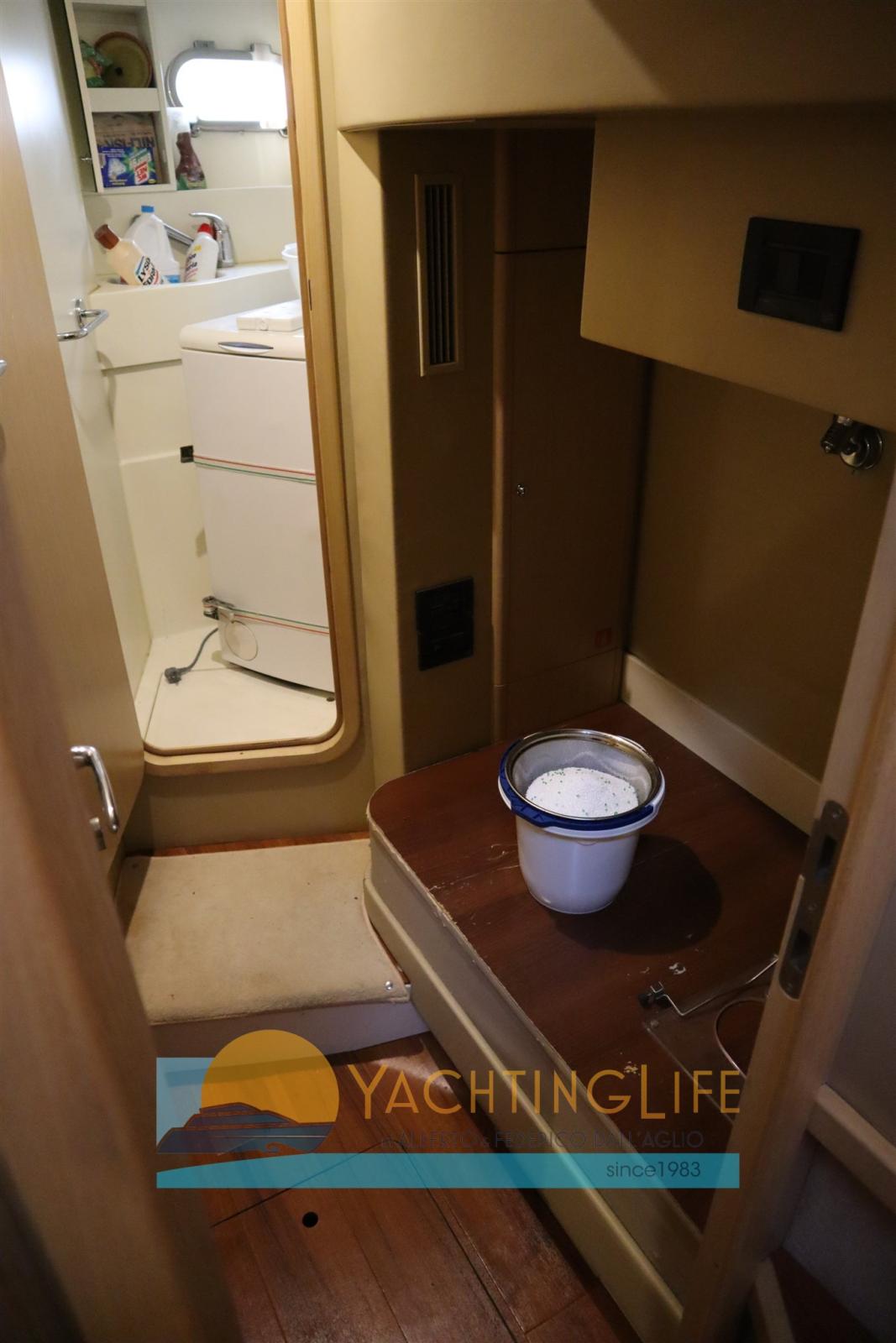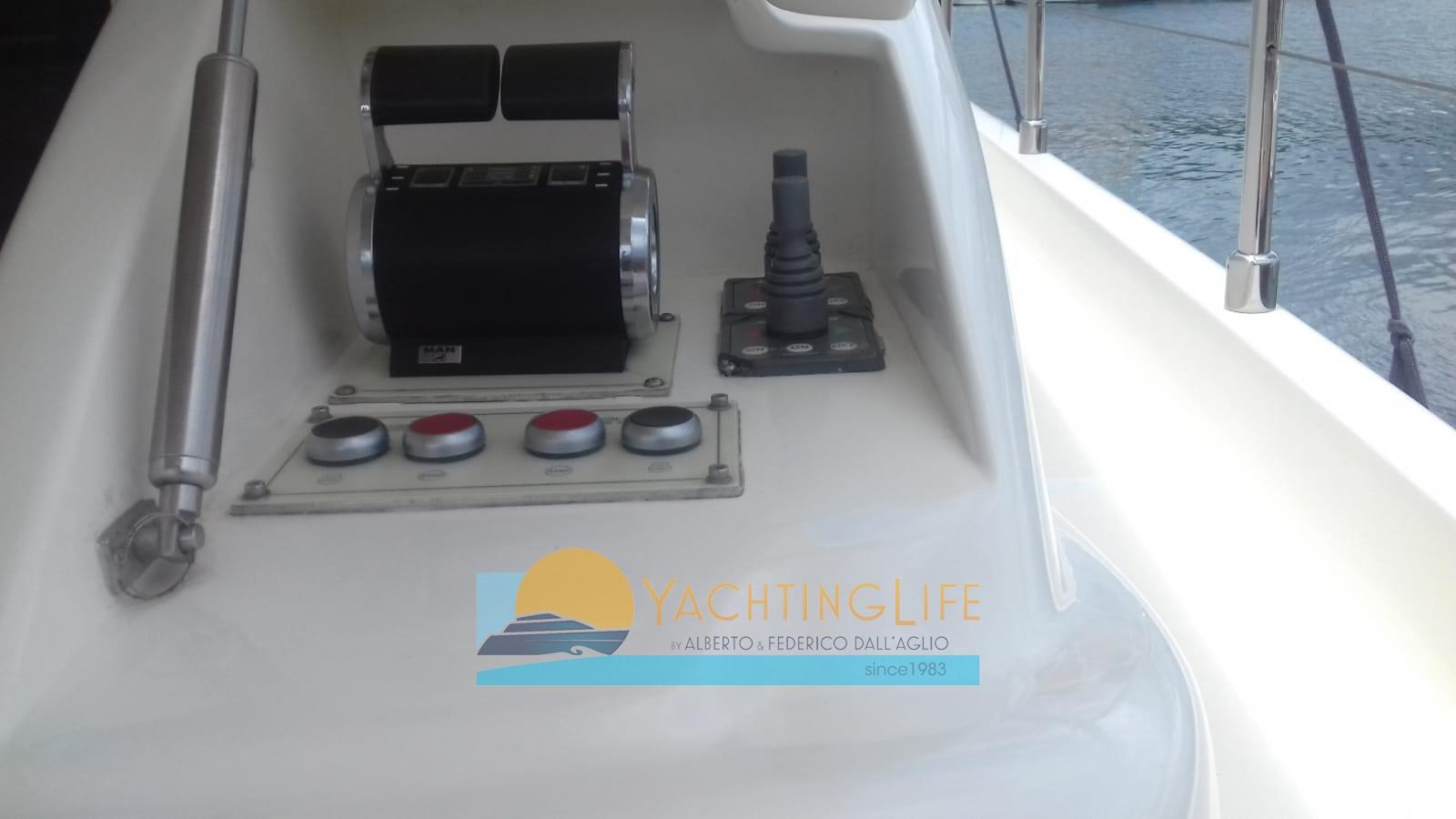 Engine Alarm, Bilge Alarm, Anchor (in acciaio), Water pressure pump, Deck Shower, Twin Steering, Directional Spotlight, Hydraulic Flaps, Fire Extinguishing System, Flaps Indicators, Anchor Chain Washdown, Washbasin in the cockpit, Courtesy Lights, Gangway (idraulica), Platform, Automatic Bilge Pump, Manual Bilge Pump, Entry door, Teak Cockpit, Shorepower connector, Voltage Rectifier, Rollbar, Electric Windlass, swimming ladder, cockpit table, Horn, Stern Winches.