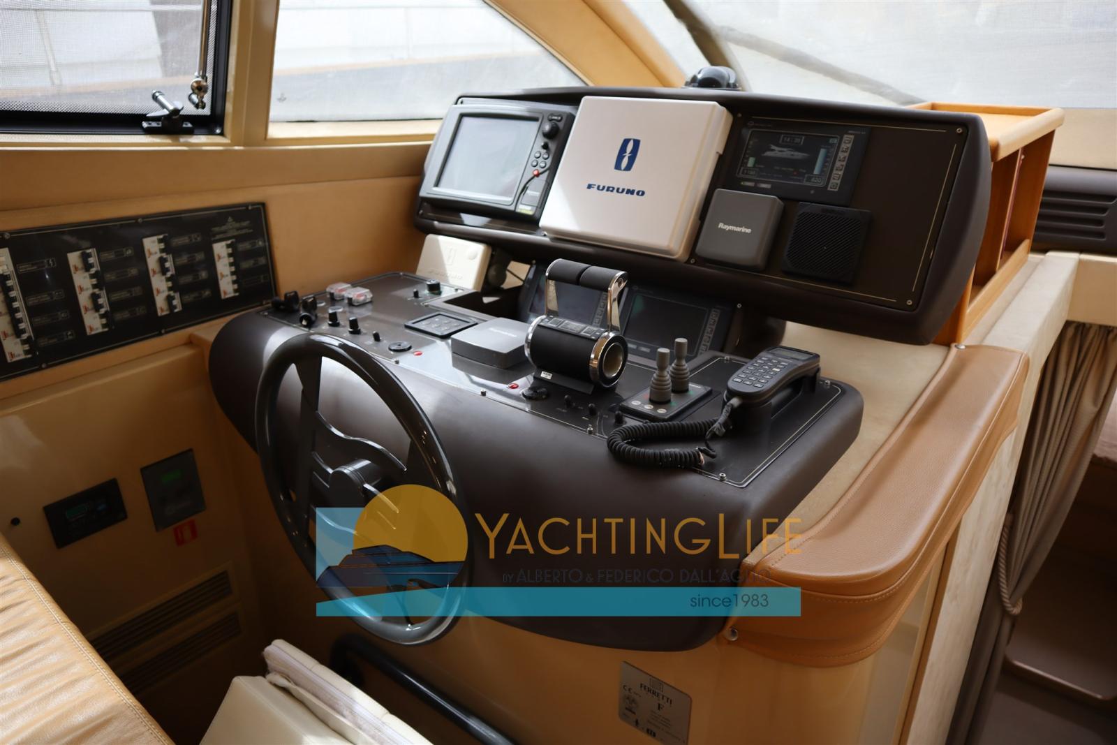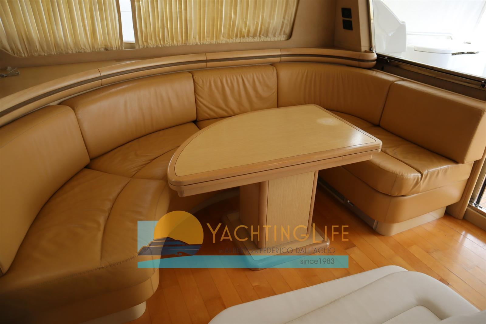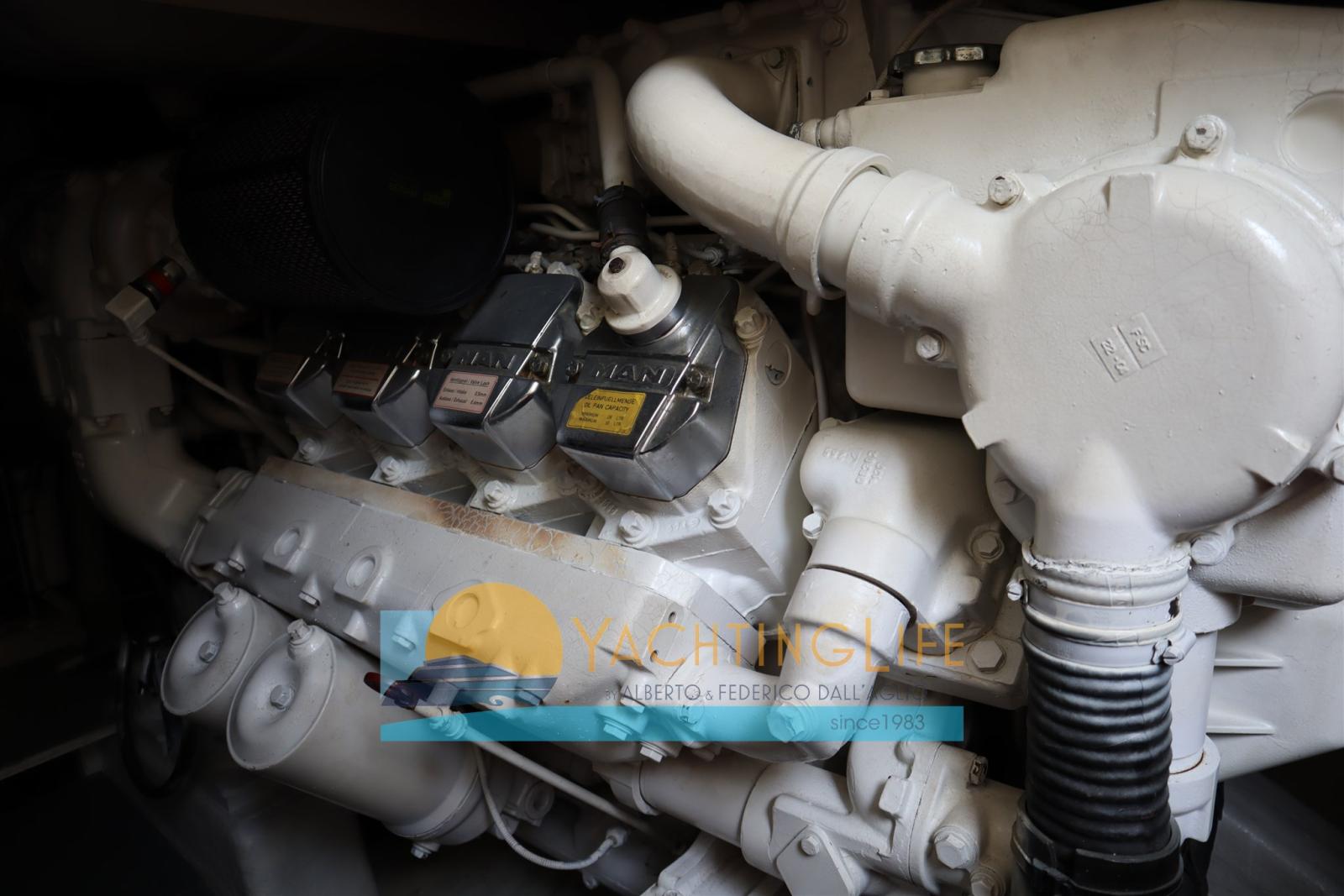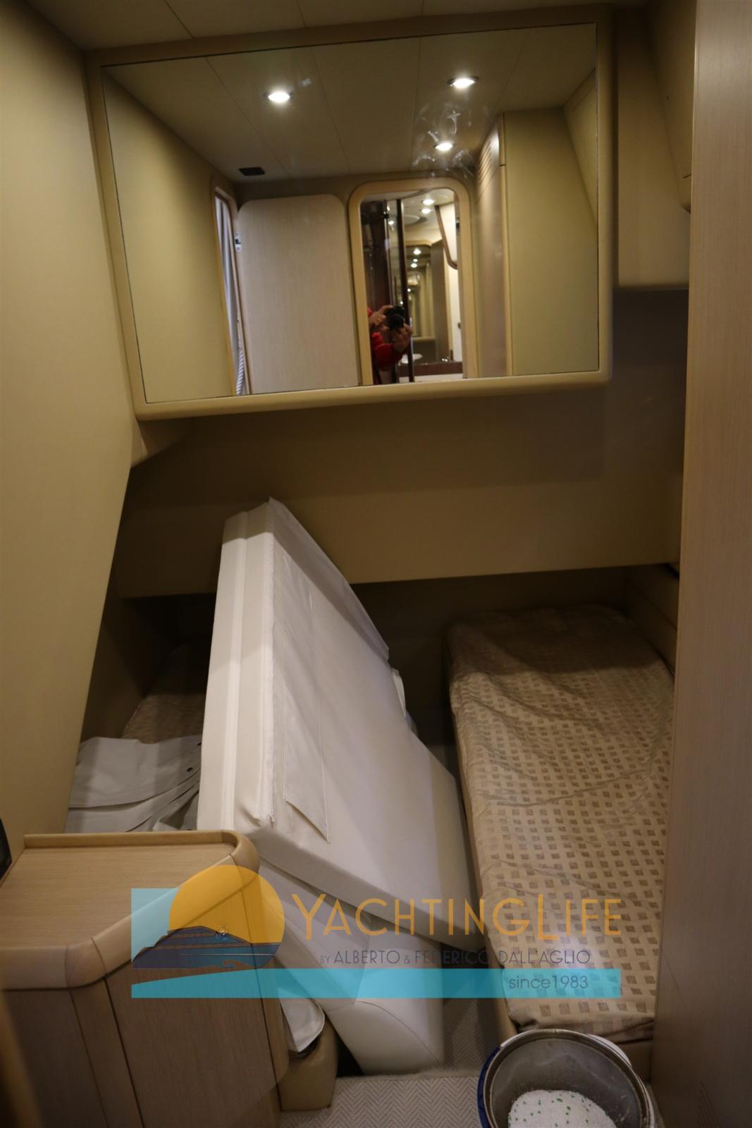 Engine Alarm, Bilge Alarm, Anchor (in acciaio), Water pressure pump, Deck Shower, Twin Steering, Directional Spotlight, Hydraulic Flaps, Fire Extinguishing System, Flaps Indicators, Anchor Chain Washdown, Washbasin in the cockpit, Courtesy Lights, Gangway (idraulica), Platform, Automatic Bilge Pump, Manual Bilge Pump, Entry door, Teak Cockpit, Shorepower connector, Voltage Rectifier, Rollbar, Electric Windlass, swimming ladder, cockpit table, Horn, Stern Winches.
