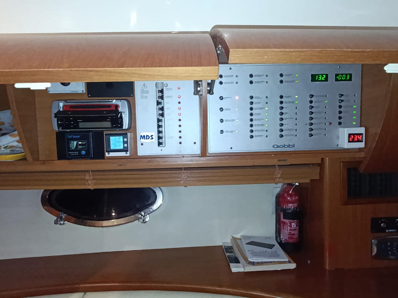 Warm Water System (bivalente), Inverter Air Conditioning, Watermaker (50lh), Fuel Tank Indicator, Water Tank Meter, Interior wooden floor, 12V Outlets, 220V Outlets, Black Water Tank, 2 Electric Toilet.
