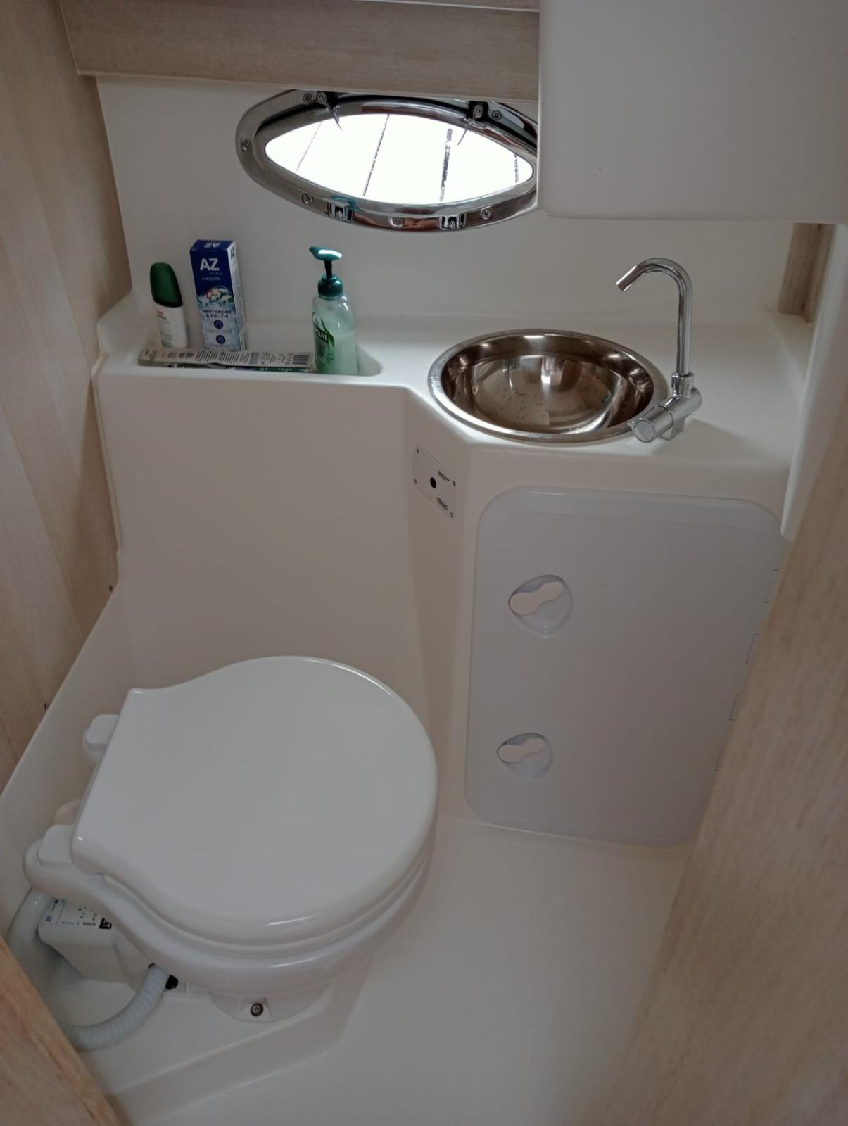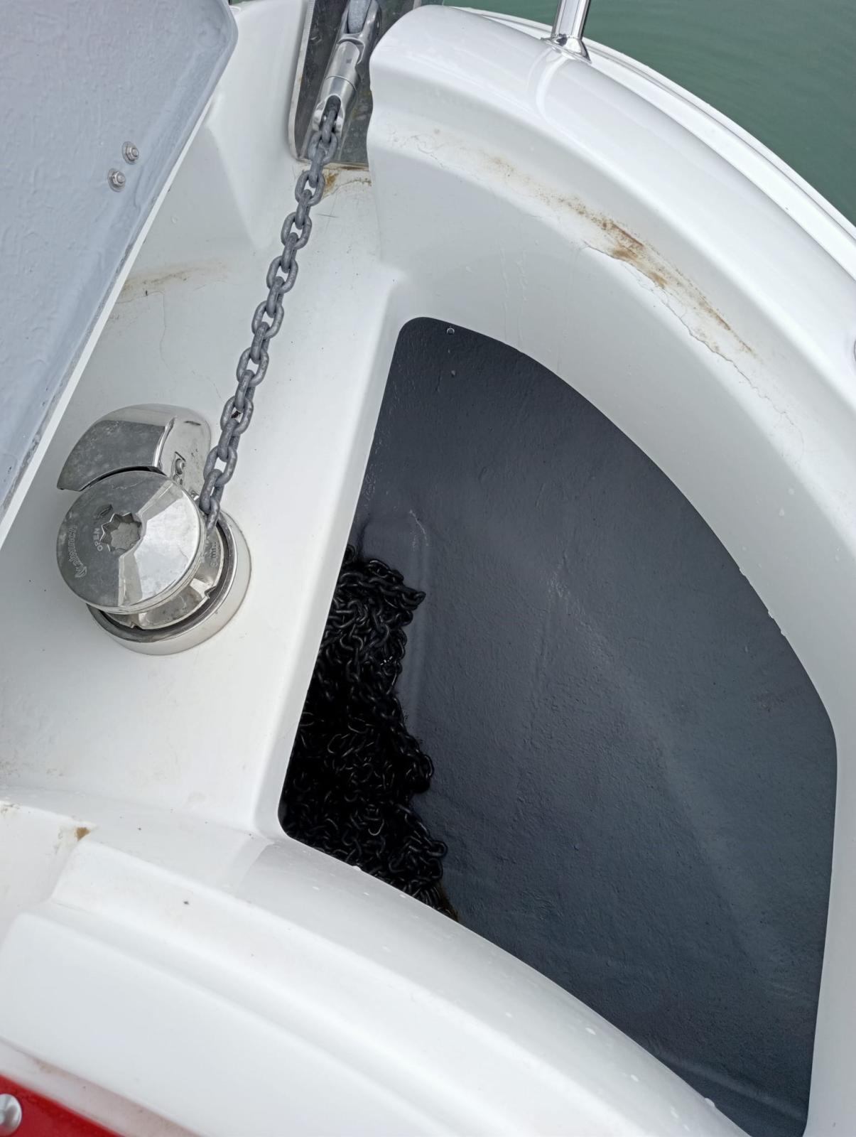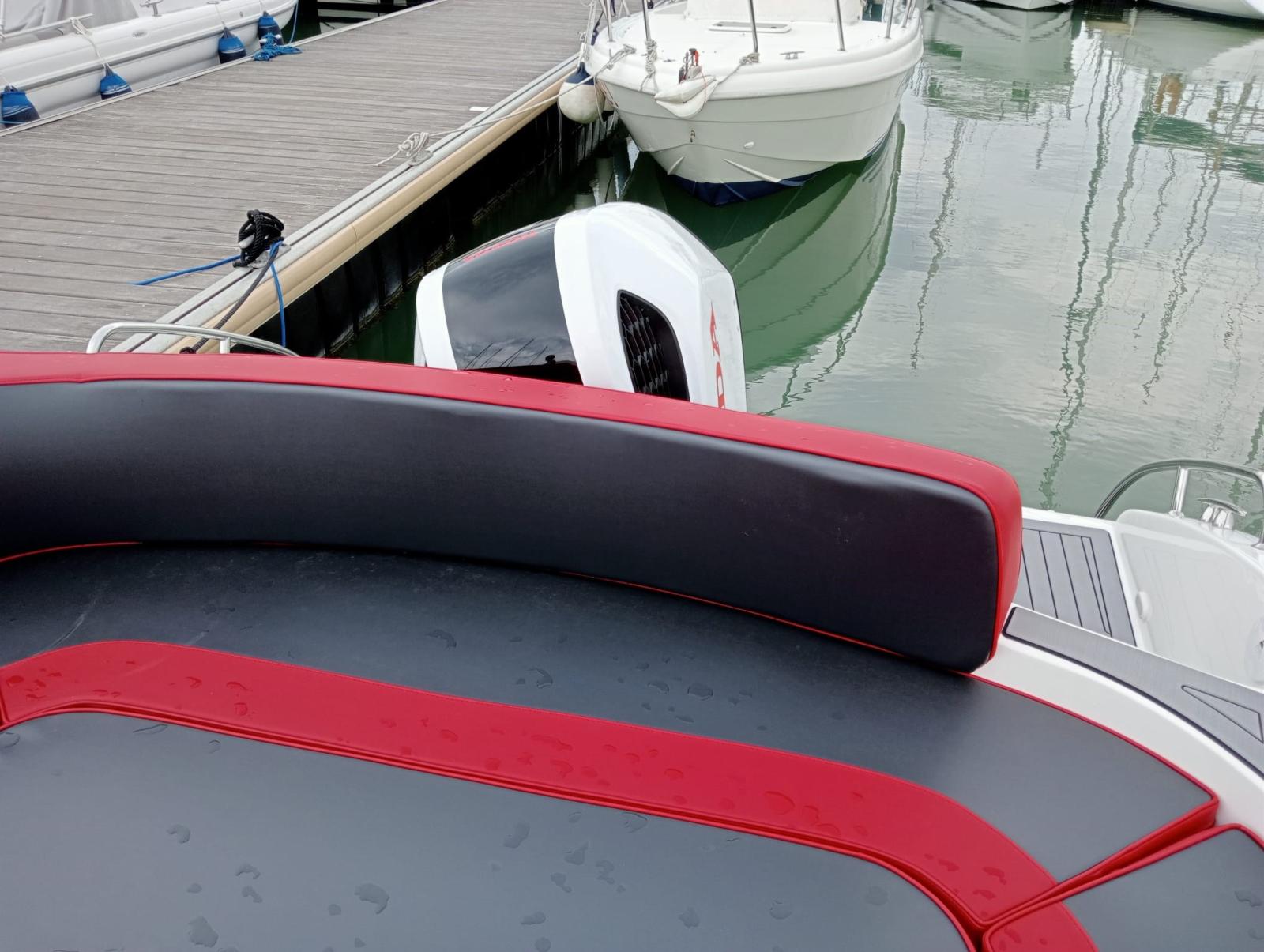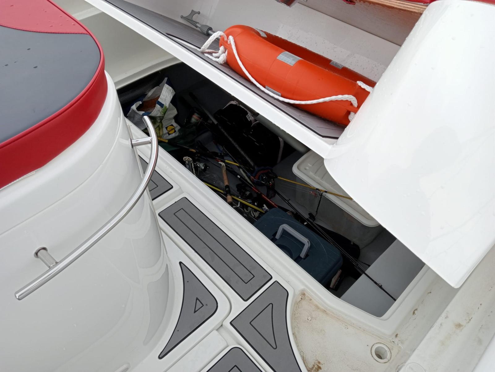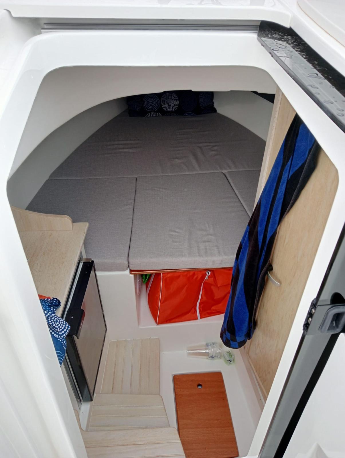 comfortable inside cabin with separate bathroom, complete internal and external cushions, large aft locker with electric opening.