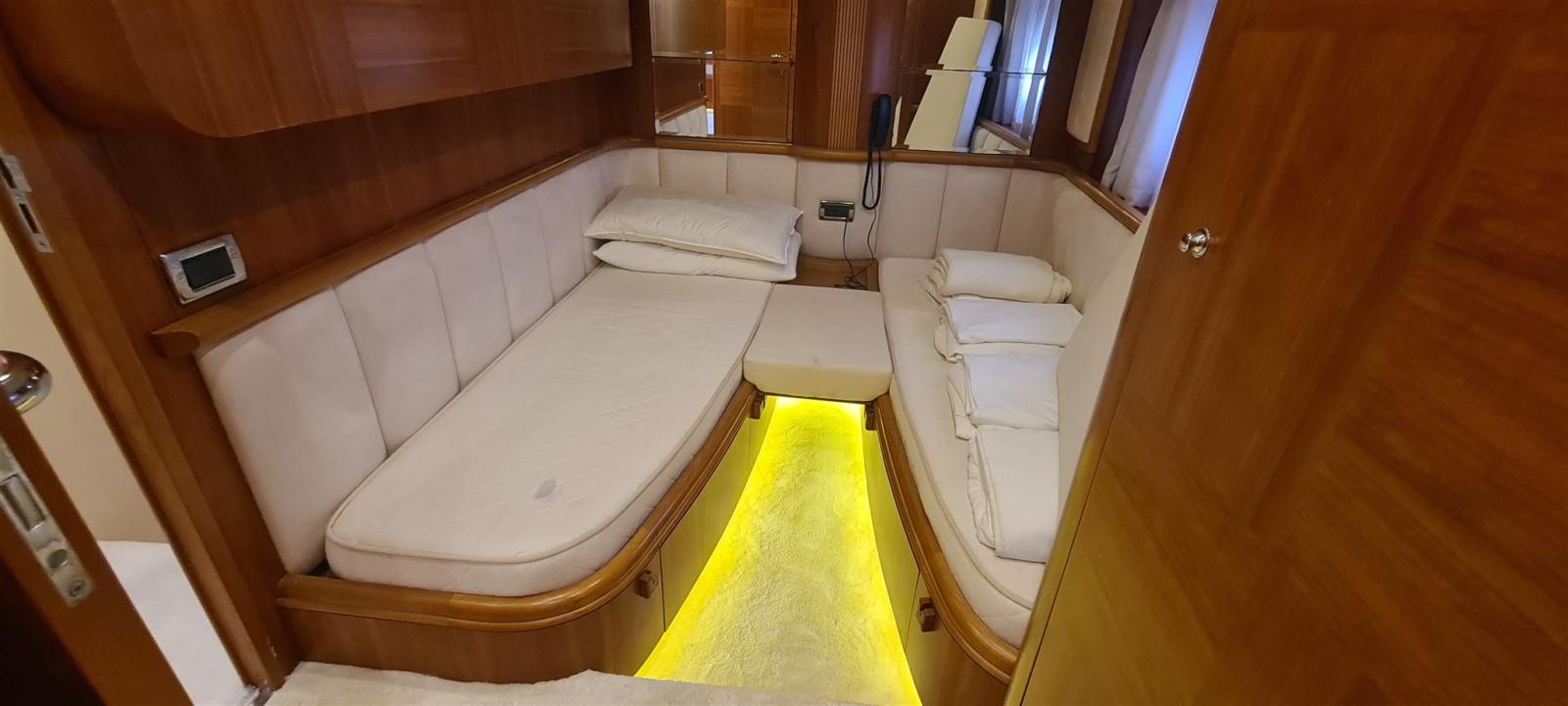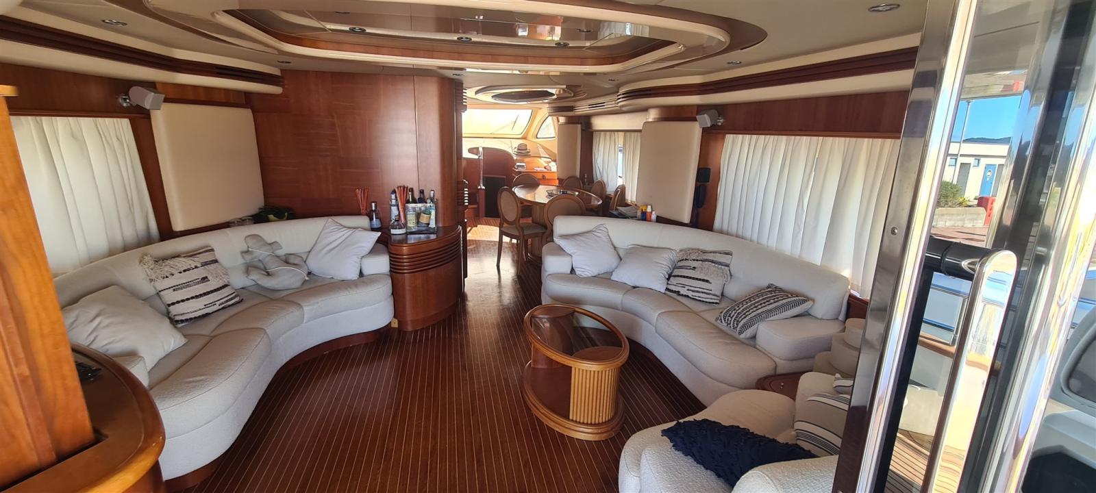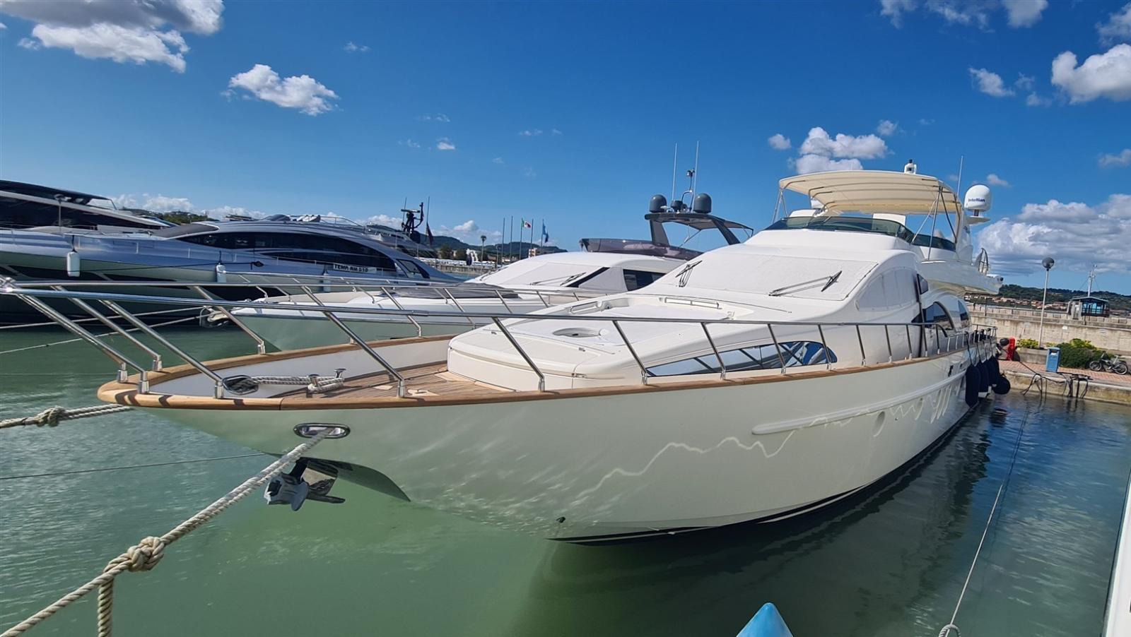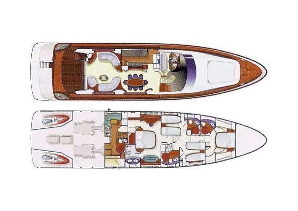 Fume/Gas Detector, Engine Alarm, Bilge Alarm, Anchor (con 100 m di catena da14), 2 Water pressure pump, 12 Batteries, Teak Side Decks, 2 Battery charger, Shore power cable, Deck Shower, Twin Steering, Stern Thruster (elettrica), Bow Thruster (idraulica), Headlights fixed on the stem, Directional Spotlight, 2 Electric Flaps, 2 Tender Garage, Davits for tender on fly (Opacmare), Fire Extinguishing System, Flaps Indicators, Anchor Chain Washdown, Courtesy Lights, Battery Monitor, Fenders, Gangway (IDRAULICA), Platform, Automatic Bilge Pump, Teak deck, Entry door, Teak Cockpit, 2 Shorepower connector, Water harbor connector system, Voltage Rectifier, Rollbar, Electric Windlass (Lofrans), swimming ladder, Saddles for tender, cockpit table (allungabile fisso in teack), Horn, 2 Stern Winches, Bow Winches.