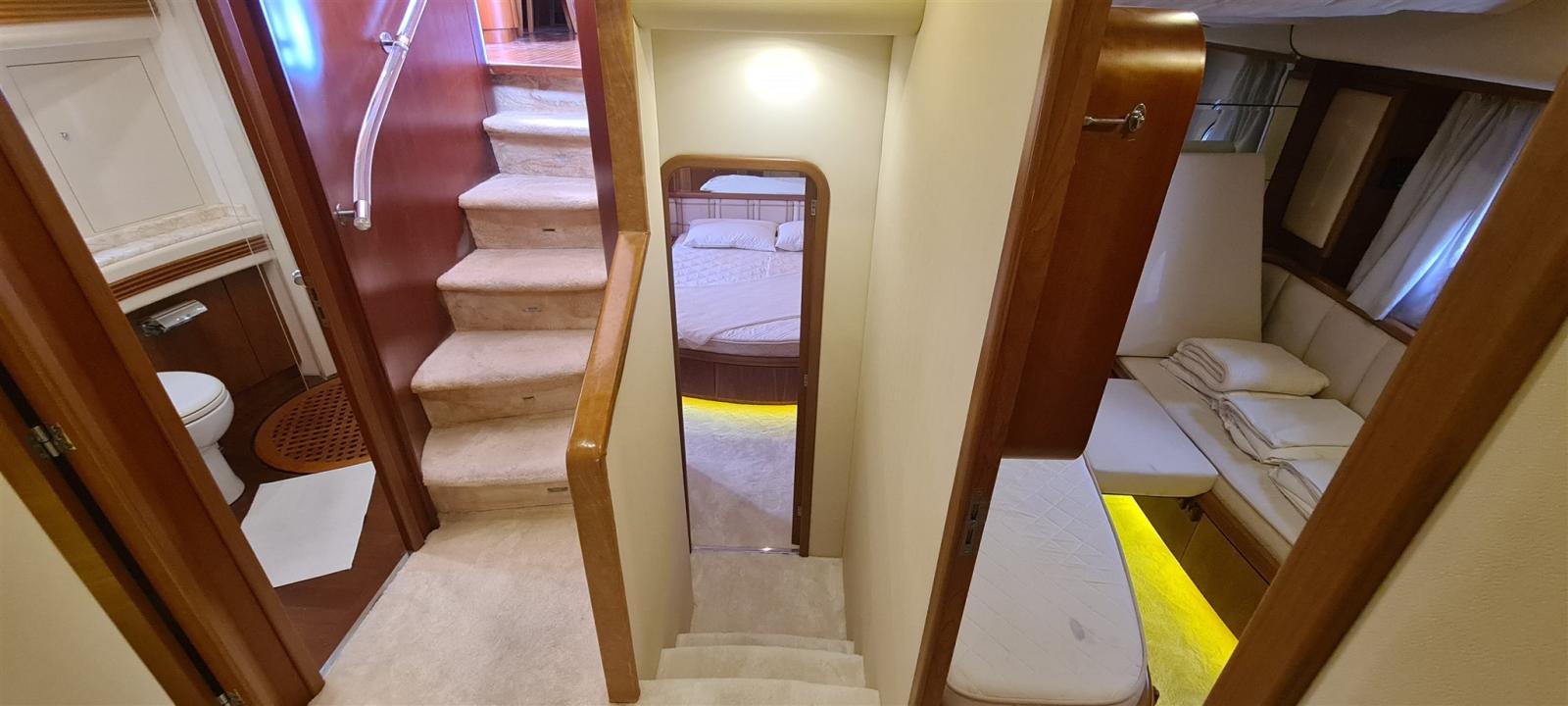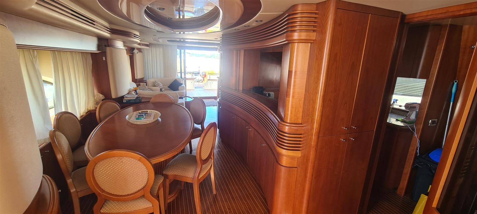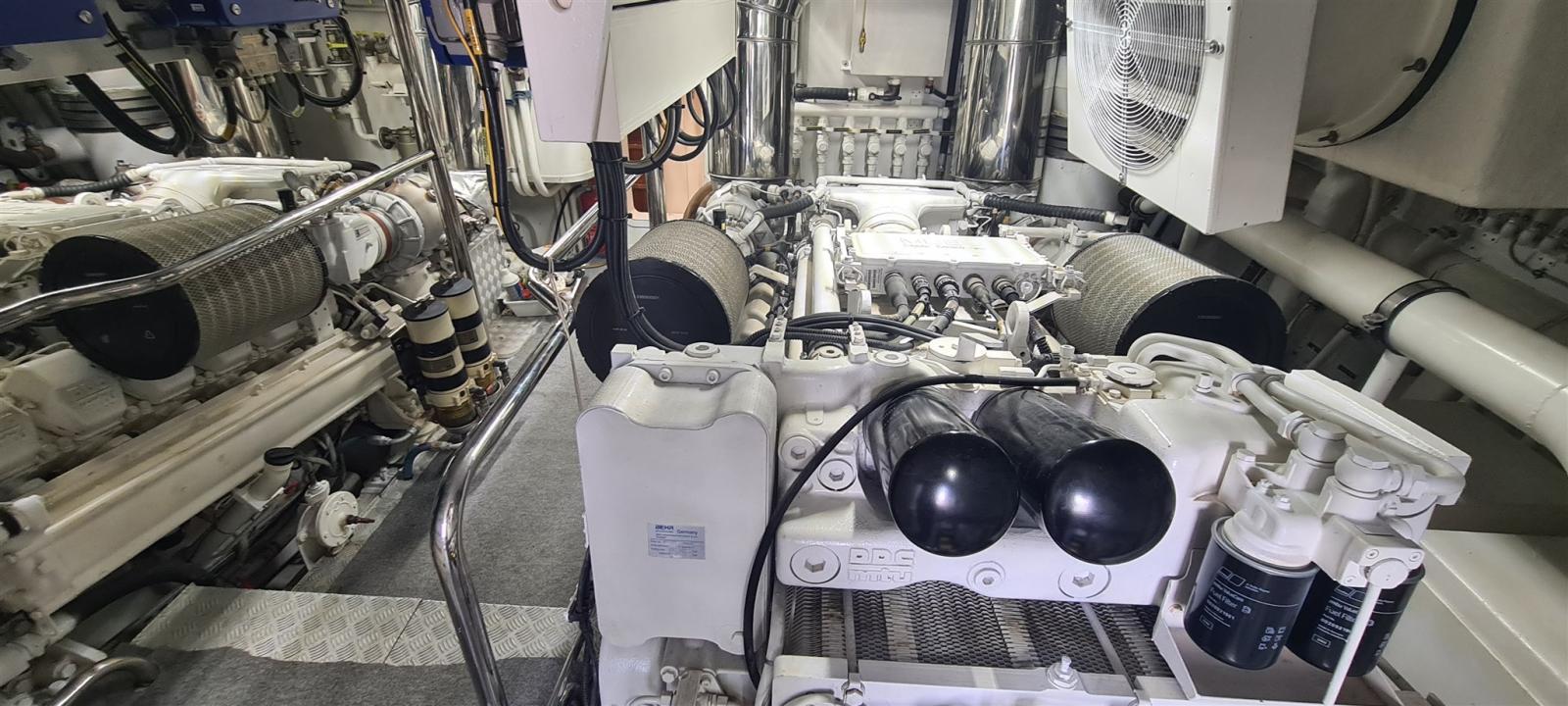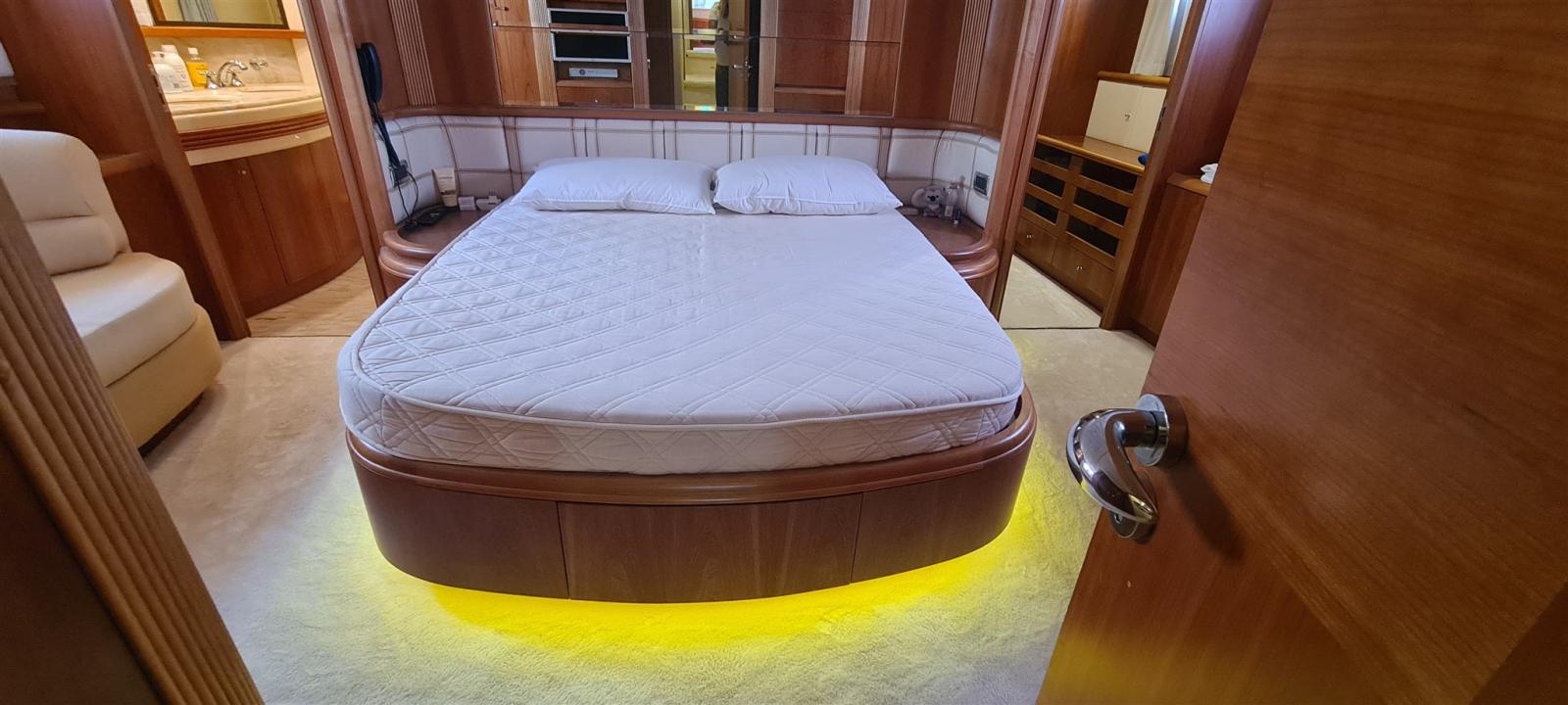 Fume/Gas Detector, Engine Alarm, Bilge Alarm, Anchor (con 100 m di catena da14), 2 Water pressure pump, 12 Batteries, Teak Side Decks, 2 Battery charger, Shore power cable, Deck Shower, Twin Steering, Stern Thruster (elettrica), Bow Thruster (idraulica), Headlights fixed on the stem, Directional Spotlight, 2 Electric Flaps, 2 Tender Garage, Davits for tender on fly (Opacmare), Fire Extinguishing System, Flaps Indicators, Anchor Chain Washdown, Courtesy Lights, Battery Monitor, Fenders, Gangway (IDRAULICA), Platform, Automatic Bilge Pump, Teak deck, Entry door, Teak Cockpit, 2 Shorepower connector, Water harbor connector system, Voltage Rectifier, Rollbar, Electric Windlass (Lofrans), swimming ladder, Saddles for tender, cockpit table (allungabile fisso in teack), Horn, 2 Stern Winches, Bow Winches.