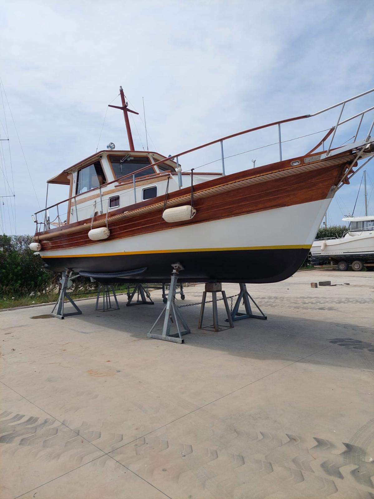 Fume/Gas Detector, Engine Alarm, Anchor (Bruce 15 Kg - 50mt catena 8mm), Water pressure pump, 3 Batteries (2 motori + 1 servizi), Teak Side Decks, Crane, Courtesy Lights, Gangway, Platform, 3 Electric Bilge Pump, Manual Bilge Pump, Entry door, Teak Cockpit, Shorepower connector, Electric Windlass (Lewmar 1000V), swimming ladder, Tender (+ Yamaha 4cv).