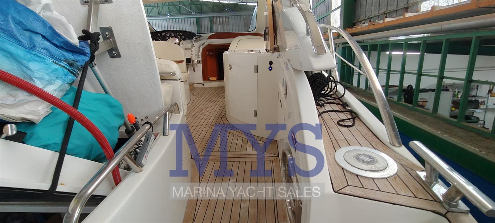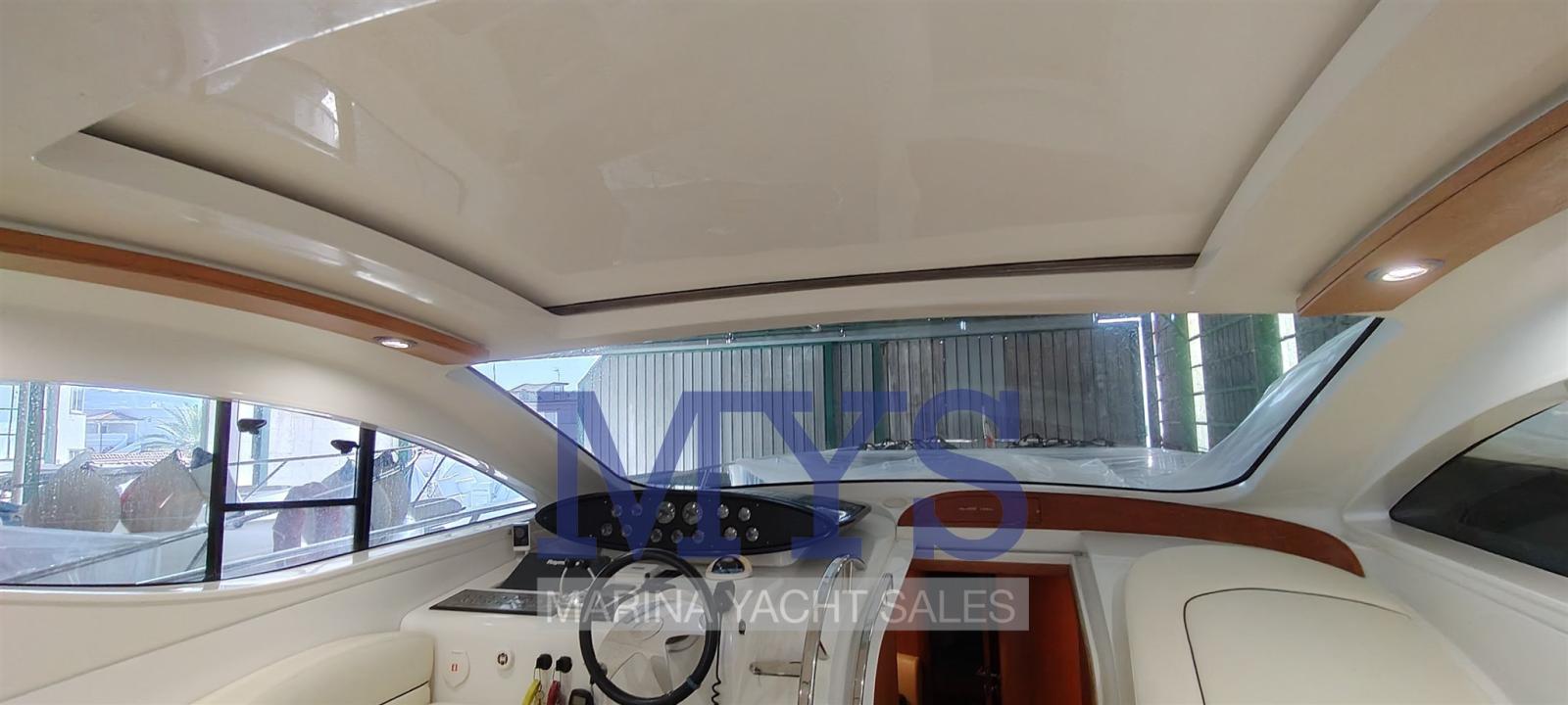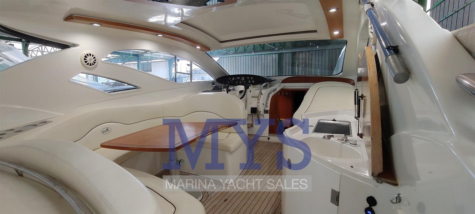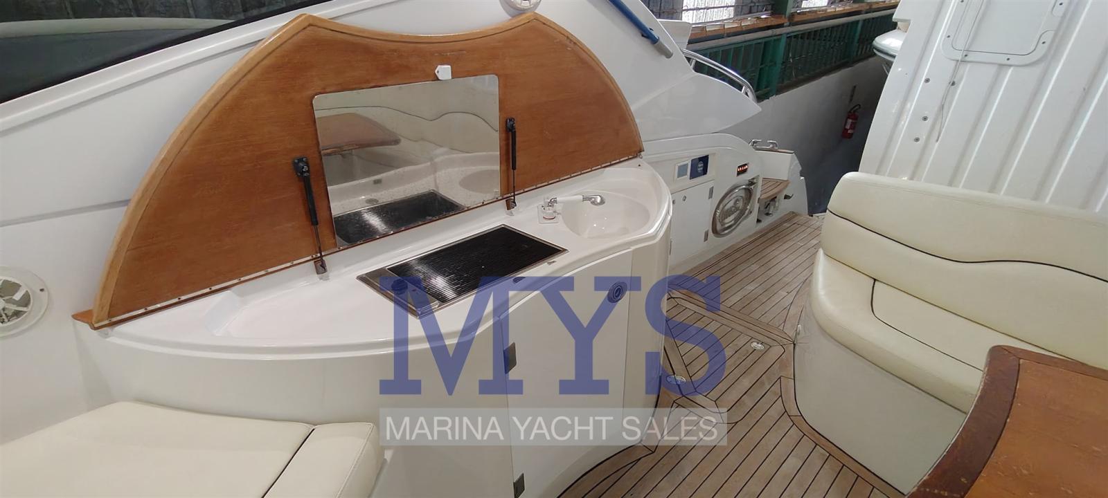 Bilge Alarm, Electric Engine Compartment Opening, Water pressure pump, Teak Side Decks, Shore power cable, Guard rail, Deck Shower, Directional Spotlight, Electric Flaps, Tender Garage, Hard top (apribile elettricamente), Flaps Indicators, Washbasin in the cockpit, Courtesy Lights (interne), Underwater lights, Gangway (gandola), Platform, Entry door, Teak Cockpit, Shorepower connector, Water harbor connector system, Electric Windlass, swimming ladder, cockpit table, Living Room Foldable Table, Horn.