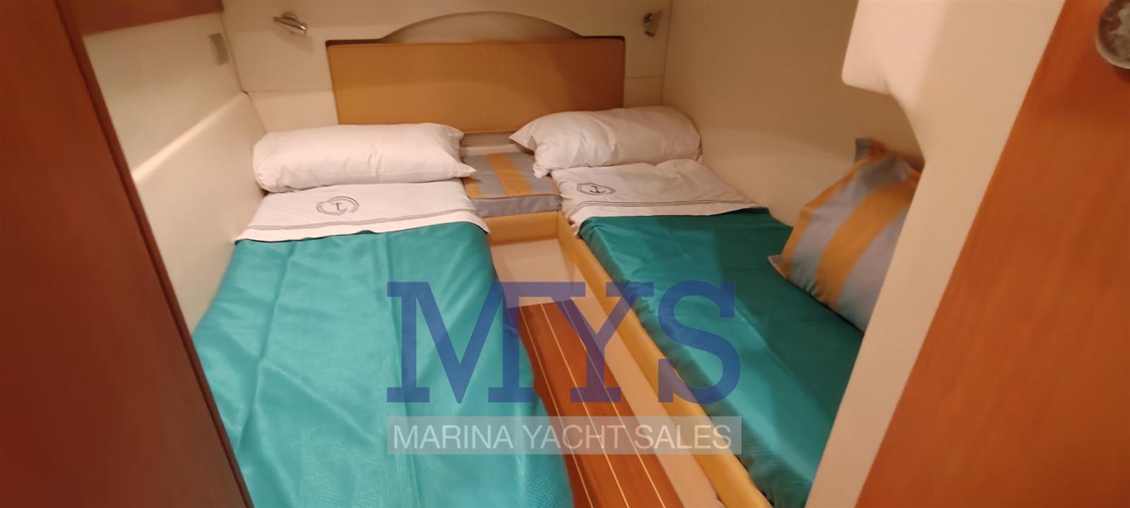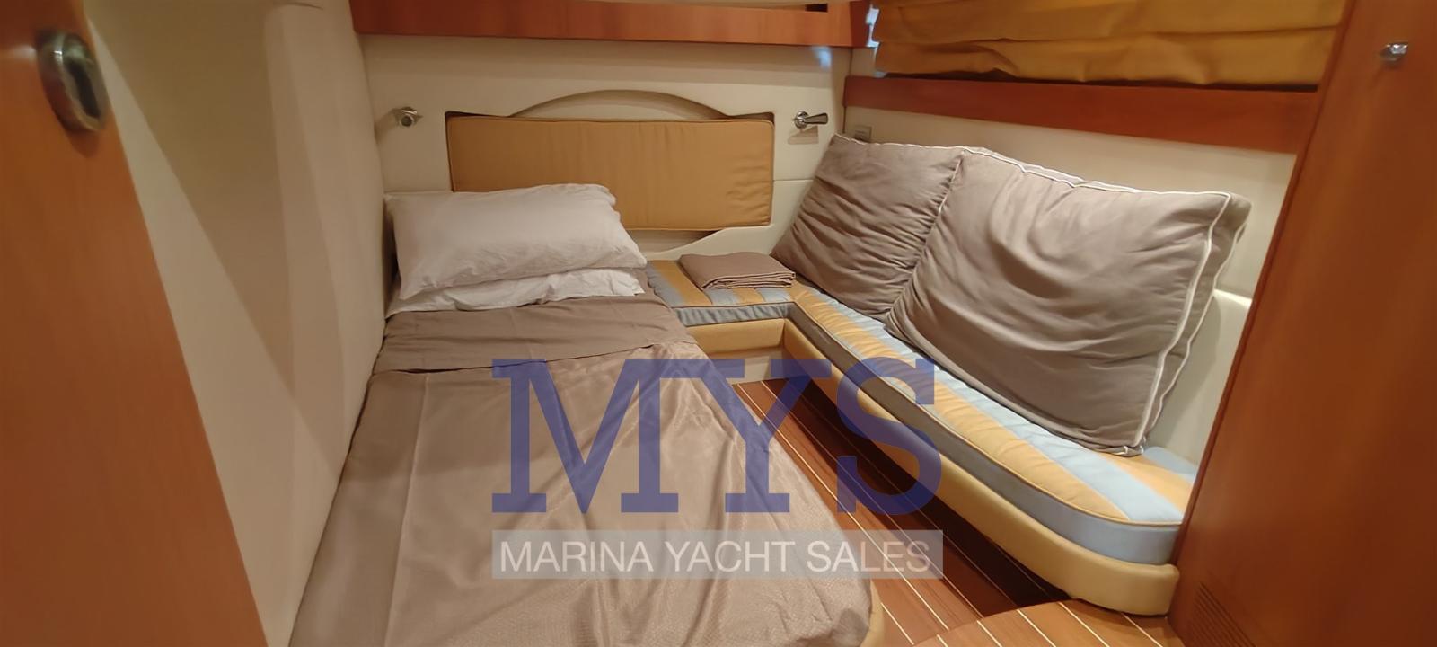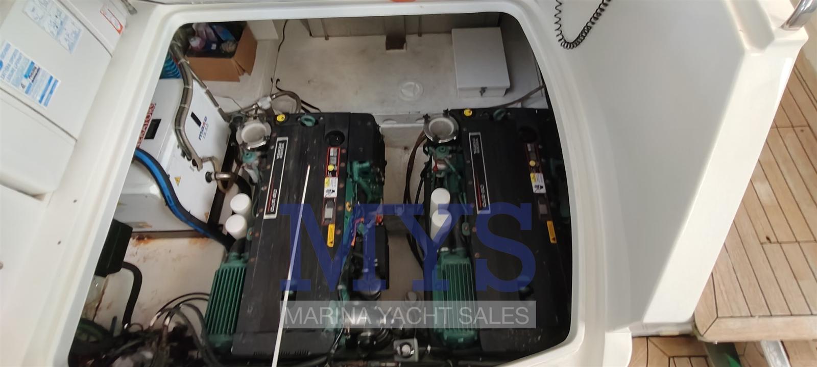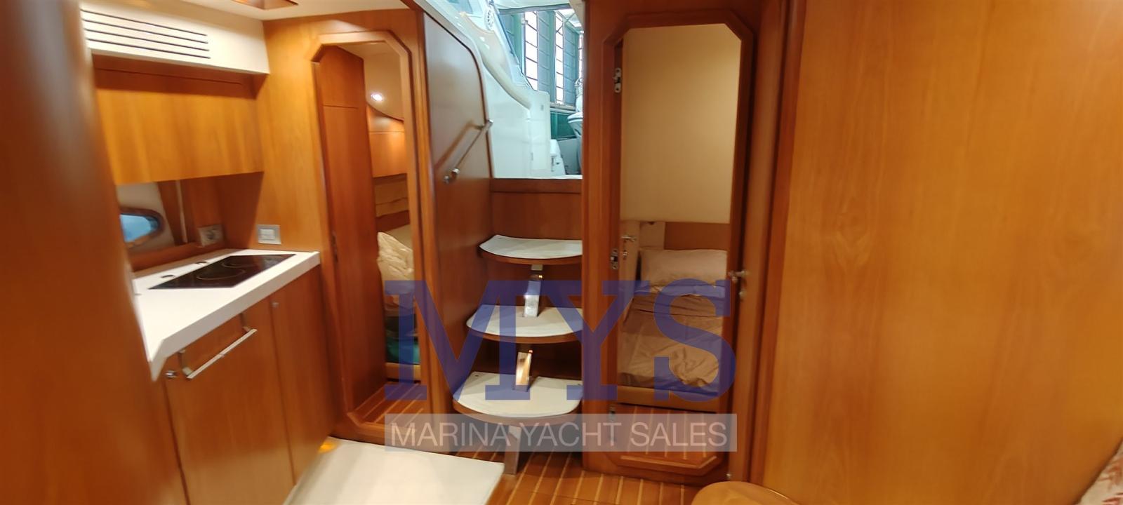 Bilge Alarm, Electric Engine Compartment Opening, Water pressure pump, Teak Side Decks, Shore power cable, Guard rail, Deck Shower, Directional Spotlight, Electric Flaps, Tender Garage, Hard top (apribile elettricamente), Flaps Indicators, Washbasin in the cockpit, Courtesy Lights (interne), Underwater lights, Gangway (gandola), Platform, Entry door, Teak Cockpit, Shorepower connector, Water harbor connector system, Electric Windlass, swimming ladder, cockpit table, Living Room Foldable Table, Horn.