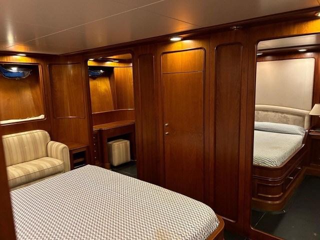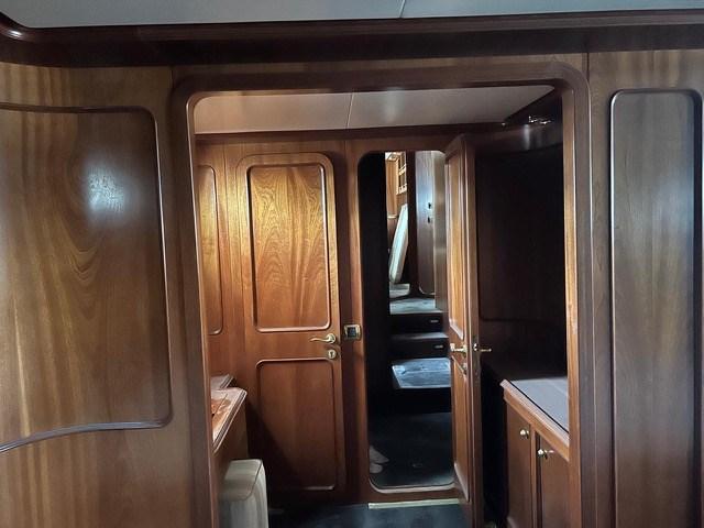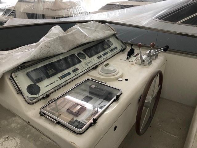 Engine Alarm, Bilge Alarm, Water pressure pump, Teak Side Decks, Deck Shower, Twin Steering, Directional Spotlight, Hydraulic Flaps (N°2), Crane, Fire Extinguishing System, Anchor Chain Washdown, Gangway (IDRAULICA TELESCOPICA), Platform, Manual Bilge Pump, Entry door, Teak Cockpit, Shorepower connector, Water harbor connector system, Voltage Rectifier, Rollbar, Electric Windlass, swimming ladder, cockpit table, Tender, Horn, Bow Winches.