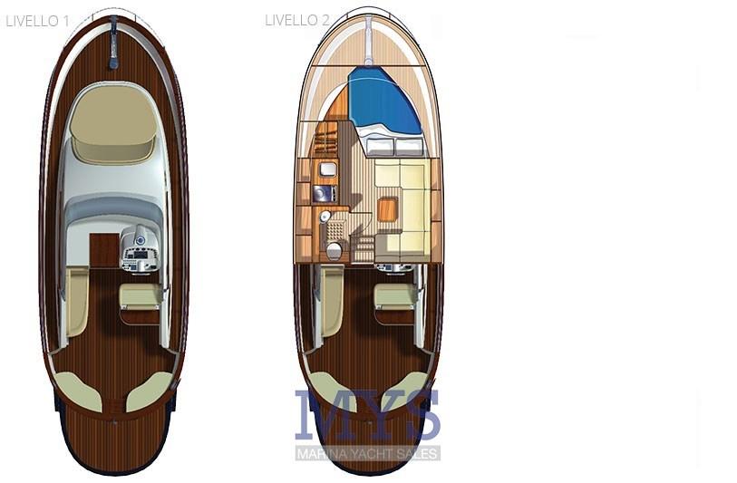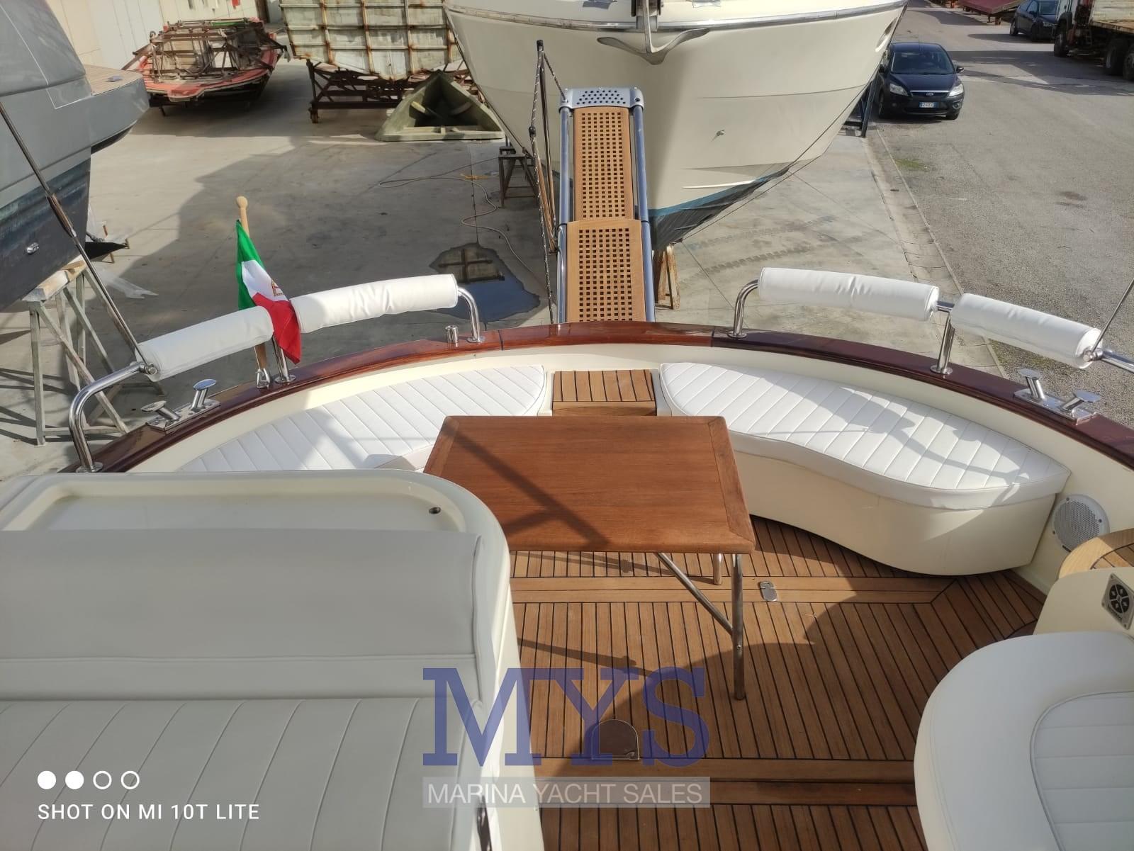 Engine Alarm, Bilge Alarm, Water pressure pump, Teak Side Decks (rifatti 2025), Guard rail, Deck Shower, Hydraulic Flaps (Zipwake), Washbasin in the cockpit, Courtesy Lights, Underwater lights, Gangway, Platform, Entry door, Teak Cockpit (rifatto 2025), Shorepower connector, Electric Windlass, swimming ladder, cockpit table, Horn.