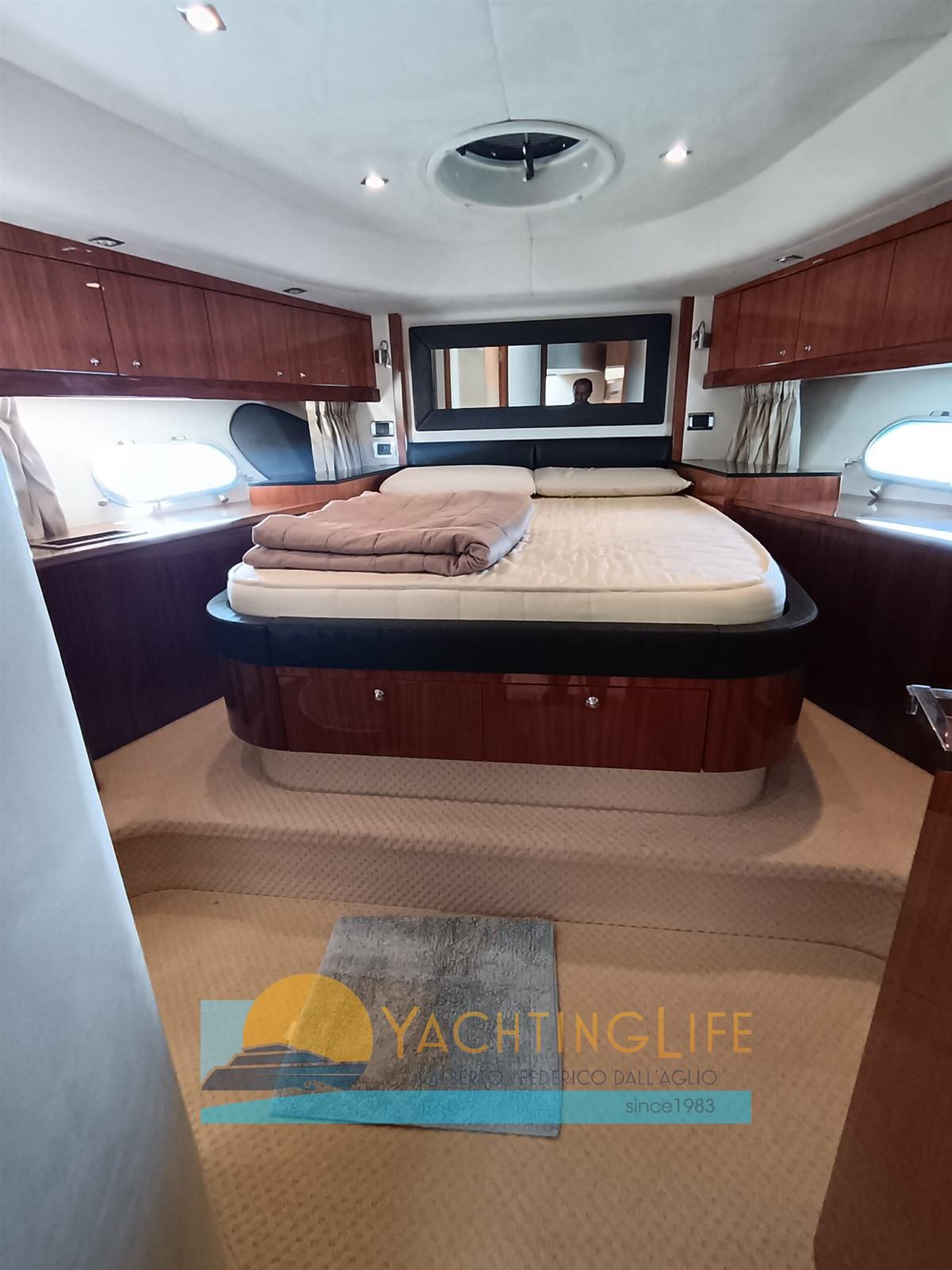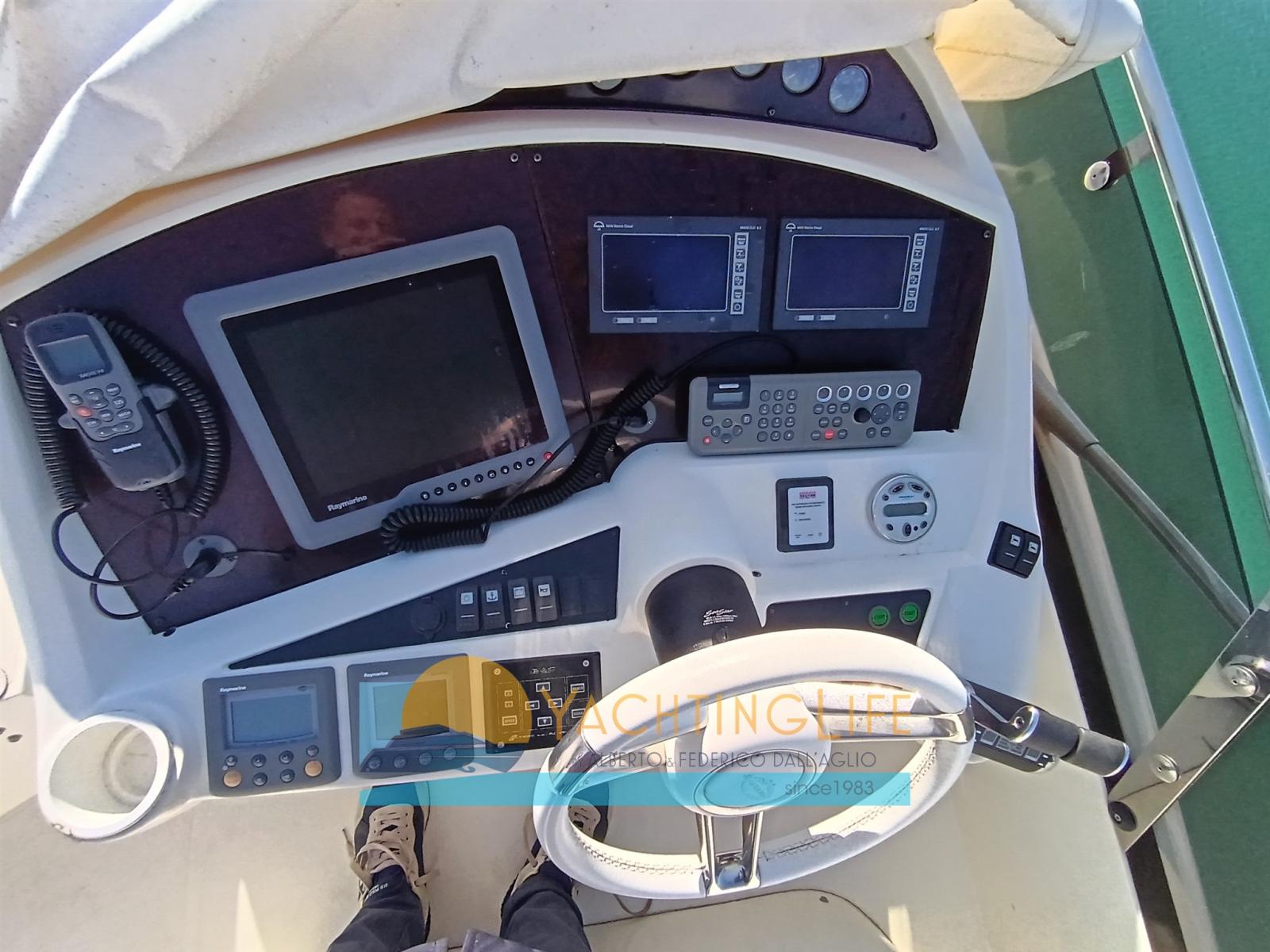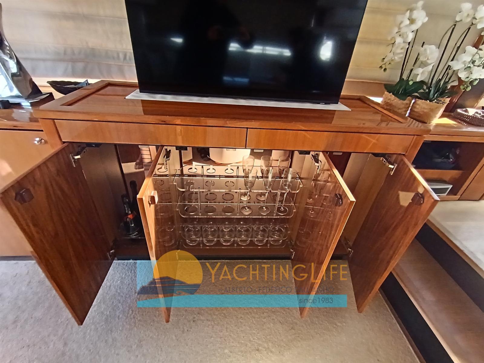Engine Alarm, Bilge Alarm, Water pressure pump, Deck Shower, Twin Steering, Directional Spotlight, Hydraulic Flaps, Fire Extinguishing System, Underwater lights, Auxiliary Engine, Gangway (Idraulica), Platform (Idraulica), Automatic Bilge Pump, Manual Bilge Pump, Entry door, Side door, Teak Cockpit, Shorepower connector (Con avvolgitore), Water harbor connector system, Rollbar, Electric Windlass, swimming ladder, Horn, 2 Stern Winches.