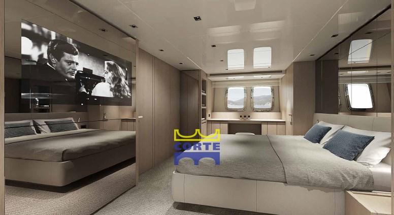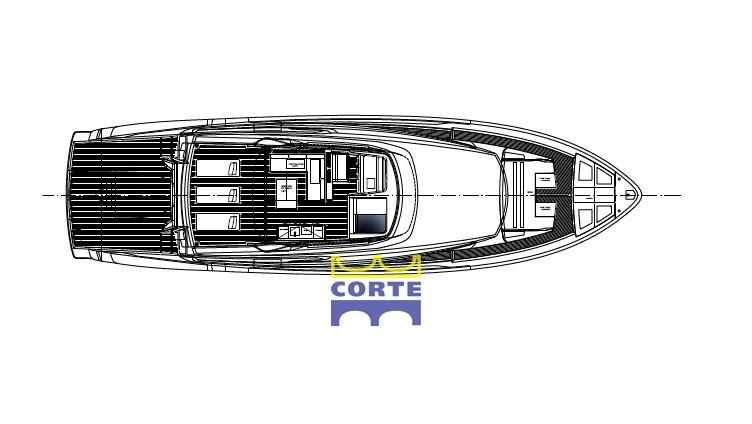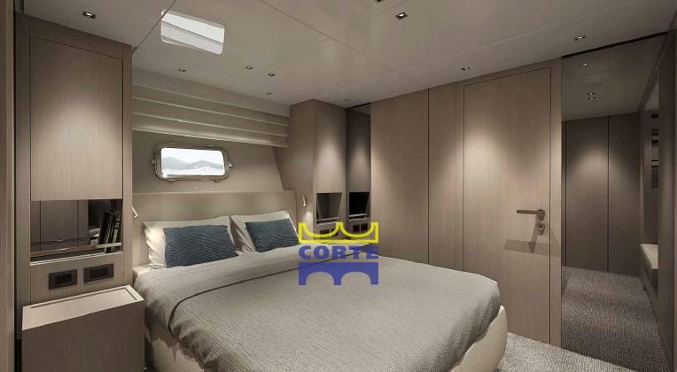 Cushions, Stern Cushions, Bow Cushions, Fly Bridge Cuscions, Cockpit Cushions, Blackout Curtains (elettrici a rullo per oblò cabina master), Sunshade (fly a poppa dell'hard top).