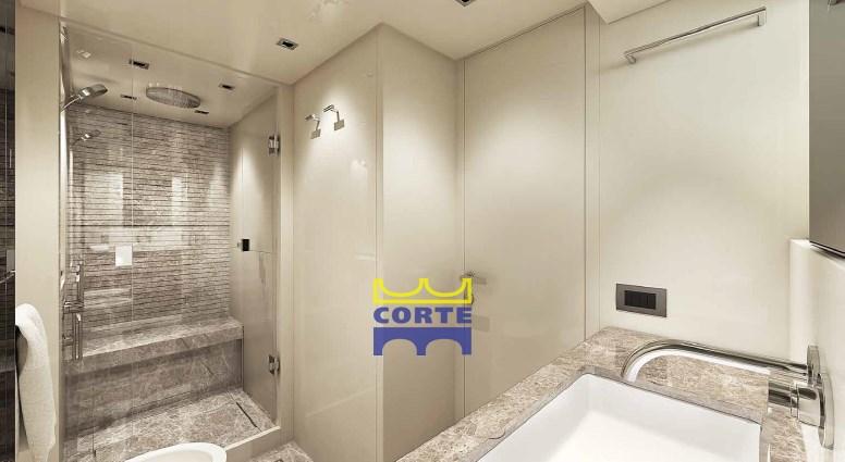 The owner's suite located in the center of the ship, with walk-in closet and bathroom with shower.