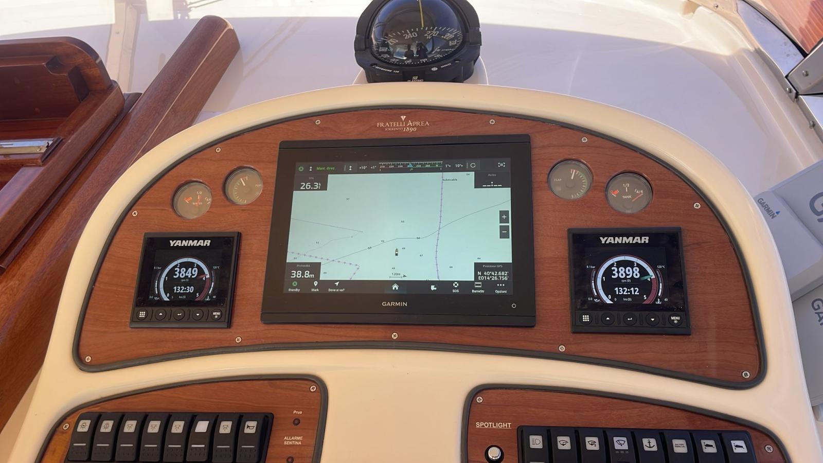 Engine Alarm, Water pressure pump, 6 Batteries, Draining System, Teak Side Decks, Deck Shower, Directional Spotlight, Hydraulic Flaps, Fire Extinguishing System, Flaps Indicators, Fenders, Gangway (idraulica), Platform, 4 Automatic Bilge Pump, 2 Manual Bilge Pump, Teak deck, Teak Cockpit, Shorepower connector, Electric Windlass, swimming ladder, cockpit table.