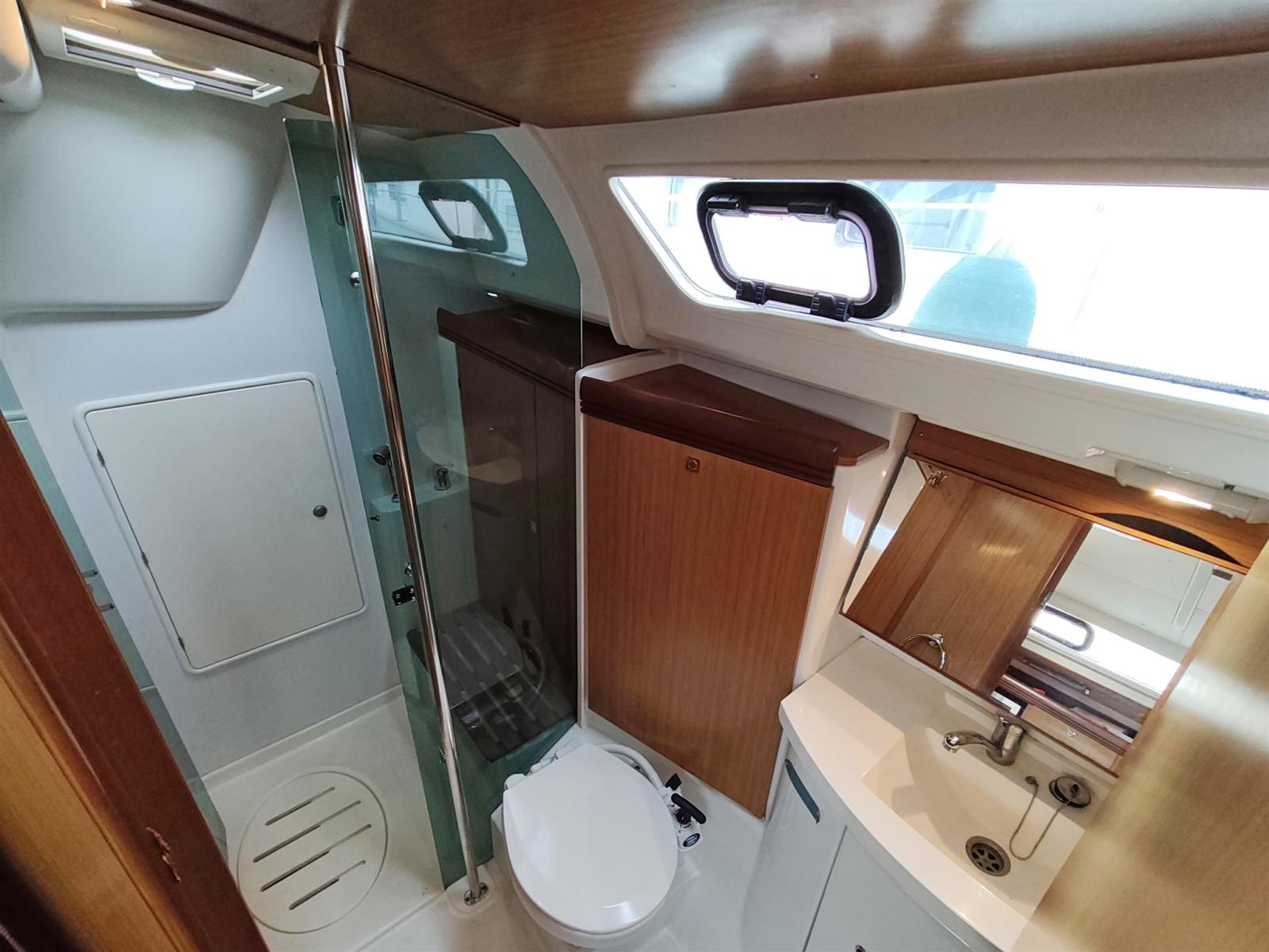 Aft bathroom on the left side complete with sink, electric toilet and separate shower cubicle
