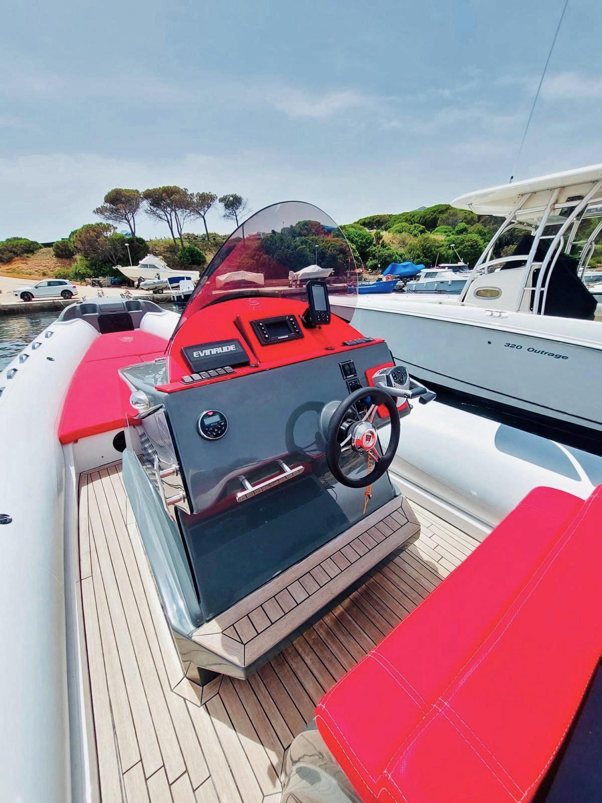 High-end inflatable boat designed for day trips, characterized by a sporty layout with a high-performance hull suitable for comfortable cruising speeds.