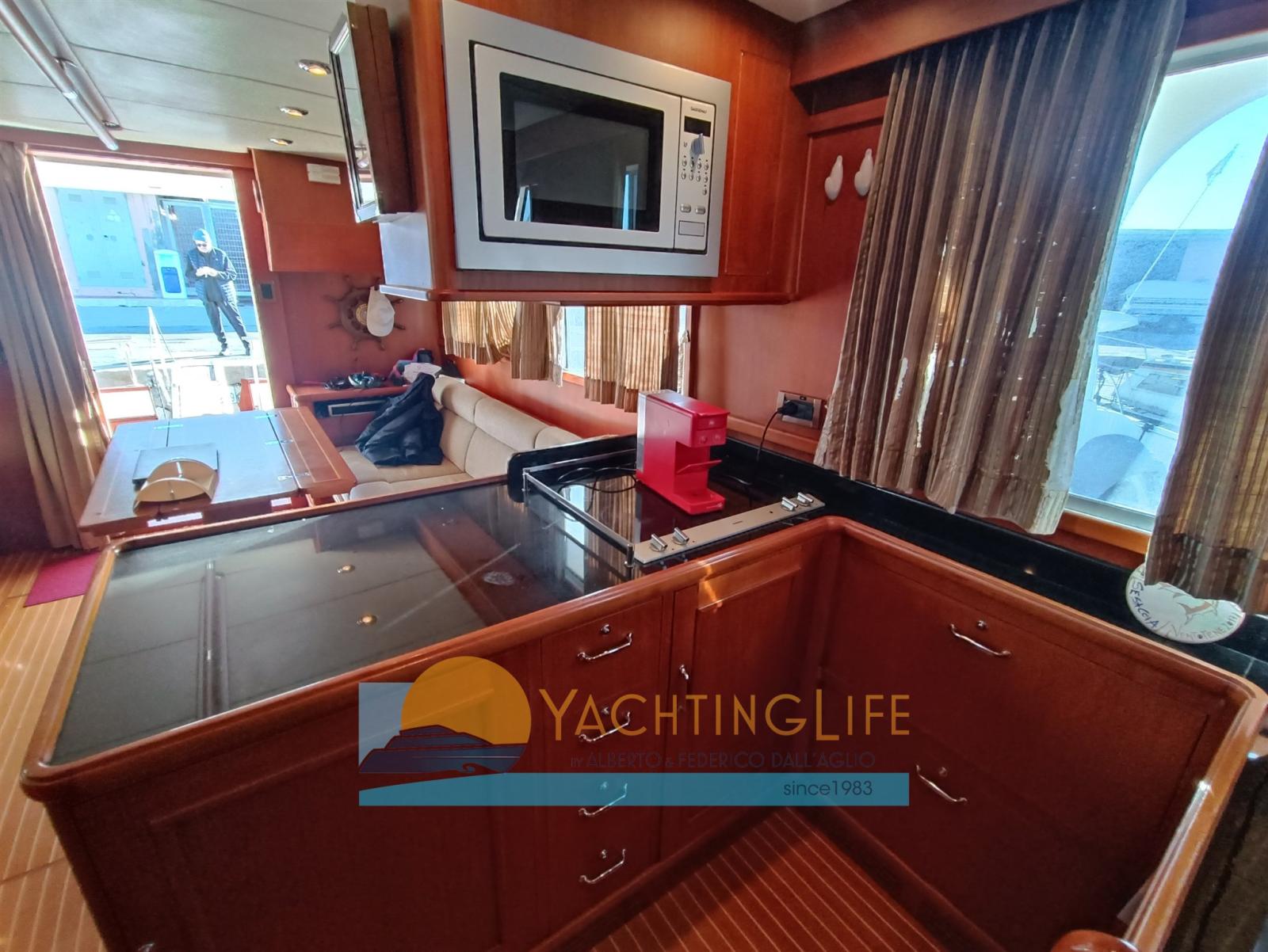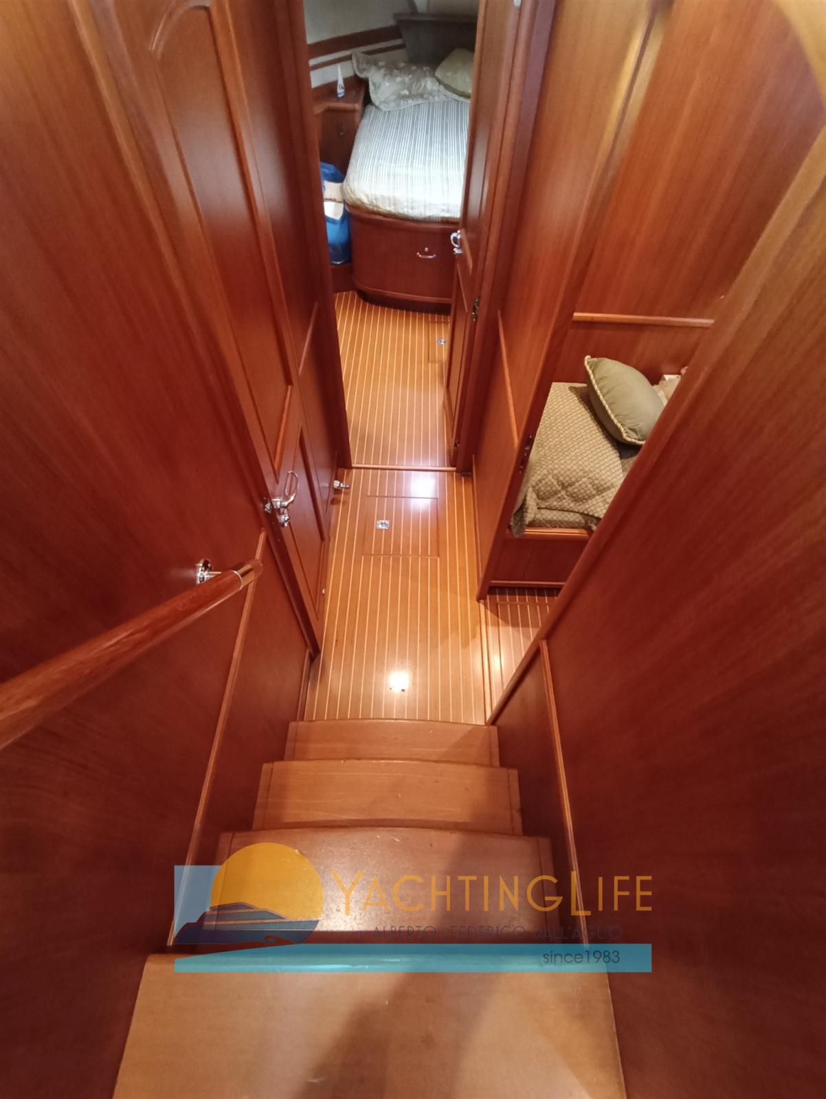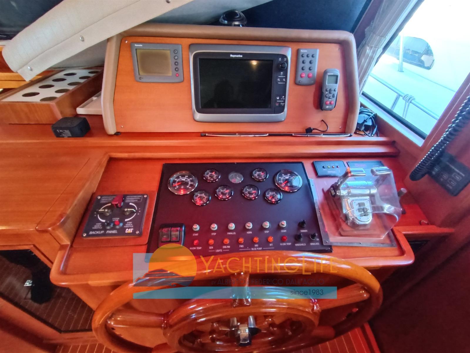 Engine Alarm, Bilge Alarm, Water pressure pump, Deck Shower, Twin Steering, Directional Spotlight, Hydraulic Flaps, Davits for tender on fly, Flaps Indicators, Courtesy Lights, Gangway, Automatic Bilge Pump, Teak Cockpit, Shorepower connector, Electric Windlass, swimming ladder, cockpit table, Horn, Stern Winches.