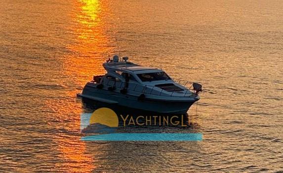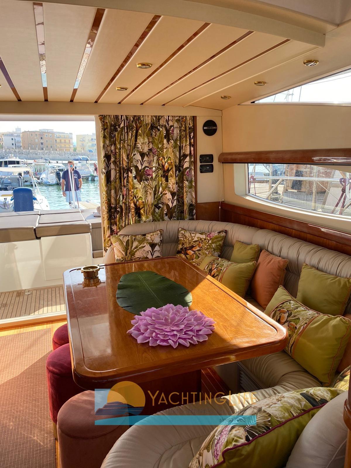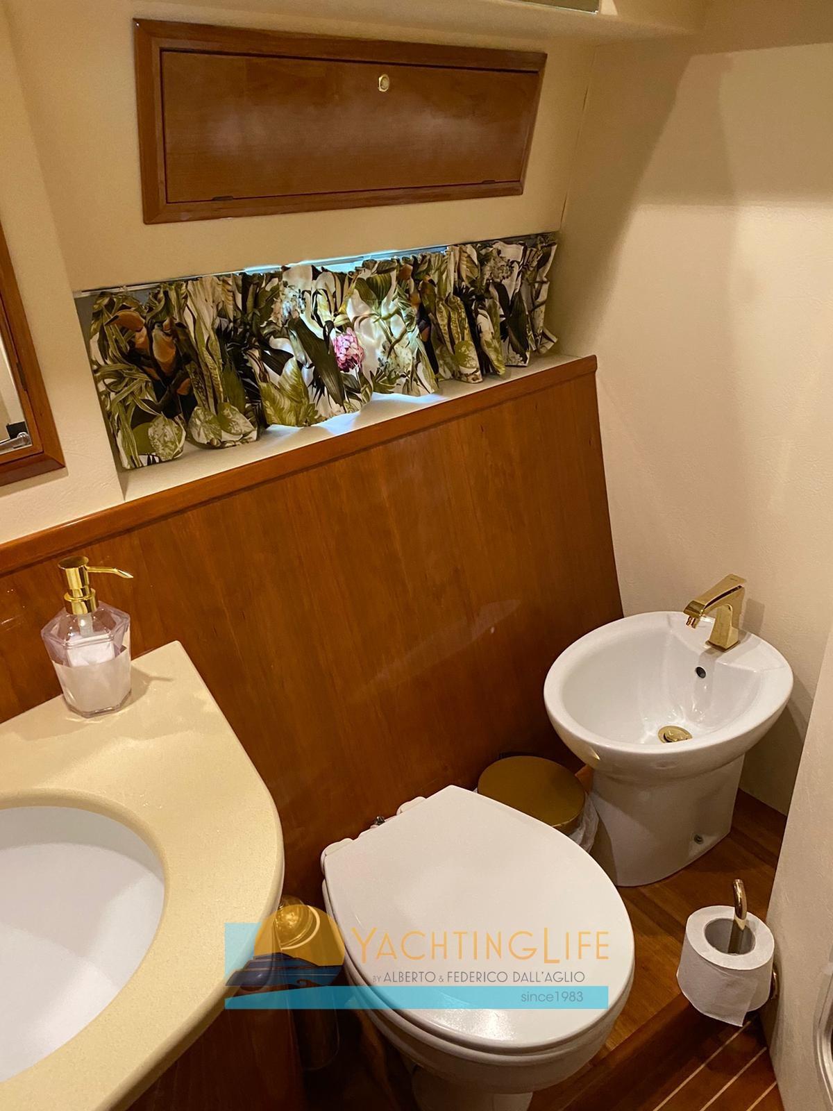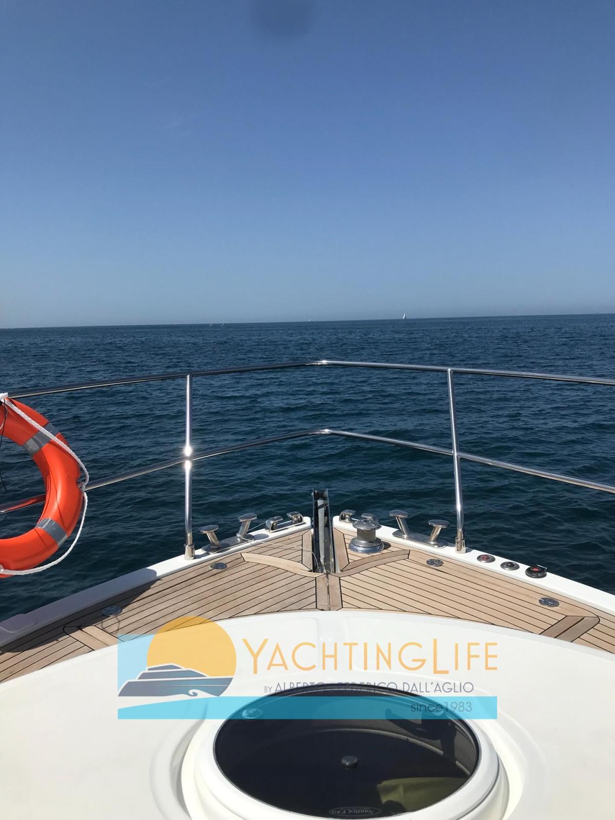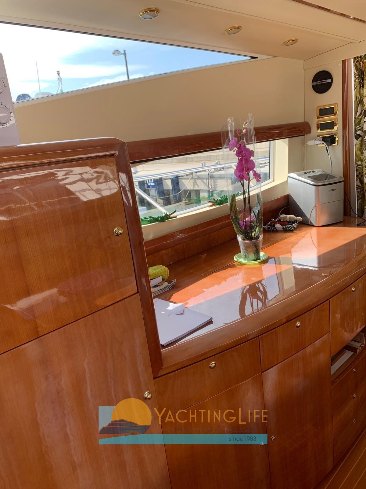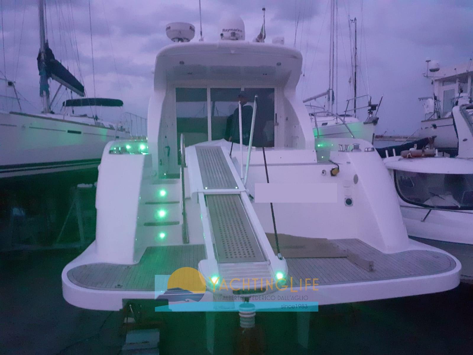 Engine Alarm, Bilge Alarm, Water pressure pump, Teak Side Decks, Deck Shower, Hydraulic Flaps, Hard top, Fire Extinguishing System, Flaps Indicators, Courtesy Lights, Underwater lights, Gangway (idraulica), Platform, Automatic Bilge Pump, Teak Cockpit, Shorepower connector, Electric Windlass, swimming ladder (elettrica), cockpit table, Horn, Stern Winches.