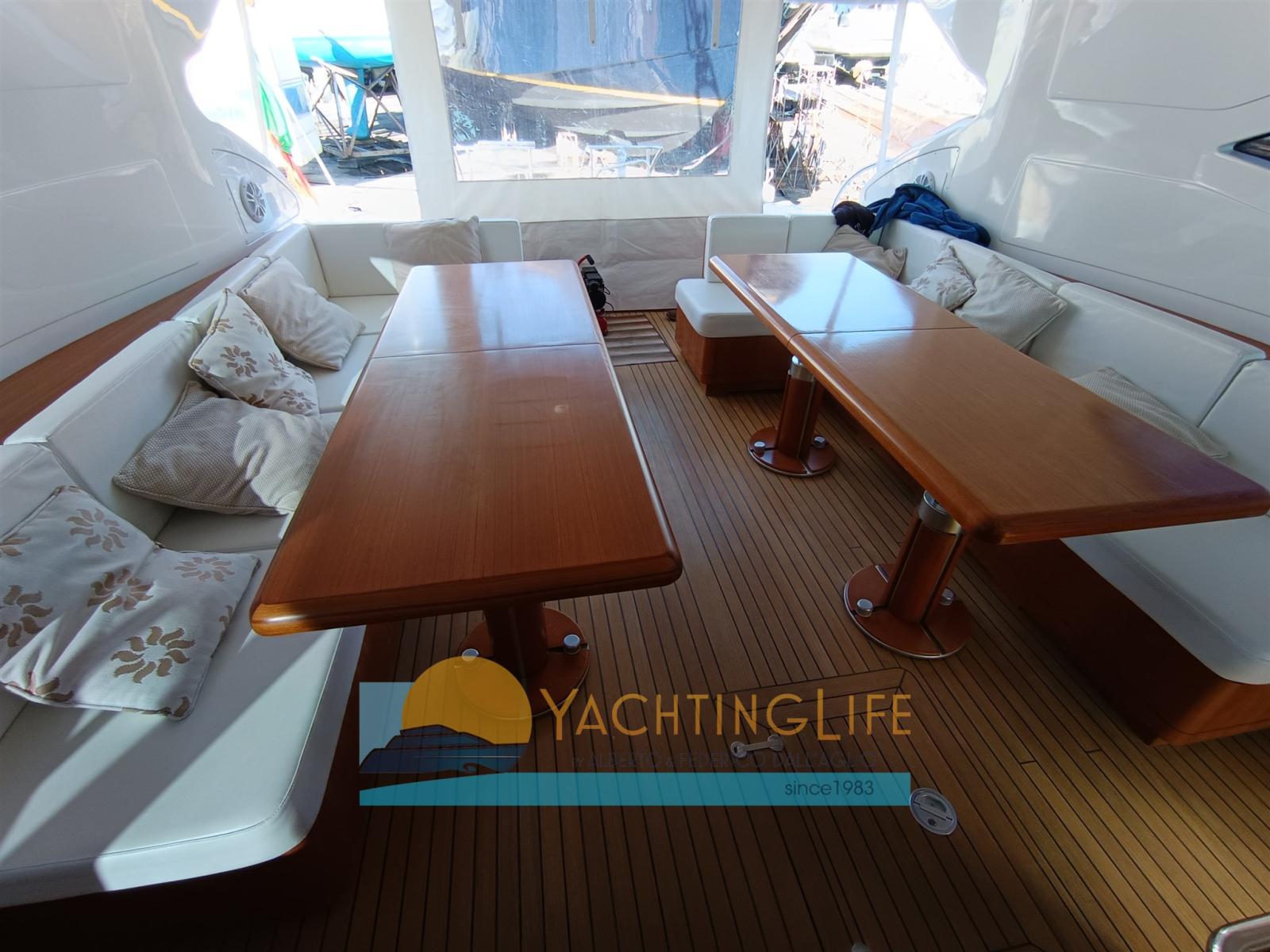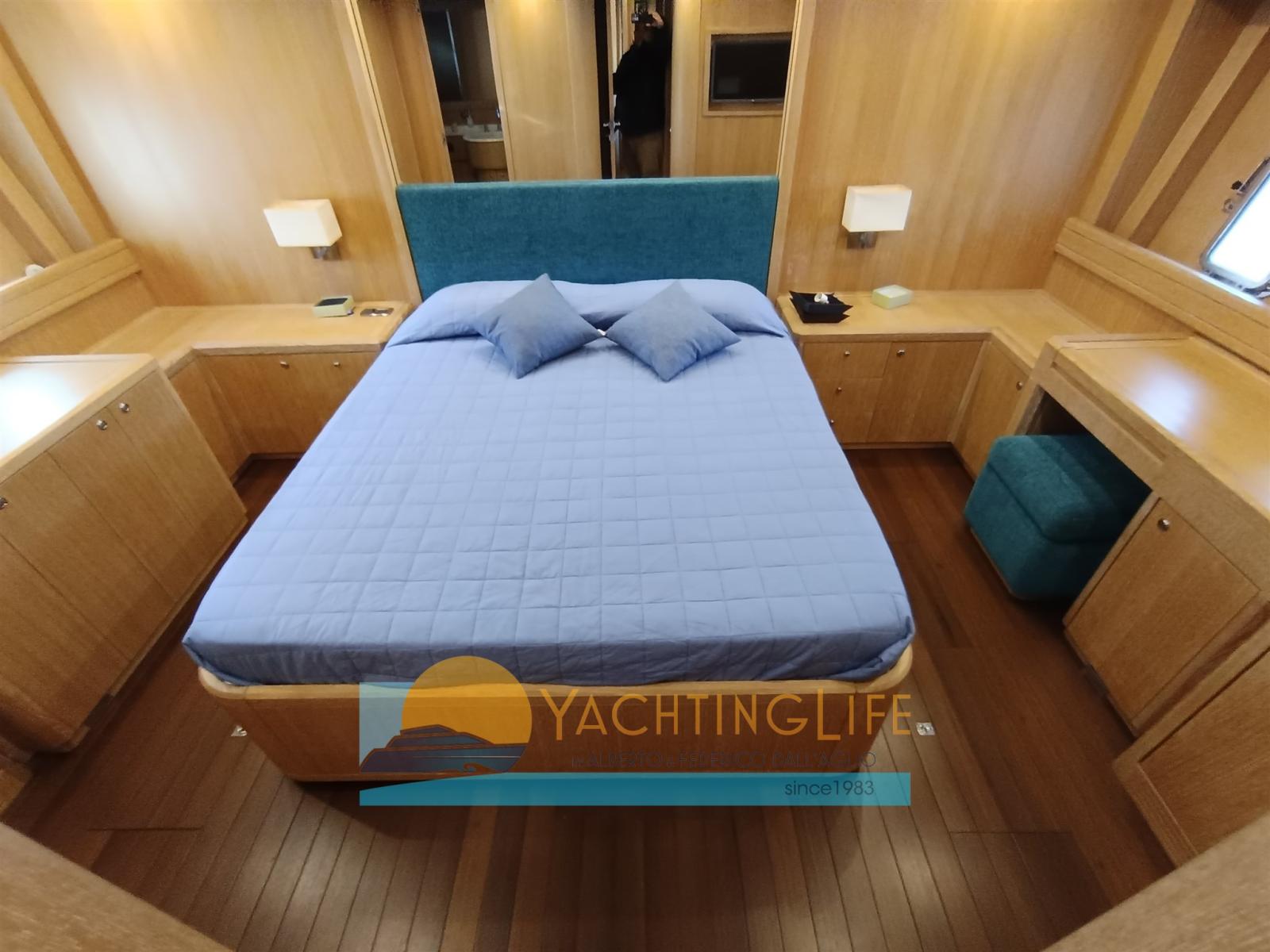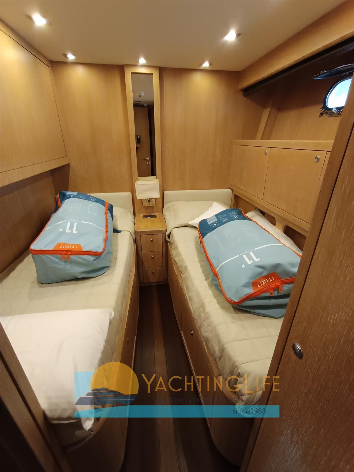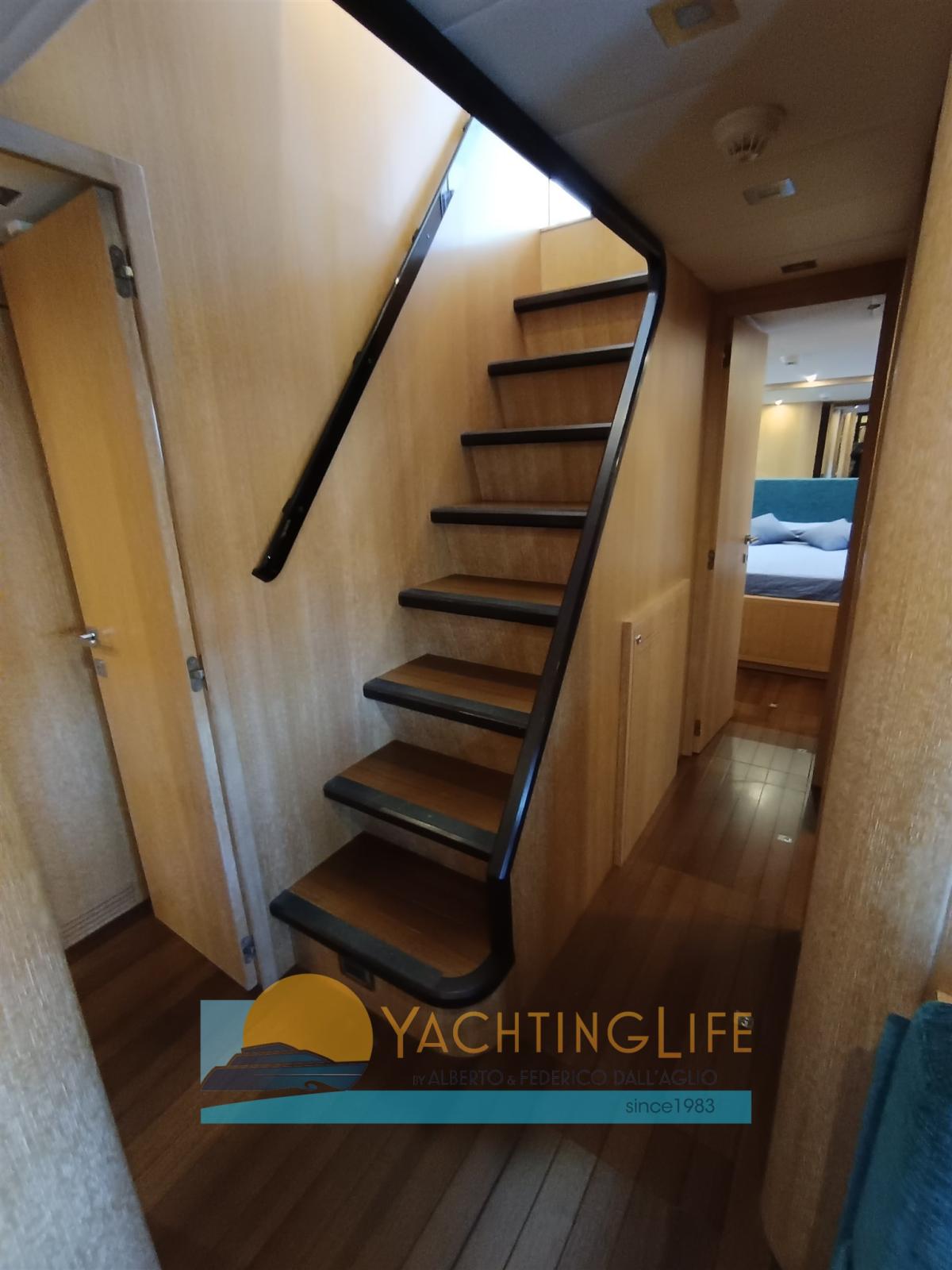 Engine Alarm, Bilge Alarm, Water pressure pump, 4 Battery charger (Nuovi), Deck Shower, Directional Spotlight, Hydraulic Flaps, Tender Garage, Hard top, Fire Extinguishing System, Flaps Indicators, Anchor Chain Washdown, Washbasin in the cockpit, Courtesy Lights, Gangway (Idrulica a scomparsa), Platform, Automatic Bilge Pump, Entry door, Teak Cockpit, Shorepower connector, Electric Windlass, swimming ladder (Elettrica), cockpit table, guard rails with gates, Horn, Stern Winches.