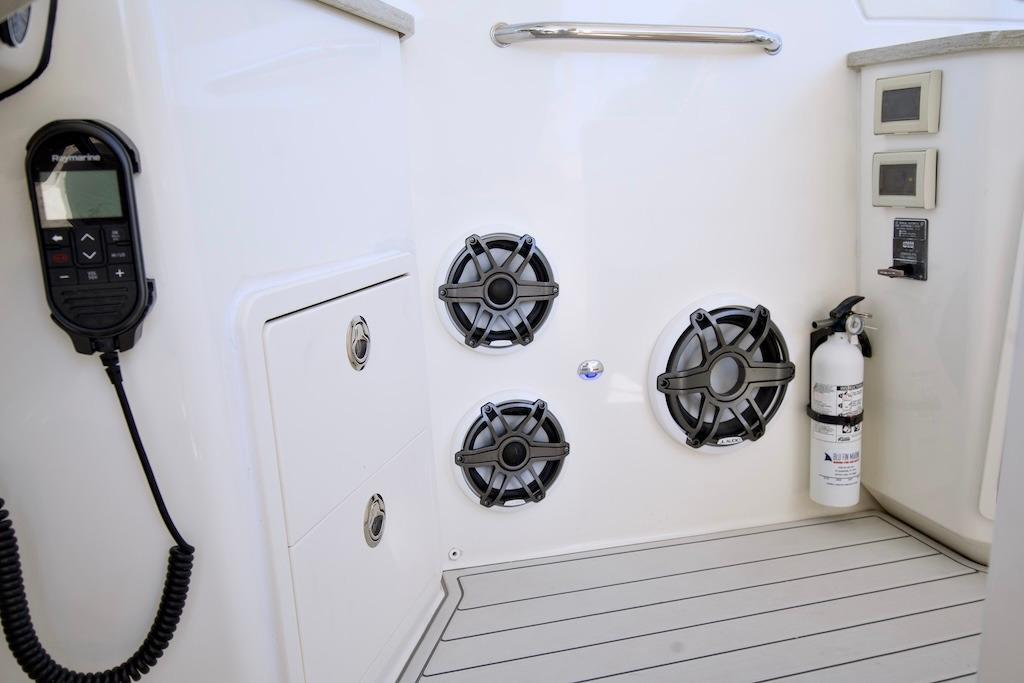 - Stereo – Fusion MS-BB300 (integrated into Raymarine with navigation package) – includes: Fusion Black Box stereo, AM/FM/VHF/MP3, USB Aux input, iPod/iPhone/Android compatible via integrated Bluetooth, Sirius XM option ready, stereo remote controls with LCD display providing full audio control from the cabin, helm and bow, JL Audio waterproof speakers (exterior, 6.5” aft cockpit (2), 7.7” at helm deck (2), 7.7” at bow (2), 10” sub-woofer at helm deck (1), 6.5” in cabin (2) with JL Audio amplifiers)
