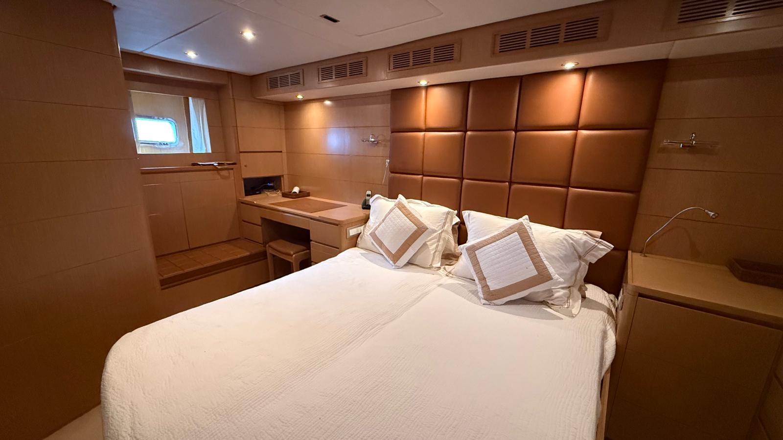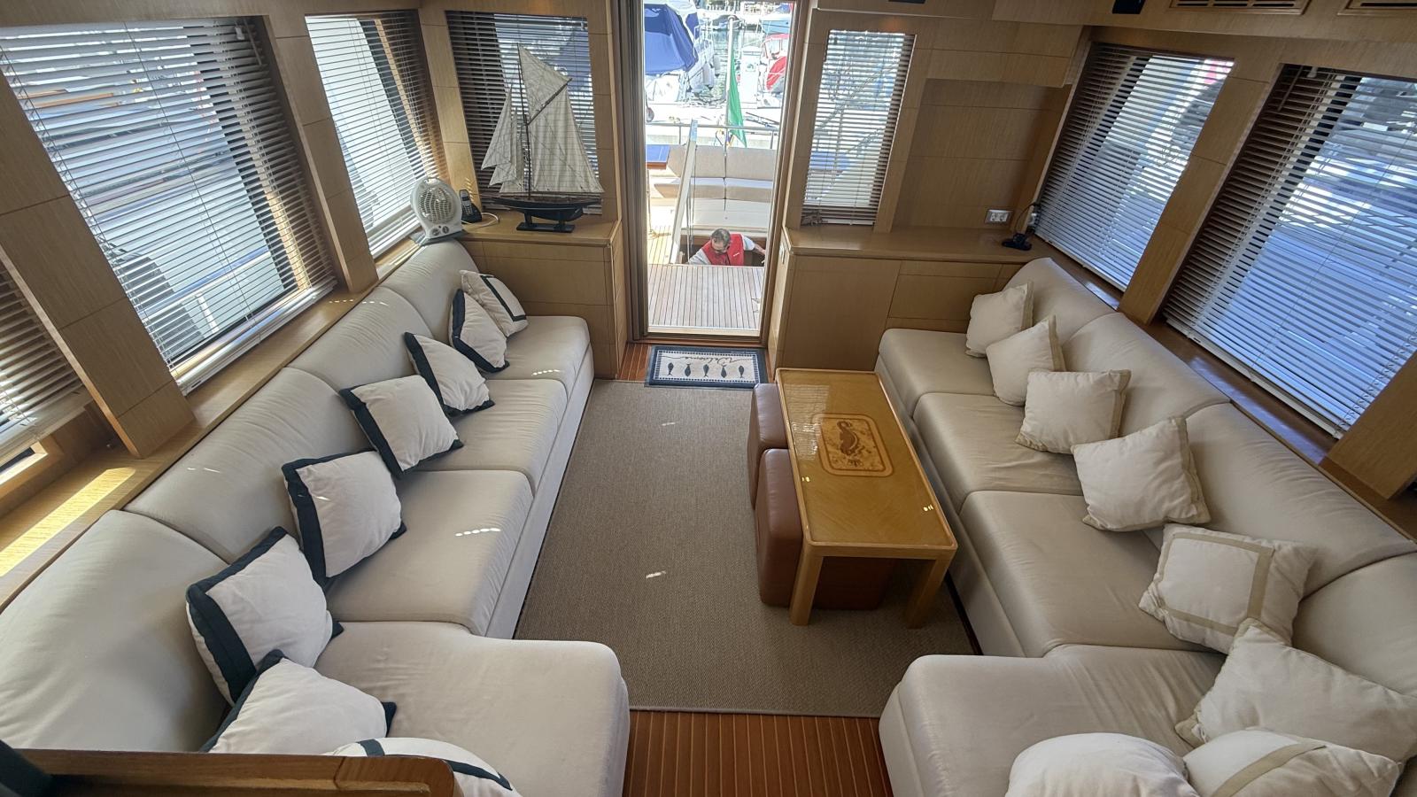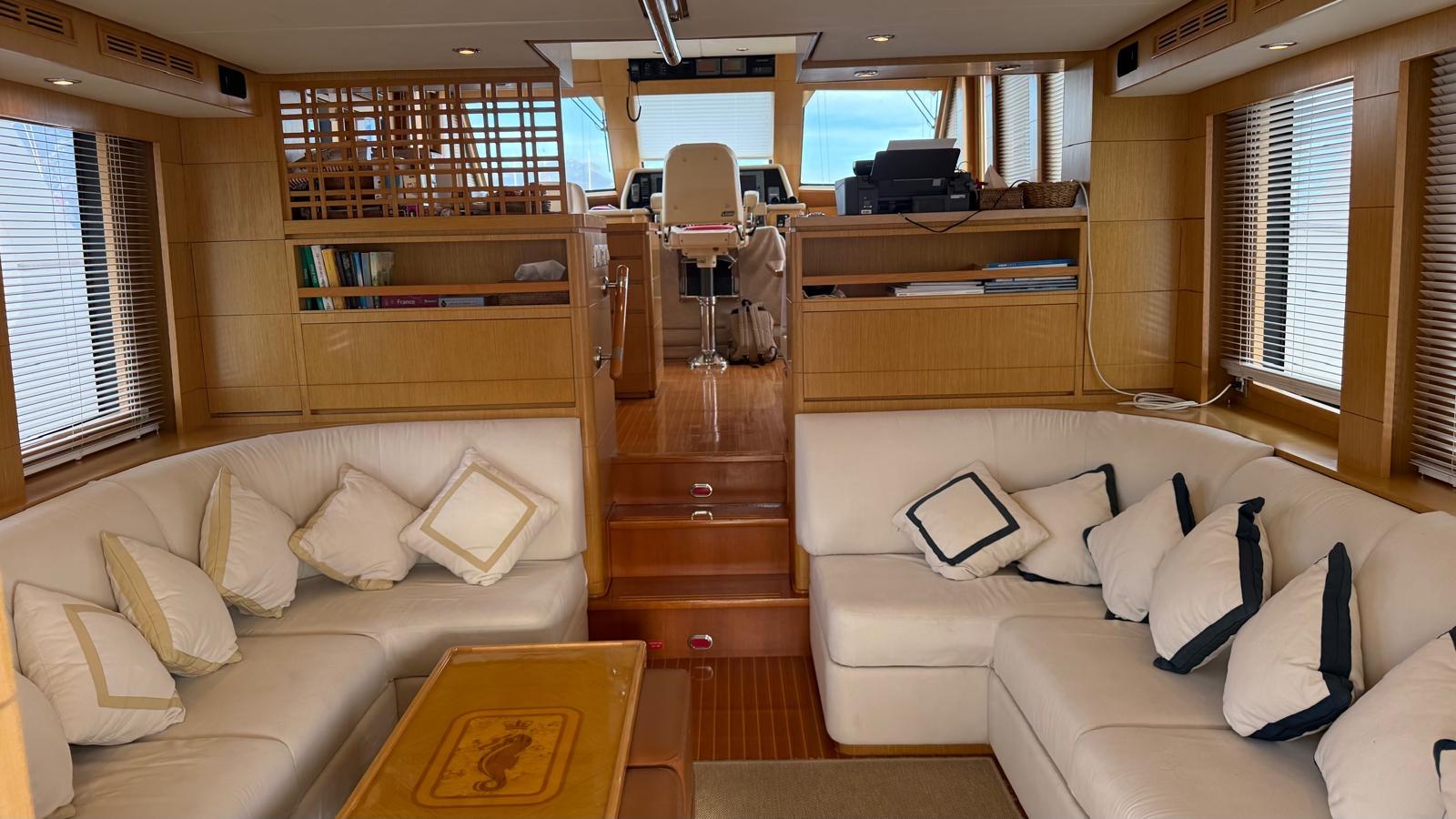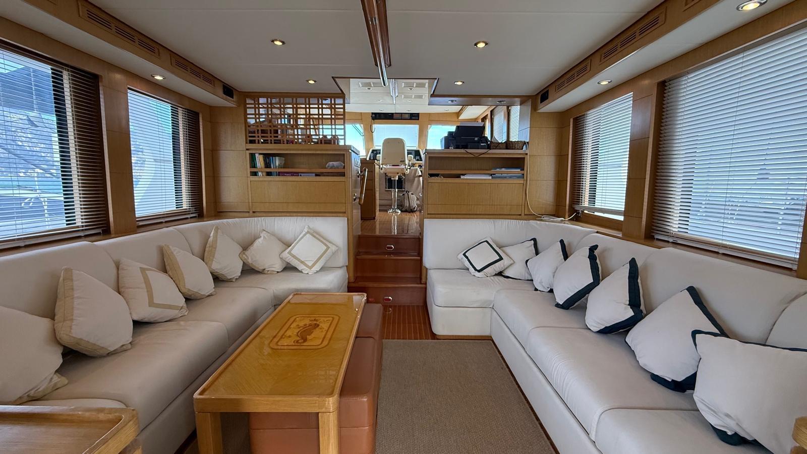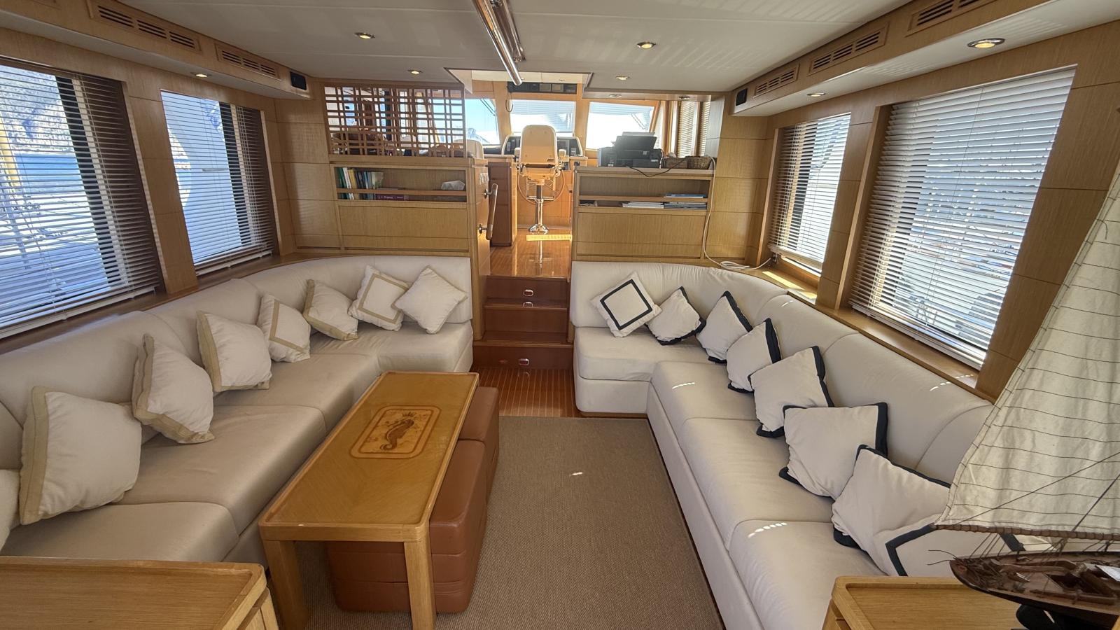 Her interior layout accommodates up to 6 guests in 3 staterooms, all with ensuite bathrooms. The full-beam master suite features custom joinery and exceptional comfort, complemented by a VIP stateroom and a guest cabin with twin berths. The two-level salon with raised pilothouse creates a bright and welcoming living space.