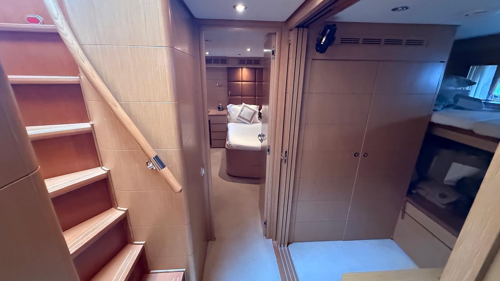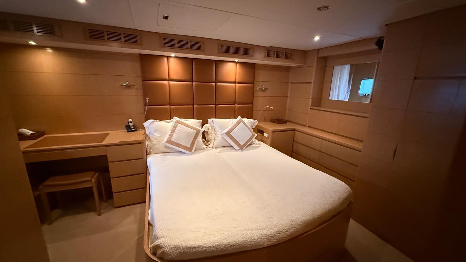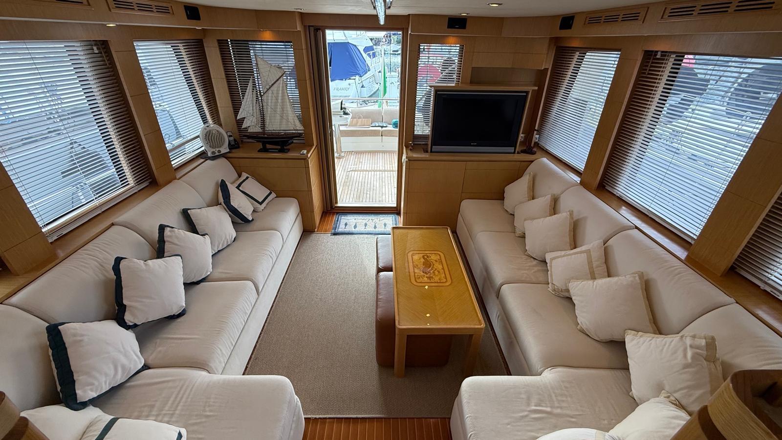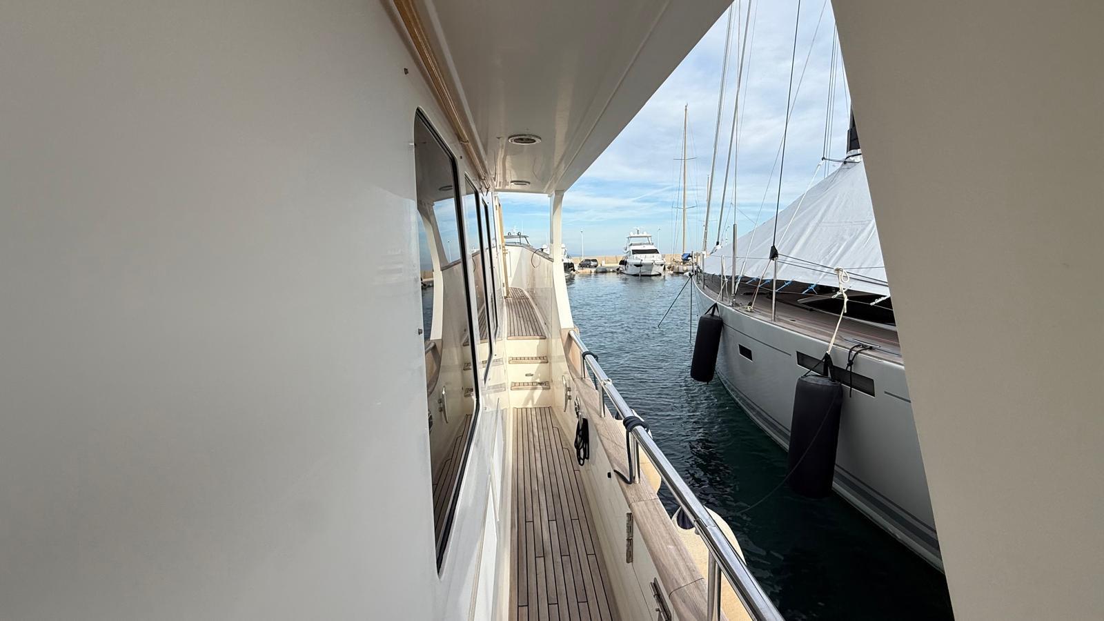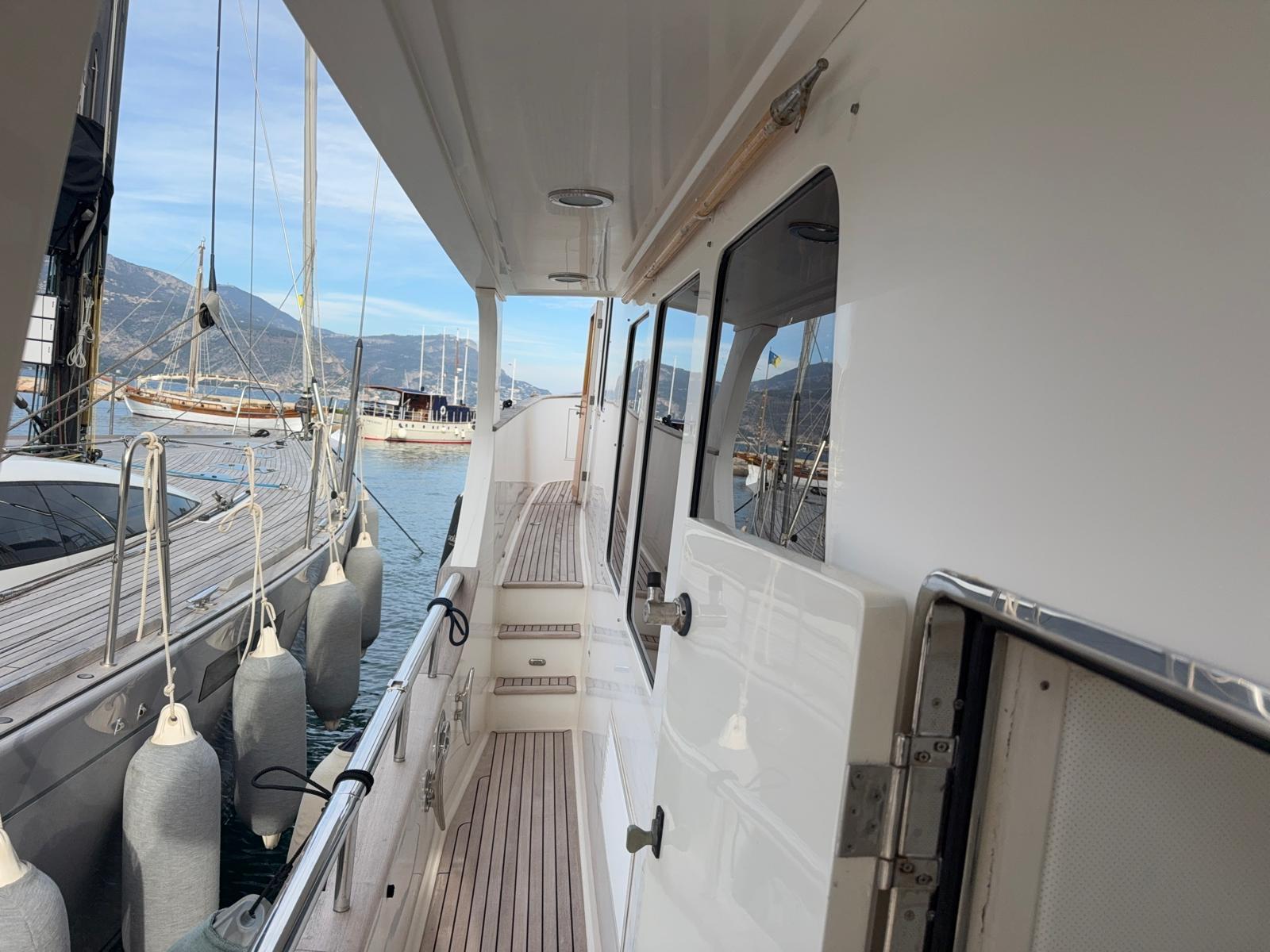 Her interior layout accommodates up to 6 guests in 3 staterooms, all with ensuite bathrooms. The full-beam master suite features custom joinery and exceptional comfort, complemented by a VIP stateroom and a guest cabin with twin berths. The two-level salon with raised pilothouse creates a bright and welcoming living space.