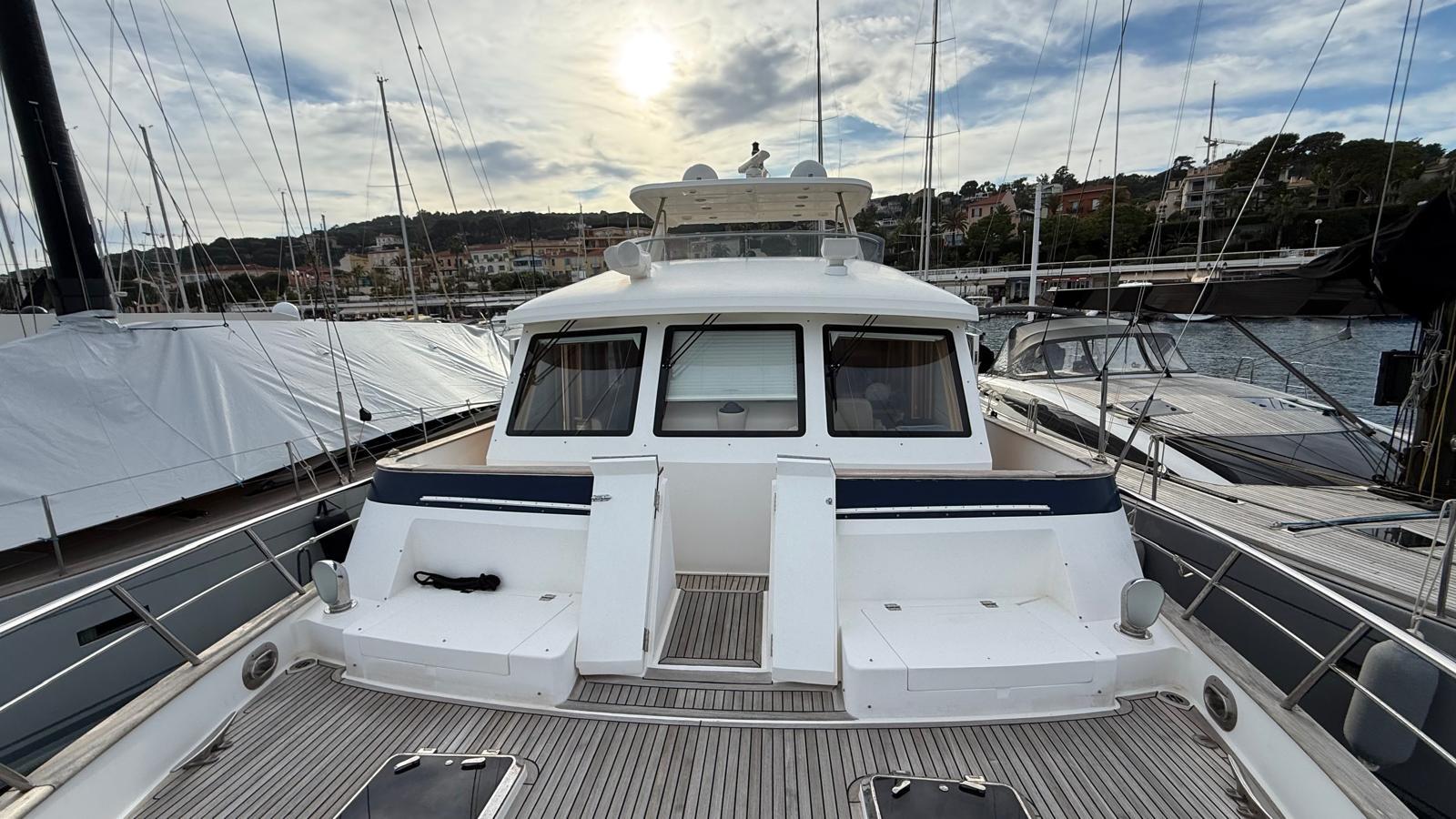 This Grand Banks 59 Aleutian RP stands out with her large panoramic windows that flood the interior with natural light. Her generous aft cockpit offers multiple spaces for relaxation and entertaining, while the spacious flybridge provides a second helm station, extensive sunbathing area and shaded dining zone under the bimini.