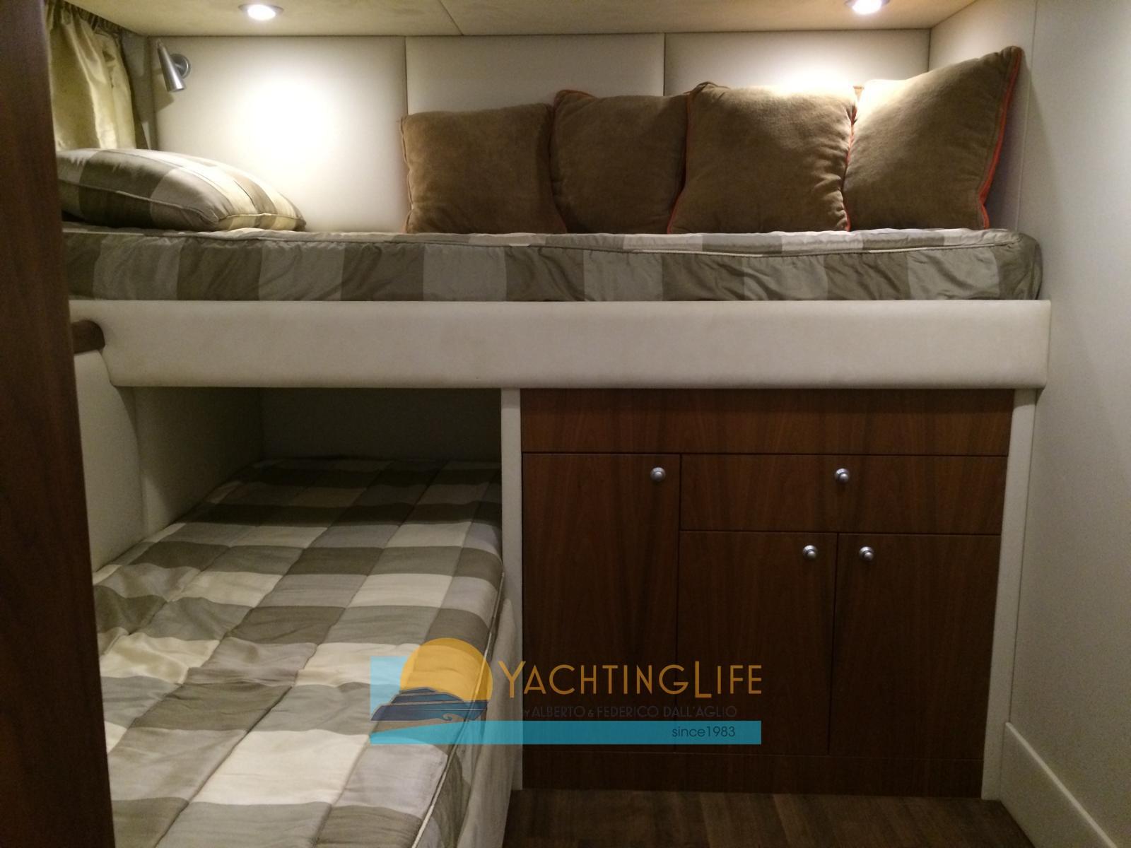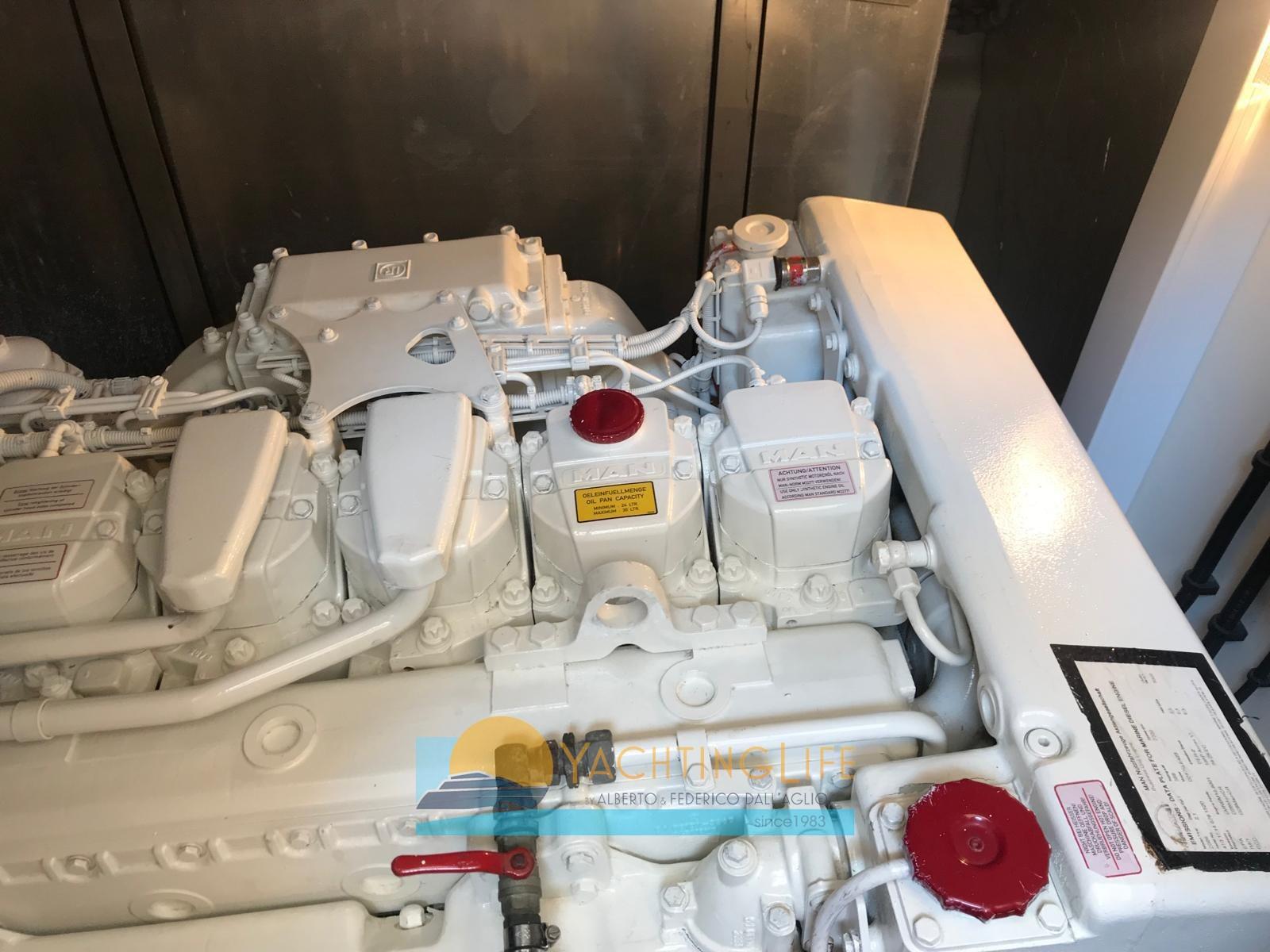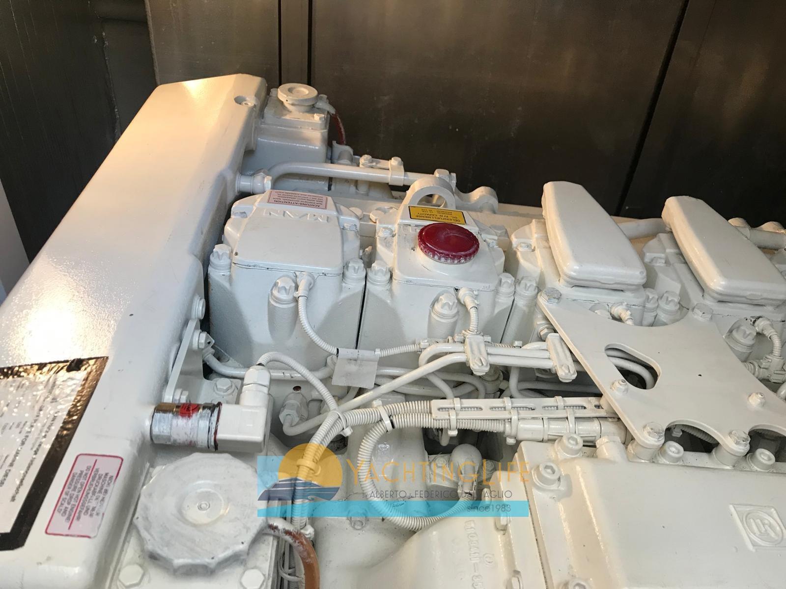 Engine Alarm, Bilge Alarm, Water pressure pump, Teak Side Decks, Deck Shower, Directional Spotlight, Hydraulic Flaps, Tender Garage, Hard top, Fire Extinguishing System, Flaps Indicators, Washbasin in the cockpit, Courtesy Lights, Underwater lights, Gangway (idraulica), Platform, Automatic Bilge Pump, Entry door, Teak Cockpit, Shorepower connector, Electric Windlass, swimming ladder, cockpit table, Tender (Williams 325), Horn, Stern Winches.