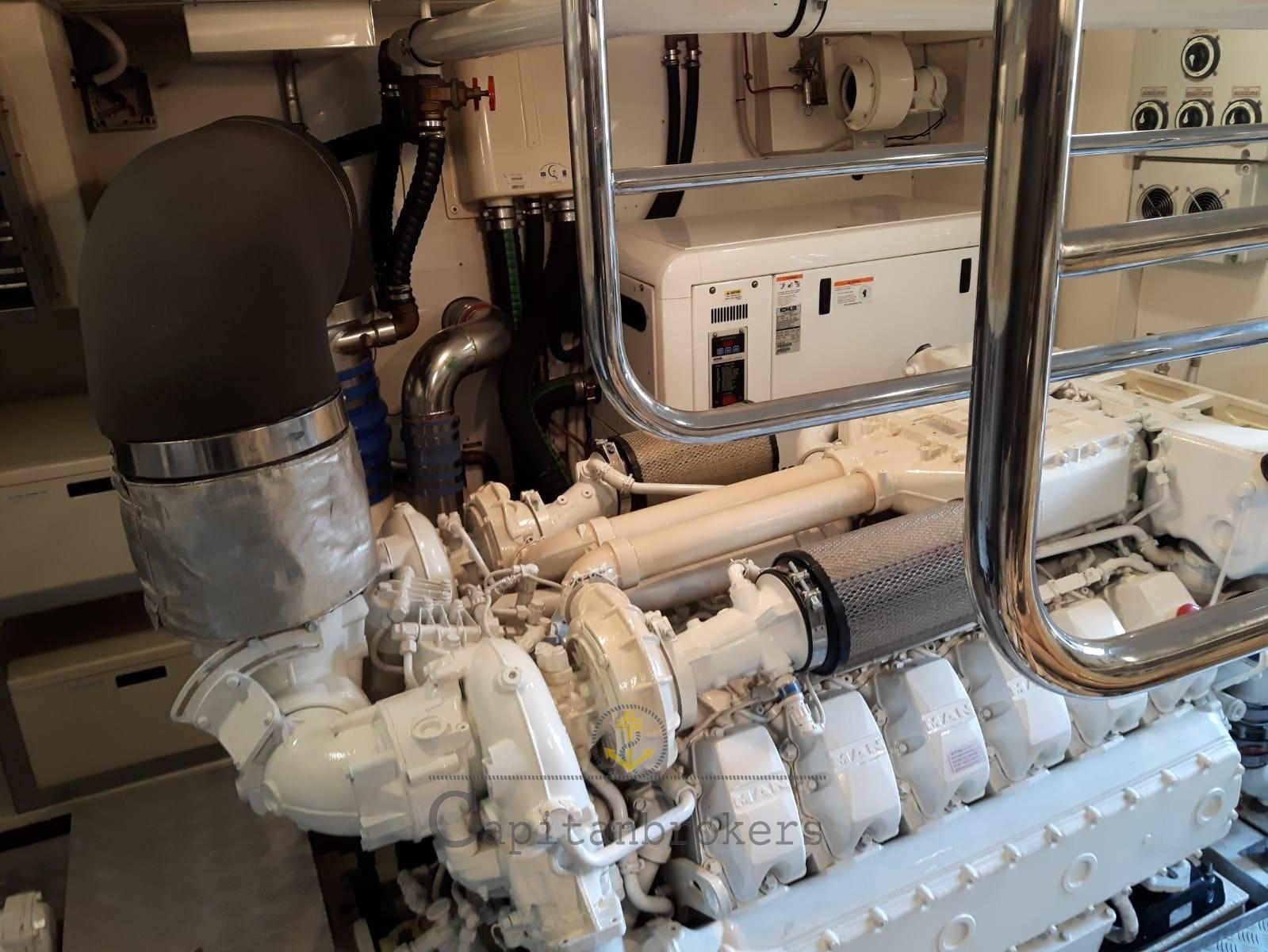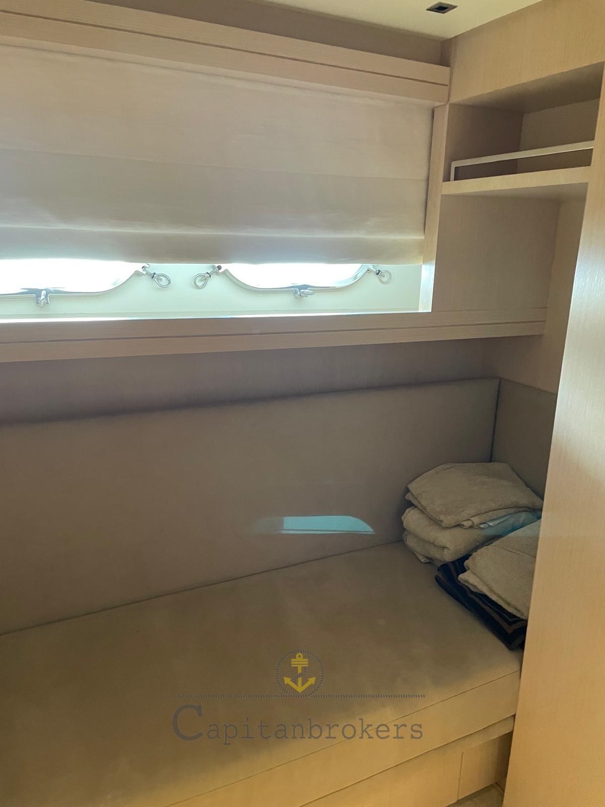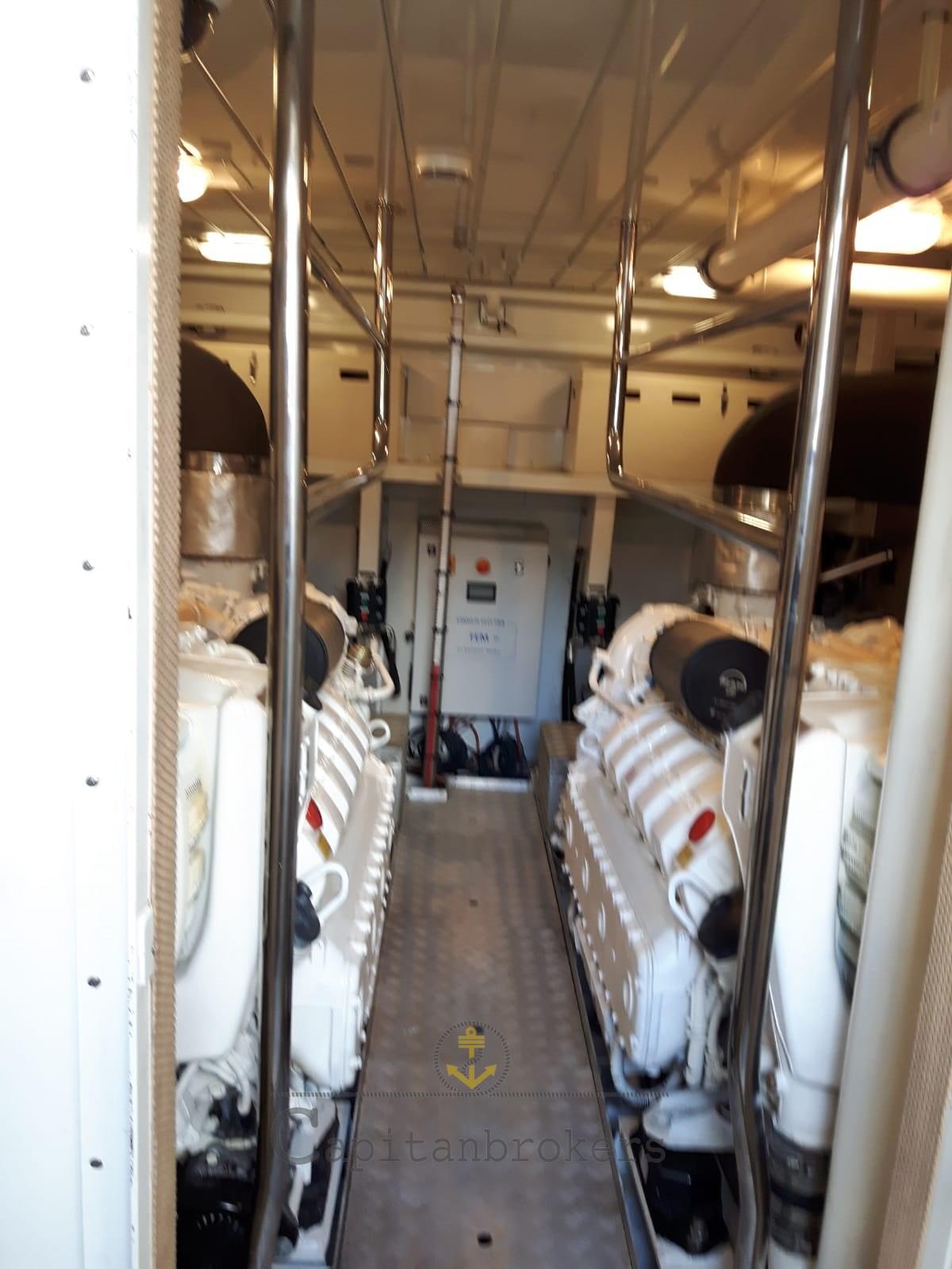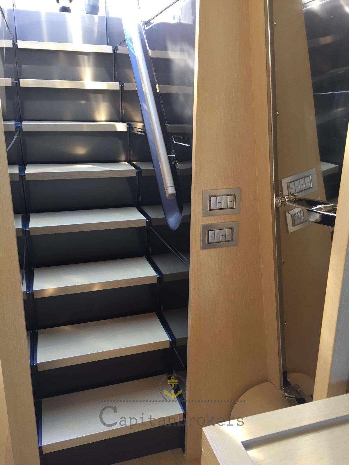 Engine Alarm, Bilge Alarm, Water pressure pump, Deck Shower, Twin Steering, Directional Spotlight, Electric Flaps, Crane, Davits for tender on fly, Fire Extinguishing System, Gangway, Platform, Automatic Bilge Pump, Side door, Teak Cockpit, Shorepower connector, Water harbor connector system, Electric Windlass, swimming ladder, Stabilizers (Pinne stabilizzatrici), cockpit table, Tender, Stern Winches, Bow Winches.