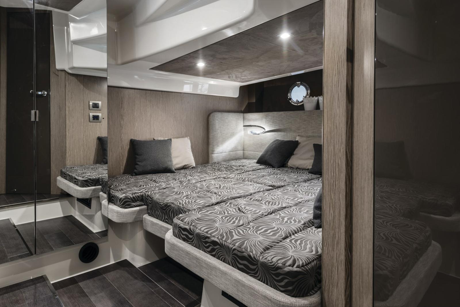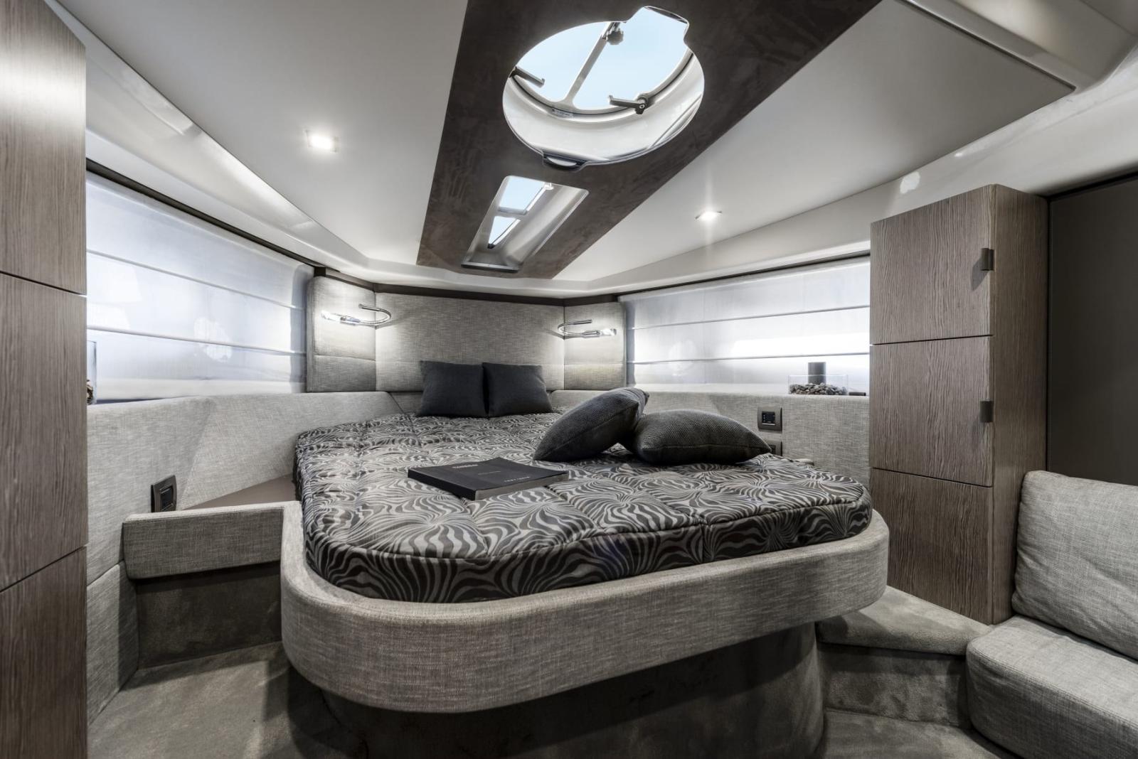 open in the bow, bluetooth/usb radio in the saloon with cockpit controls, 6 audio speakers + subwoofer,,